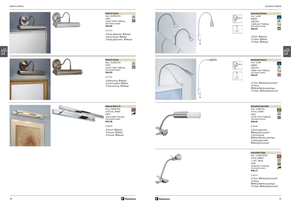 Galeria | Galeria Assistent | Galeria Galeria Canno max. 2×25 W, E14 230 V 3140 2350 1180 mm 38mm On/Off EAN 4000870 996898 996.89 On/Off 996.92 f Eisen gebürstet m Metall f Acier brossé m Métal f Staal geborsteld m Metaal f Titan m Metall f Titane m Métal f Titaan m Metaal 38mm On/Off EAN 4000870 996904 996.90 Assistent Natrix incl. 1×3 W 4000 K 230/12 V 3300 240 1100 mm LED On/Off EAN 4000870 996874 996.87 L 510.42 f Altmessing m Metall f Laiton patiné m Métal f Oud-messing m Metaal Galeria Osiris II incl. 2×60 W, R7s 2×971 lm, 2900 K 230 V 340 2500 1155 mm LED EAN 4000870 996928 L 510.42 Galeria Canno max. 2×25 W, E14 230 V 3140 2350 1180 mm Assistent Oculus incl. 1×3 W 6500 K 230/12 V 3300 ⌀40 1100 mm f Titan m Metall/Kunststoff f Titane m Métal/Matière plastique f Titaan m Metaal/Kunststof Halogen 230V R Assistent Gesa ESL incl. 1×9 W, E14 377 lm, 2700 K 230 V 3170 2115 1300 mm EAN 4000870 992883 EAN 4000870 996959 992.88 996.95 L 800.60 L 894.09 f Chrom m Metall f Chrome m Métal f Chroom m Metaal f Eisen gebürstet m Metall/Kunststoff f Acier brossé m Métal/Matière plastique f Staal geborsteld m Metaal/Kunststof Assistent Finja incl. 1×35 W, GU10 172 lm, 2900 K 5 30°, 700 cd 230 V 3330 ⌀51 2115 mm EAN 4000870 998212 998.21 Energy Saver On/Off Halogen 230V On/Off R L 836.34 f Titan m Metall/Kunststoff f Titane m Métal/Matière plastique f Titaan m Metaal/Kunststof 78 79