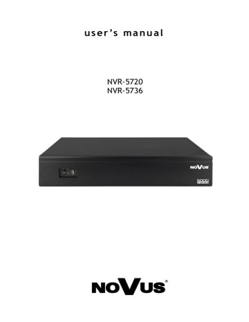 u s e r ’s m a n u a l NVR-5720 NVR-5736 NVR-5720, NVR-5736 User’s manual ver.1.0 IMPORTANT SAFEGUARDS AND WARNINGS EMC (2004/108/EC) and LVD (2006/95/EC ) Directives CE Marking Our products are manufactured to comply with requirements of following directives and national regulations implementing the directives: Electromagnetic compatibility EMC 2004/108/EC. Low voltage LVD 2006/95/EC with further amendment. The Directive applies to electrical equipment designed for use with a voltage rating of between 50VAC and 1000VAC as well as 75VDC and 1500VDC. WEEE Directive 2002/96/EC Information on Disposal for Users of Waste Electrical and Electronic Equipment This appliance is marked according to the European Directive on Waste Electrical and Electronic Equipment (2002/96/EC) and further amendments. By ensuring this product is disposed of correctly, you will help to prevent potential negative consequences for the environment and human health, which could otherwise be caused by inappropriate waste handling of this product. The symbol on the product, or the documents accompanying the product, indicates that this appliance may not be treated as household waste. It shall be handed over to the applicable collection point for the waste electrical and electronic equipment for recycling purpose. For more information about recycling of this product, please contact your local authorities, your household waste disposal service or the shop where you purchased the product. RoHS Directive 2002/95/EC Concerning for human health protection and friendly environment, we assure that our products falling under RoHS Directive regulations, regarding the restriction of the use of hazardous substances in electrical and electronic equipment, were designed and manufactured in compliance with mentioned regulation. Simultaneously, we claim that our products were tested and do not contain hazardous substances exceeding limits which could have negative impact on human health or natural environment. Information The device, as a part of professional CCTV system used for surveillance and control, is not designed for self installation in households by individuals without technical knowledge. The manufacturer is not responsible for defects and damages resulted from improper or inconsistent with user’s manual installation of the device in the system. ATTENTION! PRIOR TO UNDERTAKING ANY ACTION THAT IS NOT PROVISIONED FOR THE GIVEN PRODUCT IN ITS USER’S MANUAL AND OTHER DOCUMENTS DELIVERED WITH THE PRODUCT, OR THAT ARISES FROM THE NORMAL APPLICATION OF THE PRODUCT, ITS MANUFACTURER MUST BE CONTACTED OR THE RESPONSIBILITY OF THE MANUFACTURER FOR THE RESULTS OF SUCH AN ACTION SHELL BE EXCLUDED. All rights reserved © AAT Holding sp. z o.o. 2 NVR-5720, NVR-5736 User’s manual ver.1.0 IMPORTANT SAFEGUARDS AND WARNINGS 1. Prior to undertaking any action please consult the following manual and read all the safety and operating instructions before starting the device. 2. Please keep this manual for the lifespan of the device in case referring to the contents of this manual is necessary; 3. All the safety precautions referred to in this manual should be strictly followed, as they have a direct influence on user’s safety and durability and reliability of the device; 4. All actions conducted by the servicemen and users must be accomplished in accordance with the user’s manual; 5. The device should be disconnected from power sources during maintenance procedures; 6. Usage of additional devices and components neither provided nor recommended by the producer is forbidden; 7. You are not allowed to use the device in high humidity environment (i.e. close to swimming pools, bath tubs, damp basements); 8. Mounting the device in places where proper ventilation cannot be provided (e. g. closed lockers etc.) is not recommended since it may lead to heat build-up and damaging the device itself as a consequence; 9. Mounting the device on unstable surface or using not recommended mounts is forbidden. Improperly mounted device may cause a fatal accident or may be seriously damaged itself. The device must be mounted by qualified personnel with proper authorization, in accordance with this user’s manual. 10. Device should be supplied only from a power sources whose parameters are in accordance with those specified by the producer in the devices technical datasheet. Therefore, it is forbidden to supply the devices from a power sources with unknown parameters, unstable or not meeting producer’s requirements; 11. You cannot allow any metal objects get inside the recorder. It might cause serious damage. If a metal object gets inside the device contact the authorised Novus service immediately. 12. The manufacturer does not bear responsibility for damage or loss of data stored on HDDs or other media occurred during the usage of the product. Due to the product being constantly enhanced and optimized, certain parameters and functions described in the manual in question may change without further notice. We strongly suggest visiting the www.novuscctv.com website in order to access the newest manual . Technical changes reserved without prior notice and printing errors possible. All rights reserved © AAT Holding sp. z o.o. 3 NVR-5720, NVR-5736 User’s manual ver.1.0 TABLE OF CONTENTS TABLE OF CONTEST ............................................................................................. 4 1. FOREWORD INFORMATION ........................................................................ ..6 1.1. Network recorder’s technical data .................................................................. 6 1.2. Main characteristic ....................................................................................... ...7 1.3. Package contents ............................................................................................. 7 2. STARTING THE DEVICE .................................................................................. 8 2.1. Electr
