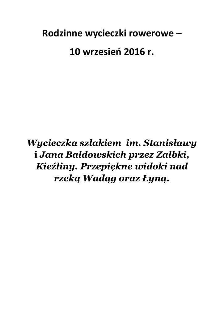 Rodzinne wycieczki rowerowe – 10 wrzesień 2016 r. Wycieczka szlakiem im. Stanisławy i Jana Bałdowskich przez Zalbki, Kieźliny. Przepiękne widoki nad rzeką Wadąg oraz Łyną.
