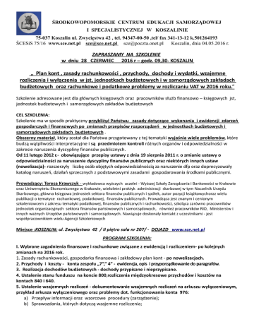 ŚRODKOWOPOMORSKIE CENTRUM EDUKACJI SAMORZĄDOWEJ I SPECJALISTYCZNEJ W KOSZALINIE 75-037 Koszalin ul. Zwycięstwa 42 , tel. 94347-00-50 ,tel/ fax 341-13-12 k.501264193 ŚCESiS 75/16 www.sce.net.pl [email protected] [email protected] Koszalin, dnia 04.05.2016 r. ZAPRASZAMY NA SZKOLENIE w dniu 28 CZERWIEC 2016 r – godz. 09,30- KOSZALIN „ Plan kont , zasady rachunkowości , przychody, dochody i wydatki, wzajemne rozliczenia i wyłączenia w jst, jednostkach budżetowych i w samorządowych zakładach budżetowych oraz rachunkowe i podatkowe problemy w rozliczaniu VAT w 2016 roku.” Szkolenie adresowane jest dla głównych księgowych oraz pracowników służb finansowo – księgowych jst, jednostek budżetowych i samorządowych zakładów budżetowych CEL SZKOLENIA: Szkolenie ma w sposób praktyczny przybliżyć Państwu zasady dotyczące wykonania i ewidencji zdarzeń gospodarczych i finansowych po zmianach przepisów rozporządzeń w jednostkach budżetowych i samorządowych zakładach budżetowych . Obszerny materiał, który został dla Państwa przygotowany z tej tematyki wyjaśnia wiele problemów, które budzą wątpliwości interpretacyjne i są przedmiotem kontroli różnych organów i odpowiedzialności w zakresie naruszenia dyscypliny finansów publicznych. Od 11 lutego 2012 r.- obowiązujące przepisy ustawy z dnia 19 sierpnia 2011 r. o zmianie ustawy o odpowiedzialności za naruszenie dyscypliny finansów publicznych oraz niektórych innych ustaw (nowelizacja)- rozszerzyły liczbę osób objętych odpowiedzialnością za naruszenie dfp oraz doprecyzowały katalog naruszeń, działań sprzecznych z podstawowymi zasadami gospodarowania środkami publicznymi. Prowadzący: Teresa Krawczyk - wykładowca wyższych uczelni - Wyższej Szkoły Zarządzania i Bankowości w Krakowie oraz Uniwersytetu Ekonomicznego w Krakowie, wieloletni praktyk administracji skarbowej w tym Naczelnik Urzędu Skarbowego, główna księgowa jednostek sektora finansów publicznych i spółek, autor pozycji książkowychoraz wielu publikacji o tematyce rachunkowej, podatkowej, finansów publicznych. Prowadząca jest znanym i cenionym szkoleniowcem z zakresu tematyki podatkowej, finansów publicznych i rachunkowości, szkoląca zarówno pracowników jednostek organizacyjnych sektora finansów państwowych i samorządowych, również pracowników RIO, Ministerstw i innych ważnych Urzędów państwowych i samorządowych. Nawiązuje doskonały kontakt z uczestnikami - jest współpracownikiem wielu Agencji Szkoleniowych Miejsce :KOSZALIN: ul. Zwycięstwa 42 / II piętro sala nr 207/ - DOJAZD www.sce.net.pl PROGRAM SZKOLENIA: I. Wybrane zagadnienia finansowe i rachunkowe związane z ewidencją i rozliczeniem- po kolejnych zmianach na 2016 rok. 1. Zasady rachunkowości, gospodarka finansowa i zakładowy plan kont - po nowelizacjach. 2. Przychody i koszty - konta zespołu „7”,” 4” - ewidencja, opis i przyporządkowanie do paragrafów. 3. Realizacja dochodów budżetowych - dochody przypisane i nieprzypisane. 4. Ustalenie stanu funduszu na koncie 800,rozliczenia międzyokresowe przychodów i kosztów na kontach 840 i 640. 5. Ustalenie wzajemnych rozliczeń - dokumentowanie wzajemnych rozliczeń na arkuszu wyłączeniowym, przykład arkusza wyłączeniowego oraz problemy dot. funkcjonowania konta 976: a) Przepływ informacji oraz wzorcowe procedury (zarządzenie); b) Sprawozdania, których dotyczą wzajemne rozliczenia; c) Ewidencja księgowa na koncie 976 w urzędzie i jednostce. 6. Aktualizacja należności budżetowych - zasady dokonywania odpisów aktualizujących należności i ich ewidencja: a) Rozrachunki i rozliczenia; b) Odsetki od nieterminowych spłat należności - ewidencja księgowa; c) Odpisy aktualizacyjne należności i odsetki- konto bilansowe 290 po zmianie przepisów. 7. Finansowanie inwestycji, zakupów inwestycyjnych, pozostałych środków trwałych, wartości niematerialnych i prawnych , remontów- zasady i tryb gospodarowania, finansowania oraz ewidencjonowania: ● ewidencja księgowa - zasady funkcjonowania kont: 011,013,020, 080, 400, 740, 800, 810, II. Wybrane zagadnienia finansowe i rachunkowe związane z ewidencją i rozliczeniem podatku VAT: 1. Podatek VAT- po zmianach w 2016 roku- proporcja i prewspółczynnik. 2. VAT od inwestycji, środków trwałych i wartości niematerialnych i prawnych - ewidencja i rozliczenie. Uczestnicy otrzymują zaświadczenie o ukończeniu szkolenia. Odpłatność : 330,00 zł od osoby - płatne przelewem 7 DNI od otrzymania rachunku . W cenie zapewniamy: catering oraz materiały szkoleniowe. Zgłoszenie na szkolenie prosimy wypełnić i przesłać faxem /tel/fax 94-341-13-12. Zgłaszając uczestnictwo faxem prosimy o potwierdzenie telefoniczne. W przypadku nie zebrania odpowiedniej ilości osób organizator zastrzega sobie prawo odwołania szkolenia lub zmiany terminu. DYREKTOR Andrzej Urbanek Z G Ł O S Z E N I E –„ PLAN KONT PO NOWELIZACJI .” -28.06.2016 r –g.09.30 KOSZALIN KARTA ZGŁOSZENIOWA - DANE DO WYSTAWIENIA FAKTURY /NAZWA,ADRES ,NIP/ ................................................................................................................................................. NIP ...................................................... TEL. ................................................ 1. ......................................................................................... .................................................. /imię i nazwisko/ /stanowisko/ 2. ............................................................................................................................................... /wpisać pismem drukowanym / Należność w wysokości ............... złotych za szkolenie przekażemy gotówką/przelewem/ na konto: PKO BP SA 26 1020 2791 0000 7802 0233 7533. Przyjmujemy do wiadomości, że nie zgłoszenie rezygnacji pisemnej ze szkolenia na 4 dni robocze przed terminem spowoduje obciążenie zgłaszają