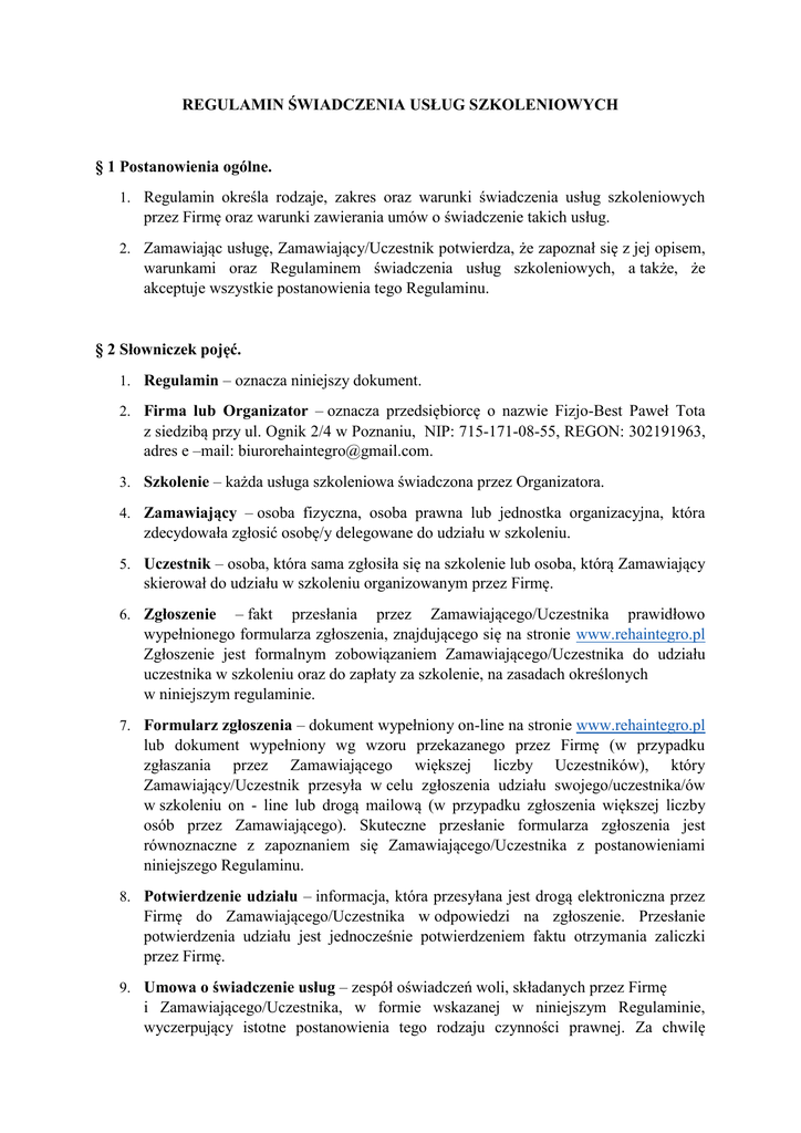 REGULAMIN ŚWIADCZENIA USŁUG SZKOLENIOWYCH § 1 Postanowienia ogólne. 1. Regulamin określa rodzaje, zakres oraz warunki świadczenia usług szkoleniowych przez Firmę oraz warunki zawierania umów o świadczenie takich usług. 2. Zamawiając usługę, Zamawiający/Uczestnik potwierdza, że zapoznał się z jej opisem, warunkami oraz Regulaminem świadczenia usług szkoleniowych, a także, że akceptuje wszystkie postanowienia tego Regulaminu. § 2 Słowniczek pojęć. 1. Regulamin – oznacza niniejszy dokument. 2. Firma lub Organizator – oznacza przedsiębiorcę o nazwie Fizjo-Best Paweł Tota z siedzibą przy ul. Ognik 2/4 w Poznaniu, NIP: 715-171-08-55, REGON: 302191963, adres e –mail: [email protected]. 3. Szkolenie – każda usługa szkoleniowa świadczona przez Organizatora. 4. Zamawiający – osoba fizyczna, osoba prawna lub jednostka organizacyjna, która zdecydowała zgłosić osobę/y delegowane do udziału w szkoleniu. 5. Uczestnik – osoba, która sama zgłosiła się na szkolenie lub osoba, którą Zamawiający skierował do udziału w szkoleniu organizowanym przez Firmę. 6. Zgłoszenie – fakt przesłania przez Zamawiającego/Uczestnika prawidłowo wypełnionego formularza zgłoszenia, znajdującego się na stronie www.rehaintegro.pl Zgłoszenie jest formalnym zobowiązaniem Zamawiającego/Uczestnika do udziału uczestnika w szkoleniu oraz do zapłaty za szkolenie, na zasadach określonych w niniejszym regulaminie. 7. Formularz zgłoszenia – dokument wypełniony on-line na stronie www.rehaintegro.pl lub dokument wypełniony wg wzoru przekazanego przez Firmę (w przypadku zgłaszania przez Zamawiającego większej liczby Uczestników), który Zamawiający/Uczestnik przesyła w celu zgłoszenia udziału swojego/uczestnika/ów w szkoleniu on - line lub drogą mailową (w przypadku zgłoszenia większej liczby osób przez Zamawiającego). Skuteczne przesłanie formularza zgłoszenia jest równoznaczne z zapoznaniem się Zamawiającego/Uczestnika z postanowieniami niniejszego Regulaminu. 8. Potwierdzenie udziału – informacja, która przesyłana jest drogą elektroniczna przez Firmę do Zamawiającego/Uczestnika w odpowiedzi na zgłoszenie. Przesłanie potwierdzenia udziału jest jednocześnie potwierdzeniem faktu otrzymania zaliczki przez Firmę. 9. Umowa o świadczenie usług – zespół oświadczeń woli, składanych przez Firmę i Zamawiającego/Uczestnika, w formie wskazanej w niniejszym Regulaminie, wyczerpujący istotne postanowienia tego rodzaju czynności prawnej. Za chwilę zawarcia umowy uznaje się przesłanie Zamawiającemu/Uczestnikowi potwierdzenia udziału w szkoleniu. 10. W przypadku, jeżeli Uczestnik jest konsumentem, wraz z potwierdzeniem udziału w szkoleniu otrzyma informacje sporządzone zgodnie z ustawą z dnia 30 maja 2014 roku o prawach konsumenta (Dz.U. 2014.827 z dnia 2014.06.24) w formie elektronicznej (pliku PDF) wraz ze wzorem oświadczenia o odstąpieniu od umowy, na co Uczestnik wyraża zgodę, wysyłając formularz zgłoszeniowy. Informacja i formularz będą również dostępne na stronie www.rehaintegro.pl. § 3 Zobowiązania Stron Umowy 1. Firma zobowiązuje się przeprowadzić na rzecz Zamawiającego/Uczestnika szkolenie w zakresie określonym w opisie szkolenia oraz na zasadach określonych w niniejszym Regulaminie. 2. Firma zapewnia, że dołoży wszelkich starań, aby zagwarantować jakość każdego szkolenia zgodnie www.rehaintegro.pl z opisem danego szkolenia, zamieszczonym na stronie 3. Zamawiający/Uczestnik zobowiązany jest przed wypełnieniem formularza zgłoszenia zapoznać się z niniejszym Regulaminem. 4. Zamawiający/Uczestnik winien przestrzegać postanowień niniejszego Regulaminu. § 4 Warunki zgłoszenia/Warunki udziału w szkoleniu. 1. Zgłoszenie na kurs odbywa się przy pomocy wypełnionego i przesłanego formularza zgłoszenia on-line na stronie www.rehaintegro.pl Zamawiający zgłaszający większą ilość Uczestników, może skorzystać z formularza zgłoszenia, przesłanego mu w tym celu drogą mailową przez Organizatora. 2. W formularzu zgłoszenia Zamawiający/Uczestnik zobowiązany będzie podać poniższe dane: Imię i nazwisko, Adres e- mail, nr telefonu, a w przypadku gdy Zamawiający/Uczestnik będzie przedsiębiorcą, dodatkowo: o firma (nazwa) przedsiębiorcy o siedziba o numer NIP 3. W odpowiedzi na prawidłowo wypełniony i przesłany formularz zgłoszenia Zamawiający/Uczestnik otrzyma informację o sposobie płatności zaliczki, w wysokości 30% całkowitego kosztu szkolenia, chyba że taka informacja będzie zawarta już na stronie www.rehaintegro.pl przy opisie danego szkolenia. 4. Zamawiający/Uczestnik zobowiązany jest do wpłaty zaliczki, o której mowa w ust. 3 w terminie 7 dni od dnia poinformowania go przez Organizatora o sposobie płatności zaliczki, chyba że taka informacja będzie zawarta już na stronie www.rehaintegro.pl przy opisie danego szkolenia, wówczas zaliczka płatna jest w terminie 5 dni od dnia wysłania formularza zgłoszenia. Za uiszczenie zaliczki w terminie uznaje się dzień uznania środków na rachunku bankowym Organizatora. 5. Brak wpłaty zaliczki w terminie spowoduje automatyczne usunięcie zgłoszenia Zamawiającego/Uczestnika. 6. W przypadku szkoleń, na których liczba miejsc jest ograniczona, decydować będzie kolejność wpłaty zaliczek. 7. Na podstawie otrzymanego i prawidłowo wypełnionego formularza zgłoszenia i po wpłaceniu zaliczki, Zamawiającemu/Uczestnikowi wysłane zostanie potwierdzenie udziału w szkoleniu, nie później niż 3 dni robocze po otrzymaniu formularza zamówienia i po wpłacie zaliczki. 8. Zamówienia można składać 24 godziny na dobę, 7 dni w tygodniu przez cały rok. § 5 Warunki płatności 1. W zamian za przeprowadzenie Szkolenia (lub gotowość jego przeprowadzenia), Organizatorowi przysługuje wynagrodzenie określone w opisie szkolenia, zwane dalej „ceną za szkolenie” lub „ceną”. 2. Całkowita c