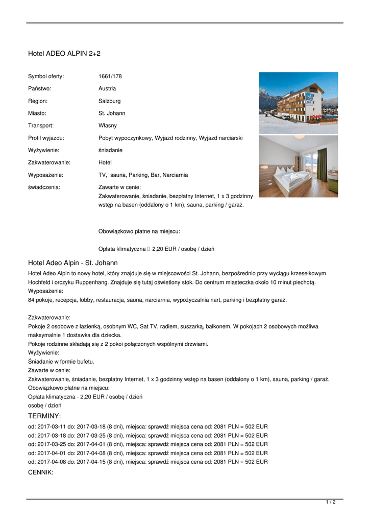 Hotel ADEO ALPIN 2+2 Symbol oferty: 1661/178 Państwo: Austria Region: Salzburg Miasto: St. Johann Transport: Własny Profil wyjazdu: Pobyt wypoczynkowy, Wyjazd rodzinny, Wyjazd narciarski Wyżywienie: śniadanie Zakwaterowanie: Hotel Wyposażenie: TV, sauna, Parking, Bar, Narciarnia świadczenia: Zawarte w cenie: Zakwaterowanie, śniadanie, bezpłatny Internet, 1 x 3 godzinny wstęp na basen (oddalony o 1 km), sauna, parking / garaż. Obowiązkowo płatne na miejscu: Opłata klimatyczna 2,20 EUR / osobę / dzień Hotel Adeo Alpin - St. Johann Hotel Adeo Alpin to nowy hotel, który znajduje się w miejscowości St. Johann, bezpośrednio przy wyciągu krzesełkowym Hochfeld i orczyku Ruppenhang. Znajduje się tutaj oświetlony stok. Do centrum miasteczka około 10 minut piechotą. Wyposażenie: 84 pokoje, recepcja, lobby, restauracja, sauna, narciarnia, wypożyczalnia nart, parking i bezpłatny garaż. Zakwaterowanie: Pokoje 2 osobowe z łazienką, osobnym WC, Sat TV, radiem, suszarką, balkonem. W pokojach 2 osobowych możliwa maksymalnie 1 dostawka dla dziecka. Pokoje rodzinne składają się z 2 pokoi połączonych wspólnymi drzwiami. Wyżywienie: Śniadanie w formie bufetu. Zawarte w cenie: Zakwaterowanie, śniadanie, bezpłatny Internet, 1 x 3 godzinny wstęp na basen (oddalony o 1 km), sauna, parking / garaż. Obowiązkowo płatne na miejscu: Opłata klimatyczna - 2,20 EUR / osobę / dzień osobę / dzień TERMINY: od: 2017-03-11 do: 2017-03-18 (8 dni), miejsca: sprawdź miejsca cena od: 2081 PLN = 502 EUR od: 2017-03-18 do: 2017-03-25 (8 dni), miejsca: sprawdź miejsca cena od: 2081 PLN = 502 EUR od: 2017-03-25 do: 2017-04-01 (8 dni), miejsca: sprawdź miejsca cena od: 2081 PLN = 502 EUR od: 2017-04-01 do: 2017-04-08 (8 dni), miejsca: sprawdź miejsca cena od: 2081 PLN = 502 EUR od: 2017-04-08 do: 2017-04-15 (8 dni), miejsca: sprawdź miejsca cena od: 2081 PLN = 502 EUR CENNIK: 1/2 Długość pobytu: 8 dni Grupa cenowa: C Ubezpieczenie (obligatoryjne) (*) Ubezpieczenie KL, NW, SKI 14 (*) Turystyczny Fundusz Gwarancyjny Pobyt w obiekcie (do wyboru) 2.5 (*) Pokój 2+2 os. standardowo dla osób: 4 minimalnie: 2 Rodzaj osoby (do wyboru) Dziecko 0-5 (*) Osoba dorosła Dziecko 6-13 Dziecko 14-17 lat Rodzaj osoby (opcjonalny) 3 osoba dorosła na dostawce (-) (-) 488 147 244 390 Waluta: EUR Aktualne ceny z systemu S.A.R.T. (-) - cena usługi, podatku kalkulowana przy osobie lub gratis (*) - kwota wliczona w cenę standardową 2/2