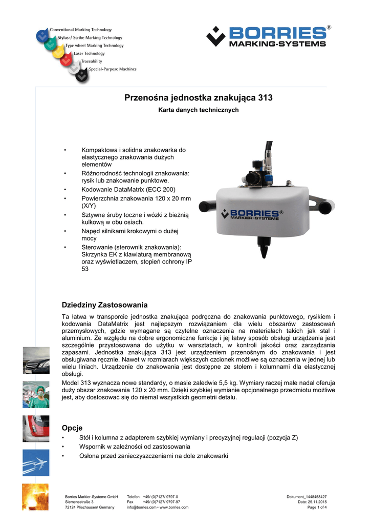 ® Pos: 2 /Vertrie b/Techn isc he Date nblät ter/Rit z-/ Nadel-Präge techn ik/312/3 13/31 3 Mobi l/1_Übe rsc hrift @ 2\mod _14 3091 488 071 1_66 31.do cx @ 31 485 @ 12 @ 1 Przenośna jednostka znakująca 313 Karta danych technicznych • • • • • • • Kompaktowa i solidna znakowarka do elastycznego znakowania dużych elementów Różnorodność technologii znakowania: rysik lub znakowanie punktowe. Kodowanie DataMatrix (ECC 200) Powierzchnia znakowania 120 x 20 mm (X/Y) Sztywne śruby toczne i wózki z bieżnią kulkową w obu osiach. Napęd silnikami krokowymi o dużej mocy Sterowanie (sterownik znakowania): Skrzynka EK z klawiaturą membranową oraz wyświetlaczem, stopień ochrony IP 53 Pos: 3 /Vertrie b/Techn isc he Date nblät ter/Rit z-/ Nadel-Präge techn ik/312/3 13/31 3 Mobi l/2_Ei nsat zbere ich @ 2\mod_ 1430 914 880 966_ 663 1.docx @ 315 01 @ 3 @ 1 Dziedziny Zastosowania Ta łatwa w transporcie jednostka znakująca podręczna do znakowania punktowego, rysikiem i kodowania DataMatrix jest najlepszym rozwiązaniem dla wielu obszarów zastosowań przemysłowych, gdzie wymagane są czytelne oznaczenia na materiałach takich jak stal i aluminium. Ze względu na dobre ergonomiczne funkcje i jej łatwy sposób obsługi urządzenia jest szczególnie przystosowana do użytku w warsztatach, w kontroli jakości oraz zarządzania zapasami. Jednostka znakująca 313 jest urządzeniem przenośnym do znakowania i jest obsługiwana ręcznie. Nawet w rozmiarach większych czcionek możliwe są oznaczenia w jednej lub wielu liniach. Urządzenie do znakowania jest dostępne ze stołem i kolumnami dla elastycznej obsługi. Model 313 wyznacza nowe standardy, o masie zaledwie 5,5 kg. Wymiary raczej małe nadal oferuja duży obszar znakowania 120 x 20 mm. Dzięki szybkiej wymianie opcjonalnego przedmiotu możliwe jest, aby dostosować się do niemal wszystkich geometrii detalu. Pos: 4 /Vertrie b/Techn isc he Date nblät ter/Rit z-/ Nadel-Präge techn ik/312/3 13/31 3 Mobi l/3_Optio nen @ 2\mod _14 309 1488 120 7_66 31.do cx @ 31 517 @ 3 @ 1 Opcje • • • Stół i kolumna z adapterem szybkiej wymiany i precyzyjnej regulacji (pozycja Z) Wspornik w zależności od zastosowania Osłona przed zanieczyszczeniami na dole znakowarki Pos: 5 /Vertrie b/Techn isc he Date nblät ter/Rit z-/ Nadel-Präge techn ik/312/3 13/31 3 Mobi l/5_Tec hni sche Da ten @ 2\mo d_14 309 148 8167 8_6 631.d ocx @ 3 154 8 @ 3 @ 1 Borries Markier-Systeme GmbH Siemensstraße 3 72124 Pliezhausen/ Germany Telefon +49/ (0)7127/ 9797-0 Fax +49/ (0)7127/ 9797-97 [email protected] • www.borries.com Dokument_1448458427 Date: 25.11.2015 Page 1 of 4 ® Dane techniczne Właściwości Wielkość, jednostka, wyjaśnienie Znakowarka (B x T x H) 360 x 166 x 213 mm (bez części mocujących) Powierzchnia znakowania (X, Y) 120 x 20 mm Masa ok. 4,5 kg Prędkość znakowania/pisania (zależnie od wysokości i kształtu znaków, procesu znakowania oraz napędu) do 6 znaków/sekundę Wysokość znaków od 1 mm (zwiększanie w krokach co 0,1 mm) Dokumentacja w jęz. niemieckim, angielskim lub francuskim więcej języków Głębokość penetracji końcówki znakującej (zależnie od głowicy znakującej, procesu znakowania oraz materiału) ok. 0,01 – 0,5 mm Czcionka DIN 1451, 7 x 5 (por. karty techniczne głowic znakujących) znakowanie punktowe DataMatrix inne czcionki są opcjonalne Specjalne znaki, loga zgodnie z oryginałem Kierunek znakowania linia prosta, kąt lub łuk kołowy Pos: 6 /Vertrie b/Medienve rso rgung _Spann ung um scha ltba r @ 3\mod_ 143 739 9235 847 _66 31.docx @ 36 216 @ @ 1 Doprowadzenie mediów Zasilacz z kablem połączeniowym 230 V AC ± 10 %, 50/60 Hz lub 115 V AC ± 10 %, 50/60 Hz przełączalne Przyłącza pneumatyczne (wejście pneumatyczne) sprężone powietrze poddane obróbce technicznej Min. 5 bar (min. 75 psi) osuszone, bezolejowe, przefiltrowane filtrem 50 μm Ciśnienie robocze (ciśnienie znakowania) co najmniej 2 bary do max. 4 barów Pos: 7 /Vertrie b/Techn isc he Änderungen @ 2\mod_1 426 838 1598 45_ 663 1.docx @ 2715 1 @ @ 1 Szczegóły techniczne mogą ulec zmianie. Pos: 8 /Vertrie b/Techn isc he Date nblät ter/Rit z-/ Nadel-Präge techn ik/312/3 13/31 3 Mobi l/4_ Bilde r @ 2\mo d_14 309 148 8143 2_6 631.do cx @ 3 1533 @ @ 1 Wspornik do znakowania przedmiotów płaskich 313 opcjonalnie ze stołem i kolumną Uchwyty do okrągłych przedmiotów są opcjonalne == Ende der Liste fü r Textma rke Inhalt === Borries Markier-Systeme GmbH Siemensstraße 3 72124 Pliezhausen/ Germany Telefon +49/ (0)7127/ 9797-0 Fax +49/ (0)7127/ 9797-97 [email protected] • www.borries.com Dokument_1448458427 Date: 25.11.2015 Page 2 of 4 ® Pos: 10 /Ve rt rieb/Tech nis che Da tenblä tter/Ri tz-/ Nadel-Prä getech nik/31 2/313/3 13 Mob il/6_ Zeic hnu ng 31 3 Trag bar oh ne Schut zbal g @ 2\mod_ 143 091 4881 849 _66 31.docx @ 315 65 @ 3 @ 1 Rysunek przenośnej ręcznej jednostki znakującej 313 Wymiar w mm. Szczegóły techniczne mogą ulec zmianie. Data: Lipiec 2015 Borries Markier-Systeme GmbH Siemensstraße 3 72124 Pliezhausen/ Germany Telefon +49/ (0)7127/ 9797-0 Fax +49/ (0)7127/ 9797-97 [email protected] • www.borries.com Dokument_1448458427 Date: 25.11.2015 Page 3 of 4 ® Pos: 11 /Ve rt rieb/Tech nis che Da tenblä tter/Ri tz-/ Nadel-Prä getech nik/31 2/313/3 13 Mob il/7_ Zeic hnu ng 31 3 Trag bar mi t Schu tzbal g @ 3\mod _143 798 551 7691 _66 31.do cx @ 37 201 @ 3 @ 1 Rysunek przenośnej jednostki znakującej 313 z pokrywą przeciw zabrudzeniową Wymiar w mm. Szczegóły techniczne mogą ulec zmianie. Data: Lipiec 2015 Borries Markier-Systeme GmbH Siemensstraße 3 72124 Pliezhausen/ Germany Telefon +49/ (0)7127/ 9797-0 Fax +49/ (0)7127/ 9797-97 [email protected] • www.borries.com Dokument_1448458427 Date: 25.11.2015 Page 4 of 4