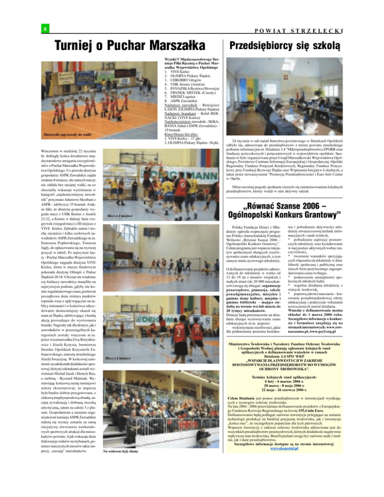 8 P O W I A T Turniej o Puchar Marsza³ka S T R Z E L E C K I Przedsiêbiorcy siê szkol¹ Wyniki V Miêdzynarodowego Turnieju Pi³ki Rêcznej o Puchar Marsza³ka Województwa Opolskiego 1. VIVE Kielce 3. CHROBRY G³ogów 5. POVAZSKA Bystrica (S³owacja) 7. MIED Legnica 2. 4. 6. 8. OLIMPIA Piekary l¹skie UHK Krems (Austria) FRYDEK MISTEK (Czechy) ASPR Zawadzkie Najlepszy zawodnik Remigiusz LASOÑ (OLIMPIA Piekary l¹skie) Najlepszy bramkarz Rafa³ BER- NACKI (VIVE Kielce) Najskuteczniejszy zawodnik - SKRA- BANIA Adam (ASPR Zawadzkie) 35 bramek Klasyfikacja fair play: Ma¿oretki zagrzewa³y do walki 1. VIVE Kielce - 37 pkt. 2. OLIMPIA Piekary l¹skie- 38 pkt. 24 stycznia w sali narad Starostwa powiatowego w Strzelcach Opolskich odby³o siê, adresowane do przedsiêbiorców z terenu powiatu strzeleckiego potkanie informacyjne nt. Dzia³ania 3.4 "Mikroprzedsiêbiorstwa ZPORR oraz Wieczorem w niedzielê 22 stycznia funduszy po¿yczkowych i porêczeniowych w województwie opolskim. Spo- br. dobieg³y koñca dwudniowe miê- tkanie to by³o organizowane przez Urz¹d Marsza³kowski Województwa Opol- dzynarodowe zmagania szczypiorni- skiego, Powiatowe Centrum Informacji Europejskiej i Gospodarczej, Opolski stów o Puchar Marsza³ka Wojewódz- Regionalny Fundusz Porêczeñ Kredytowych, Regionalny Fundusz Po¿ycz- kowy przy Fundacji Rozwoju l¹ska oraz Wspierania Inicjatyw Lokalnych, a twa Opolskiego. Co prawda dru¿yna tak¿e przez stowarzyszenie "Promocja Przedsiêbiorczoci i Euro Info Centre gospodarzy ASPR Zawadzkie zajê³a w Opolu. ostatnie 8 miejsce, ale samych meczy nie odda³a bez zaciêtej walki, na co Mimo mronej pogody spotkanie cieszy³o siê zainteresowaniem lokalnych chocia¿by wskazuje wyró¿nienie w przedsiêbiorców, którzy wziêli w nim aktywny udzia³. kategorii najskuteczniejszy zawodnik przyznane Adamowi Skrabani z ASPR zdobywcy 35 bramek. A tak- Równaæ Szanse 2006 Ogólnopolski Konkurs Grantowy ¿e fakt, ¿e dru¿yna gospodarzy wygra³a mecz z UHK Krems z Austrii 23:22, a Krems w dalszej fazie roz- Mecz o I miejsce grywek rozegra³ mecz o III miejsce z VIVE Polska Fundacja Dzieci i M³o- Kielce. Zabrak³o zatem i tro- chê szczêcia i kilku czo³owych zawodników ASPR Zawadzkiego m.in. Jag³y, do uplasowania siê na wy¿szej pozycji w tabeli. Po najwy¿sze laury - Puchar Marsza³ka Województwa Opolskiego siêgnê³a dru¿yna VIVE Kielce, która w meczu fina³owym pokona³a dru¿ynê Olimpii z Piekar * Celem programu jest wsparcie inicja- w niej postaw aktywnych wobec rze- tyw spo³ecznych s³u¿¹cych wyrów- czywistoci, nywaniu szans edukacyjnych, a tym * samym startu ¿yciowego m³odzie¿y. cych w³¹czaniu siê m³odzie¿y w dzia- O dofinansowanie projektów adreso- innych form po¿ytecznego zagospo- ców) mog¹ siê ubiegaæ: organizacje pozarz¹dowe, gimnazja, szko³y niec regulaminowego czasu, poniewa¿ ponadgimnazjalne, pocz¹tkowa du¿a ró¿nica punktów miejskie i gminne domy kultury, miejskie i topnia³a wraz z up³ywaj¹cymi na ta- gminne biblioteki blicy minutami i w koñcówce zdecydowanie skuteczniejszy okaza³ siê - maj¹ce sie- akcj¹ prowadz¹ce do wyrównania bramki. Nagrody tak dla dru¿yn, jak i zawodników w poszczególnych kategoriach zosta³y wrêczone m.in. przez wicemarsza³ka Ewê Rurynkie- tworzenie warunków sprzyjaj¹- ³alnoæ spo³eczn¹ i publiczn¹ oraz darowania czasu wolnego, * podnoszenie umiejêtnoci spo- * wspólne dzia³ania m³odzie¿y z * poprawê jakoci nauczania kre- ³ecznych m³odych ludzi, ró¿nych rodowisk, owanie ponadstandardowej oferty edukacyjnej i praktyczne wdra¿anie dzibê na terenie wsi lub miasta do nowoczesnych metod dzia³ania. Dotacje bêd¹ przeznaczone na dzia- sk³adaæ do 1 marca 2006 roku. 20 tysiêcy mieszkañców. team ze l¹ska, zdobywaj¹cy z ka¿d¹ pobudzanie aspiracji poznaw- czych m³odzie¿y oraz kszta³towanie ma³ych miast (do 20 000 mieszkañ- najwy¿szym podium, gdyby nie ko- macyjnych i nauk cis³ych, Ogólnopolski Konkurs Grantowy. 13 do 19 lat z terenów wiejskich i czy kieleccy zawodnicy stanêliby na Wnioski o dofinansowanie mo¿na ³ania s³u¿¹ce wyrównywaniu szans Szczegó³owe informacje o konkur- · stronach internetowych: www.row- edukacyjnych m.in. poprzez: sie i formularz znajduj¹ siê na dla podniesienia poziomu kszta³ce- nacszanse.pl, www.pcyf.org.pl wykorzystanie mo¿liwoci, jakie Ministerstwo rodowiska i Narodowy Fundusz Ochrony rodowiska wicz i Józefa Kotysia, burmistrza i Gospodarki Wodnej planuj¹ og³oszenie kolejnych rund Strzelec Opolskich Krzysztofa Fa- aplikacyjnych o dofinansowanie wniosków w ramach bianowskiego, starostê strzeleckiego Mecz o I miejsce monii za ca³okszta³t dzia³alnoci spor- Dzia³ania 2.4 SPO WKP WSPARCIE DLA INWESTYCJI W ZAKRESIE DOSTOSOWYWANIA PRZEDSIÊBIORSTW DO WYMOGÓW towej z³otymi odznakami zostali wy- OCHRONY RODOWISKA. ró¿nieni Micha³ Jacek i Henryk Rus, Terminy kolejnych rund aplikacyjnych: a srebrn¹ - Ryszard Maniak. Wy- 6 luty - 6 marzec 2006 r. stawiaj¹c koñcow¹ ocenê turniejowi 20 marca - 8 maja 2006 r. nale¿y skonstatowaæ, ¿e impreza 22 maja - 26 czerwca 2006 r. by³a bardzo dobrze przygotowana, z ciekaw¹ miêdzynarodow¹ obsad¹, za- Celem Dzia³ania jest pomoc przedsiêbiorcom w inwestycjach wynikaj¹- cych z wymogów ochrony rodowiska. ciêt¹ rywalizacj¹ i dobran¹ otoczk¹ Na lata 2004 - 2006 przewidziano dofinansowanie projektów z Europejskie- artystyczn¹, zatem za ca³oæ 5 z plu- go Funduszu Rozwoju Regionalnego na kwotê 155,4 mln Euro. sem. Gospodarzom a zarazem orga- Dofinansowaniu bêd¹ podlegaæ zarówno inwestycje polegaj¹ce na zmianie nizatorom turnieju ASPR Zawadzkie technologii produkcji na bardziej przyjazn¹ rodowisku, jak i inwestycje nale¿¹ siê wyrazy uznania za sam¹ koñca rury, ze szczególnym poparciem dla tych pierwszych. inicjatywê stworzenia weekendo- Wsparcie inwestycji z zakresu ochrony rodowiska adresowane jest do wszystkich przedsiêbiorstw przemys³owych, których dzia