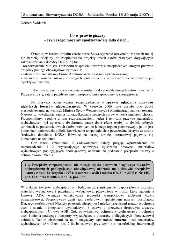 Seminarium Stowarzyszenia DGSA – Szklarska Por ba 18-20 maja 2007r. Norbert widerek Co w prawie piszczy - czyli czego mo emy spodziewa si lada dzie … Ostatnio, w bardzo krótkim czasie nasze Stowarzyszenie otrzymało, w sposób mniej lub bardziej oficjalny, do zaopiniowania projekty trzech aktów prawnych dotykaj cych zakresu działania doradcy DGSA. S to: - rozporz dzenie Ministra Transportu w sprawie towarów niebezpiecznych, których przewóz drogowy podlega obowi zkowi zgłoszenia; - ustawa o zmianie ustawy Prawo Atomowe wraz z aktami wykonawczymi; - ustawa o zmianie ustawy o drogach publicznych i rozporz dzenia wprowadzaj ce dyrektyw tunelow . Jakie uwagi, jako Stowarzyszenie wnosili my do przedstawionych aktów prawnych? Przyjrzyjmy si , zatem przedstawionym propozycjom i spróbujmy je skomentowa . Na pierwszy ogie we my rozporz dzenie w sprawie zgłaszania przewozu niektórych towarów niebezpiecznych. W czerwcu 2006 roku zostało ono dosy niespodziewanie, na wniosek Ministra Spraw Wewn trznych i Administracji znowelizowane. Niestety ta nowelizacja zamiast uporz dkowania pewnych spraw wniosła mnóstwo chaosu. Przypomnijmy: zgodnie z tym rozporz dzeniem, jeden i ten sam przewóz materiałów wybuchowych był zgłaszany dwukrotnie, przez dwie ró ne osoby, w dwóch ró nych terminach na podstawie dwóch aktów prawnych do jednego organu pa stwowego, jakim jest komendant wojewódzki policji. Rozwi zanie to spotkało si z powszechn krytyk ze strony rodowisk doradców DGSA. Równie na naszej stronie internetowej pojawiły si komentarze na ten temat. Có zatem zmieniono? Z zadowoleniem nale y przyj wprowadzenie do rozporz dzenia § 2, wył czaj cego obowi zek zgłaszania przewozu materiałów wybuchowych podlegaj cych obowi zkowej ochronie na podstawie przepisów ustawy o ochronie osób i mienia. § 2. Przepisów rozporz dzenia nie stosuje si do przewozu drogowego towarów niebezpiecznych podlegaj cego obowi zkowej ochronie na podstawie przepisów ustawy z dnia 22 sierpnia 1997 r. o ochronie osób i mienia (Dz. U. z 2005 r. Nr 145, poz. 1221 oraz z 2006 r. Nr 104, poz. 708). W wykazie towarów niebezpiecznych b d cym zał cznikiem do rozporz dzenia pozostały materiały wybuchowe i przedmioty wybuchowe, przewo one w ilo ci, która zgodnie z Umow ADR wymaga oznakowania jednostki transportowej tablicami barwy pomara czowej. Proponowany zapis jest cz ciowym spełnieniem naszych postulatów. Dlaczego cz ciowym? Niestety pozostała niespójno mi dzy przepisami ustawy o ochronie osób i mienia i przepisami wynikaj cymi z ustawy o przewozie drogowym towarów niebezpiecznych i Umowy ADR. Otó obowi zkowej ochronie z tytułu ustawy o ochronie osób i mienia podlegaj transporty wyje d aj ce z obszarów podlegaj cych obowi zkowej ochronie. Takimi obszarami s m.in. magazyny zawieraj ce znaczne ilo ci materiałów wybuchowych (Art. 5 ust. pkt. 2 lit. b) ustawy), przy czym nie ma oficjalnej interpretacji Norbert widerek – Co w prawie piszczy… 1 Seminarium Stowarzyszenia DGSA – Szklarska Por ba 18-20 maja 2007r. poj cia „znaczne” (a mo na by było posłu y si kategoriami składów materiałów wybuchowych, o których mowa w przepisach wykonawczych do ustawy o materiałach wybuchowych do u ytku cywilnego…) W tym stanie prawnym s sytuacje, w których ten sam towar, np. 5 000 sztuk zestawów zapalników nieelektrycznych (UN 0360), wyje d aj cy z zakładów w Bieruniu podlega obowi zkowej ochronie i zgłoszeniu do komendanta wojewódzkiego policji, natomiast transport wyje d aj cy z Sitkówki takiemu zgłoszeniu nie podlega. Jest jeszcze jeden aspekt zwi zany z powiadamianiem wła ciwych władz. Otó zgodnie z ustaw o ochronie osób i mienia zgłoszenia transportu dokonuje si tylko do komendanta wojewódzkiego policji, natomiast zgodnie z projektem rozporz dzenia zgłoszenie powinno by zło one do komendantów wojewódzkich policji i pa stwowej stra y po arnej. Zatem wysoce prawdopodobna jest sytuacja, w której komendant wojewódzki pa stwowej stra y po arnej b dzie powiadomiony o przewozie dwóch paczek – 50 kg – dynamitu o numerze UN 0081, natomiast nic nie b dzie wiedział o przeje dzie przez podległy mu teren transportu z pi cioma tonami tego dynamitu… Zdajemy sobie spraw , e usuni cie powy szych sprzeczno ci wykracza poza ramy niniejszego rozporz dzenia i wymaga zmian w ustawach. Podstawow byłaby zmiana w ustawie o ochronie osób i mienia – wi załaby ona obowi zek, i ochrony transportu, i jego zgłoszenia nie od miejsca rozpocz cia przewozu, lecz od rodzaju i ilo ci przewo onego ładunku. Kryteria oczywi cie byłyby przej te z Umowy ADR (np. oznaczenie tablicami barwy pomara czowej). W dalszym ci gu nie jest zauwa any problem przewozu niewybuchów. Nikt normalny na umy le nie b dzie czekał z wywiezieniem starej bombki lotniczej pi dni, bo taki ma termin na zgłoszenie przewozu. Pami tajmy równie , e wywozem niewybuchów zajmuje si nie tylko wojsko, ale równie firmy cywilne. Czy wystarczy nowy przepis, który pojawił si w Umowie ADR 2007, 1.1.3.1 (d) tiret drugi? 1.1.3.1 Wył czenia wynikaj ce z charakteru operacji transportowych Przepisy zawarte w ADR nie maj zastosowania do: (…) (d) przewozu wykonywanego lub nadzorowanego przez słu by ratownicze, o ile jest on konieczny ze wzgl du na prowadzon akcj ratownicz , w szczególno ci: - (…) - przewozu maj cego na celu ograniczenie rozprzestrzeniania si towarów niebezpiecznych na miejscu wypadku lub awarii, odzysk tych towarów oraz ich przemieszczanie w miejsce bezpieczne. Hmmm… jest takie okre lenie: falandyzacja prawa… Norbert widerek – Co w prawie piszczy… 2 Seminarium Stowarzyszenia DGSA – Szklarska Por ba 18-20 maja 2007r. W zał czniku do rozporz dzenia s wymienione materiały promieniotwórcze, których przewóz podlega obowi zkowi zgłoszenia do komendantów wojewódzkich policji i stra y po arnej. WYKAZ TOWARÓW NIEBEZPIECZNYCH, KTÓRYCH PRZEWÓZ DROGOWY PODLEGA OBOWI ZKOWI ZGŁOSZENIA - materiały 