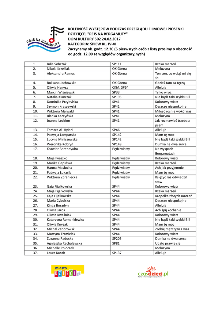 KOLEJNOŚĆ WYSTĘPÓW PODCZAS PRZEGLĄDU FILMOWEJ PIOSENKI DZIECIĘCEJ "REJS NA BERGAMUTY" DOM KULTURY 502 24.02.2017 KATEGORIA: ŚPIEW KL. IV-VI Zaczynamy ok. godz. 12.30 (5 pierwszych osób z listy prosimy o obecność od godz. 12.00 ze względów organizacyjnych) 1. 2. 3. Julia Sobczak Nikola Krześlak Aleksandra Ramus SP111 OK Górna OK Górna 4. 5. 6. 7. 8. 9. 10. 11. 12. Roksana Jachowska Oliwia Hanysz Marcin Wiśniewski Natalia Klimczak Dominika Przybylska Szymon Kraszewski Wiktoria Maiwald Blanka Kaczyńska Joanna Ledzion OK Górna CKM, SP64 SP33 SP193 SP41 SP41 SP41 SP41 SP41 13. 14. 15. 16. 17. Tamara Al Hyiari Patrycja Lamparska Lucyna Miniszewska Weronika Kobryń Ksawier Berendyuha SP46 SP142 SP142 SP149 Pędziwiatry 18. 19. 20. 21. 22. Maja Iwaszko Marika Gapińska Hanna Masłocha Patrycja Łukasik Wiktoria Zbraniecka Pędziwiatry Pędziwiatry Pędziwiatry Pędziwiatry Pędziwiatry 23. 24. 25. 26. 27. 28. 29. 30. 31. 32. 33. 34. 35. 36. 37. Gaja Fijałkowska Maja Fijałkowska Kaja Fijałkowska Maria Cybulska Kinga Boradyn Oliwia Jaros Oliwia Kwaśniak Katarzyna Romankiewicz Oliwia Knysak Michał Zaborowski Martyna Trzmielak Zuzanna Raducka Agnieszka Rachalewska Michelle Poloczek Laura Kacak SP44 SP44 SP44 SP44 SP44 SP44 SP44 SP44 SP44 SP44 SP44 SP205 SP81 SP137 Rzeka marzeń Meluzyna Ten sen, co wciąż mi się śni Gdzieś tam za tęczą Alleluja Tylko wróć Nie bądź taki szybki Bill Kolorowy wiatr Deszcze niespokojne Miłość rośnie wokół nas Meluzyna Jak rozmawiać trzeba z psem Alleluja Mam tę moc Nie bądź taki szybki Bill Dumka na dwa serca Na wyspach Bergamutach Kolorowy wiatr Rzeka marzeń Ach jak przyjemnie Mam tę moc Księżyc raz odwiedził staw Kolorowy wiatr Rzeka marzeń Kropelka złotych marzeń Deszcze niespokojne Alleluja Ach śpij kochanie Kolorowy wiatr Nie bądź taki szybki Bill Mam tę moc Zrobię mężczyzn z was Kolorowy wiatr Dumka na dwa serca Udało prawie się Meluzyna Alleluja