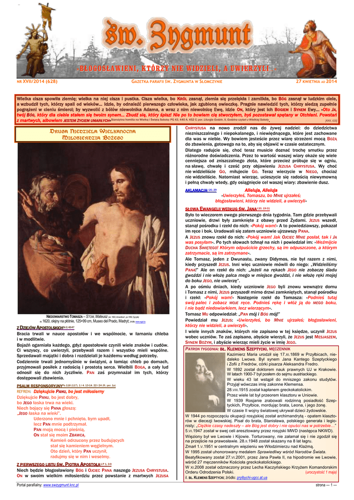 »BŁOGOSŁAWIENI NR XVII/2014 (628) , KTÓRZY NIE WIDZIELI, A UWIERZYLI…« GAZETKA PARAFII ŚW. ZYGMUNTA W SŁOMCZYNIE 27 KWIETNIA AD 2014 Wielka cisza spowiła ziemię; wielka na niej cisza i pustka. Cisza wielka, bo KRÓL zasnął, ziemia się przelękła i zamilkła, bo BÓG zasnął w ludzkim ciele, a wzbudził tych, którzy spali od wieków… Idzie, by odnaleźć pierwszego człowieka, jak zgubioną owieczkę. Pragnie nawiedzić tych, którzy siedzą zupełnie pogrążeni w cieniu śmierci; by wyzwolić z bólów niewolnika Adama, a wraz z nim niewolnicę Ewę, idzie ON, który jest ich BOGIEM i SYNEM Ewy… »Oto JA, twój BÓG, który dla ciebie stałem się twoim synem… Zbudź się, który śpisz! Nie po to bowiem cię stworzyłem, byś pozostawał spętany w Otchłani. Powstań z martwych, albowiem JESTEM ŻYCIEM UMARŁYCH«Starożytna homilia na Wielką i Świętą Sobotę: PG 43, 440 A. 452 C; por. Liturgia Godzin, II, Godzina czytań z Wielkiej Soboty. [KKK, 635] DRUGA NIEDZIELA WIELKANOCNA MIŁOSIERDZIA BOŻEGO CHRYSTUSA na nowo zrodził nas do żywej nadziei: do dziedzictwa niezniszczalnego i niepokalanego, i niewiędnącego, które jest zachowane dla was w niebie. Wy bowiem jesteście przez wiarę strzeżeni mocą BOŻĄ do zbawienia, gotowego na to, aby się objawić w czasie ostatecznym. Dlatego radujcie się, choć teraz musicie doznać trochę smutku przez różnorodne doświadczenia. Przez to wartość waszej wiary okaże się wiele cenniejsza od zniszczalnego złota, które przecież próbuje się w ogniu, na sławę, chwałę i cześć przy objawieniu JEZUSA CHRYSTUSA. Wy choć nie widzieliście GO, miłujecie GO. Teraz wierzycie w NIEGO, chociaż nie widzieliście. Natomiast wierząc, ucieszycie się radością niewymowną i pełną chwały wtedy, gdy osiągnięcie cel waszej wiary: zbawienie dusz. Alleluja, Alleluja »Uwierzyłeś, Tomaszu, bo MNIE ujrzałeś; błogosławieni, którzy nie widzieli, a uwierzyli« AKLAMACJAJ 20, 29 SŁOWA EWANGELII WEDŁUG ŚW. JANAJ 20, 19-31 ok. NIEDOWIARSTWO TOMASZA – STOM, Mateusz (ok. 1600, Amersfoort - po 1650, Sycylia) 1620, olejny na płótnie, 125×99 cm, Museo del Prado, Madryt; źródło: www.wga.hu Z DZIEJÓW APOSTOLSKICHDz 2, 42-47 Bracia trwali w nauce apostołów i we wspólnocie, w łamaniu chleba i w modlitwie. Bojaźń ogarniała każdego, gdyż apostołowie czynili wiele znaków i cudów. Ci wszyscy, co uwierzyli, przebywali razem i wszystko mieli wspólne. Sprzedawali majątki i dobra i rozdzielali je każdemu według potrzeby. Codziennie trwali jednomyślnie w świątyni, a łamiąc chleb po domach, przyjmowali posiłek z radością i prostotą serca. Wielbili BOGA, a cały lud odnosił się do nich życzliwie. PAN zaś przymnażał im tych, którzy dostępowali zbawienia. PSALM RESPONSORYJNYPs 118 (117), 1 i 4. 13-14. 22 i 24 (R.: por. 1a) Dziękujcie PANU, bo jest miłosierny Dziękujcie PANU, bo jest dobry, bo JEGO łaska trwa na wieki. Niech bojący się PANA głoszą: „JEGO łaska na wieki”. Uderzono mnie i pchnięto, bym upadł, lecz PAN mnie podtrzymał. PAN moją mocą i pieśnią, ON stał się moim ZBAWCĄ. Kamień odrzucony przez budujących stał się kamieniem węgielnym. Oto dzień, który PAN uczynił, radujmy się w nim i weselmy. REFREN: Z PIERWSZEGO LISTU ŚW. PIOTRA APOSTOŁA1 P 1, 3-9 Niech będzie błogosławiony BÓG i OJCIEC PANA naszego JEZUSA CHRYSTUSA. ON w swoim wielkim miłosierdziu przez powstanie z martwych JEZUSA Portal parafialny: www.swzygmunt.knc.pl Było to wieczorem owego pierwszego dnia tygodnia. Tam gdzie przebywali uczniowie, drzwi były zamknięte z obawy przed Żydami. JEZUS wszedł, stanął pośrodku i rzekł do nich: »Pokój wam!« A to powiedziawszy, pokazał im ręce i bok. Uradowali się zatem uczniowie ujrzawszy PANA. A JEZUS znowu rzekł do nich: »Pokój wam! Jak OJCIEC MNIE posłał, tak i JA was posyłam«. Po tych słowach tchnął na nich i powiedział im: »Weźmijcie DUCHA ŚWIĘTEGO! Którym odpuścicie grzechy, są im odpuszczone, a którym zatrzymacie, są im zatrzymane«. Ale Tomasz, jeden z Dwunastu, zwany Didymos, nie był razem z nimi, kiedy przyszedł JEZUS. Inni więc uczniowie mówili do niego: „Widzieliśmy PANA!” Ale on rzekł do nich: „Jeżeli na rękach JEGO nie zobaczę śladu gwoździ i nie włożę palca mego w miejsce gwoździ, i nie włożę ręki mojej do boku JEGO, nie uwierzę”. A po ośmiu dniach, kiedy uczniowie JEGO byli znowu wewnątrz domu i Tomasz z nimi, JEZUS przyszedł mimo drzwi zamkniętych, stanął pośrodku i rzekł: »Pokój wam!« Następnie rzekł do Tomasza: »Podnieś tutaj swój palec i zobacz MOJE ręce. Podnieś rękę i włóż ją do MEGO boku, i nie bądź niedowiarkiem, lecz wierzącym«. Tomasz MU odpowiedział: „PAN mój i BÓG mój!” Powiedział mu JEZUS: »Uwierzyłeś, bo MNIE ujrzałeś; błogosławieni, którzy nie widzieli, a uwierzyli«. I wiele innych znaków, których nie zapisano w tej księdze, uczynił JEZUS wobec uczniów. Te zaś zapisano, abyście wierzyli, że JEZUS jest MESJASZEM, SYNEM BOŻYM, i abyście wierząc mieli życie w imię JEGO. PATRON TYGODNIA: BŁ. KLEMENS SZEPTYCKI, MĘCZENNIK Kazimierz Maria urodził się 17.XI.1869 w Przyłbicach, niedaleko Lwowa. Był synem Jana Kantego Szeptyckiego i Zofii z Fredrów, córki pisarza Aleksandra Fredro. W 1892 został doktorem nauk prawnych UJ w Krakowie. W latach 1900-7 był posłem do sejmu austriackiego. W wieku 43 lat wstąpił do mniszego zakonu studytów. Przyjął wówczas imię zakonne Klemensa. 28.VIII.1915 został kapłanem greckokatolickim. Przez wiele lat był przeorem klasztoru w Uniowie. W 1939 Rosjanie zrabowali rodzinną posiadłość Szeptyckich, Przyłbice, mordując brata, Leona, i jego żonę. W czasie II wojny światowej ukrywał dzieci żydowskie. W 1944 po rozpoczęciu okupacji rosyjskiej został archimandrytą - opatem klasztorów w diecezji lwowskiej. Pisał do brata, Stanisława, polskiego g