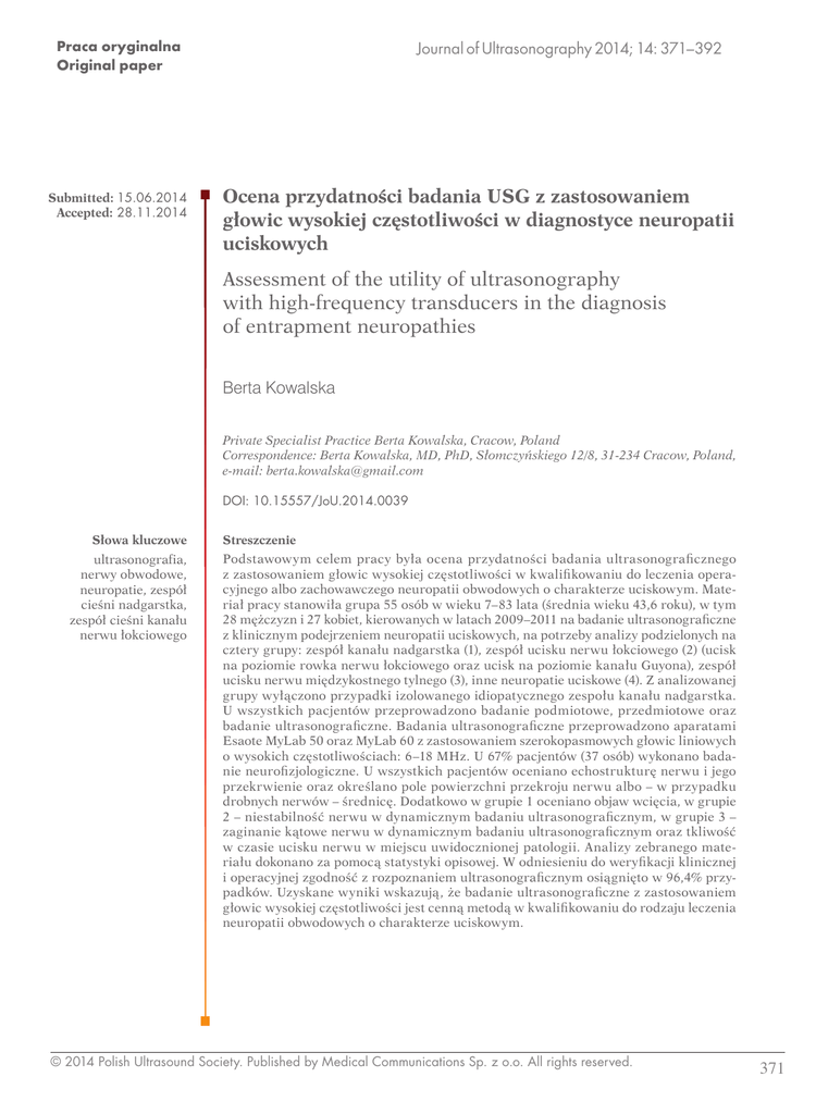 Praca oryginalna Original paper Submitted: 15.06.2014 Accepted: 28.11.2014 Journal of Ultrasonography 2014; 14: 371–392 Ocena przydatności badania USG z zastosowaniem głowic wysokiej częstotliwości w diagnostyce neuropatii uciskowych Assessment of the utility of ultrasonography with high-frequency transducers in the diagnosis of entrapment neuropathies Berta Kowalska Private Specialist Practice Berta Kowalska, Cracow, Poland Correspondence: Berta Kowalska, MD, PhD, Słomczyńskiego 12/8, 31-234 Cracow, Poland, e-mail: [email protected] DOI: 10.15557/JoU.2014.0039 Słowa kluczowe ultrasonografia, nerwy obwodowe, neuropatie, zespół cieśni nadgarstka, zespół cieśni kanału nerwu łokciowego Streszczenie Podstawowym celem pracy była ocena przydatności badania ultrasonograficznego z zastosowaniem głowic wysokiej częstotliwości w kwalifikowaniu do leczenia operacyjnego albo zachowawczego neuropatii obwodowych o charakterze uciskowym. Materiał pracy stanowiła grupa 55 osób w wieku 7–83 lata (średnia wieku 43,6 roku), w tym 28 mężczyzn i 27 kobiet, kierowanych w latach 2009–2011 na badanie ultrasonograficzne z klinicznym podejrzeniem neuropatii uciskowych, na potrzeby analizy podzielonych na cztery grupy: zespół kanału nadgarstka (1), zespół ucisku nerwu łokciowego (2) (ucisk na poziomie rowka nerwu łokciowego oraz ucisk na poziomie kanału Guyona), zespół ucisku nerwu międzykostnego tylnego (3), inne neuropatie uciskowe (4). Z analizowanej grupy wyłączono przypadki izolowanego idiopatycznego zespołu kanału nadgarstka. U wszystkich pacjentów przeprowadzono badanie podmiotowe, przedmiotowe oraz badanie ultrasonograficzne. Badania ultrasonograficzne przeprowadzono aparatami Esaote MyLab 50 oraz MyLab 60 z zastosowaniem szerokopasmowych głowic liniowych o wysokich częstotliwościach: 6–18 MHz. U 67% pacjentów (37 osób) wykonano badanie neurofizjologiczne. U wszystkich pacjentów oceniano echostrukturę nerwu i jego przekrwienie oraz określano pole powierzchni przekroju nerwu albo – w przypadku drobnych nerwów – średnicę. Dodatkowo w grupie 1 oceniano objaw wcięcia, w grupie 2 – niestabilność nerwu w dynamicznym badaniu ultrasonograficznym, w grupie 3 – zaginanie kątowe nerwu w dynamicznym badaniu ultrasonograficznym oraz tkliwość w czasie ucisku nerwu w miejscu uwidocznionej patologii. Analizy zebranego materiału dokonano za pomocą statystyki opisowej. W odniesieniu do weryfikacji klinicznej i operacyjnej zgodność z rozpoznaniem ultrasonograficznym osiągnięto w 96,4% przypadków. Uzyskane wyniki wskazują, że badanie ultrasonograficzne z zastosowaniem głowic wysokiej częstotliwości jest cenną metodą w kwalifikowaniu do rodzaju leczenia neuropatii obwodowych o charakterze uciskowym. © 2014 Polish Ultrasound Society. Published by Medical Communications Sp. z o.o. All rights reserved. 371 Berta Kowalska Key words ultrasonography, peripheral nerves, neuropathies, carpal tunnel syndrome, ulnar nerve entrapment 372 Abstract The primary aim of this paper was to assess the relevance of high-frequency ultrasound examination in qualifying patients for either surgical or conservative treatment of peripheral entrapment neuropathies. The study was conducted in a group of 55 patients aged 7–83 (mean age 43.6), including 28 males and 27 females, who in 2009–2011 were referred to an ultrasound examination due to a clinical suspicion of entrapment neuropathies. For the purposes of the analysis, the patients were divided into four groups: carpal tunnel syndrome (1), ulnar nerve entrapment (2) (cubital tunnel syndrome and Guyon’s canal syndrome), posterior interosseous nerve syndrome (3) and other entrapment neuropathies (4). The cases of isolated idiopathic carpal tunnel syndrome were excluded from the analysis. All patients underwent the interview, physical examination and ultrasound examination. Ultrasound examinations were performed with Esaote MyLab 50 and MyLab 60 systems using high-frequency broadband linear transducers: 6–18 MHz. Sixty-seven percent of patients (37 persons) underwent a neurophysiological test. Nerve echostructure, its hyperemia as well as nerve cross-sectional area or, in the case of small nerves, diameter were assessed in all patients. Furthermore, the following were assessed in individual groups: notch sign in group 1, nerve instability in a dynamic ultrasound examination in group 2, nerve angulation in a dynamic ultrasound examination and tenderness on nerve compression at the site of the visualized pathology in group 3. The analyses of the collected material were performed by means of descriptive statistics. The results of clinical and surgical verification were consistent with ultrasound findings in 96.4%. The results indicate that high-frequency ultrasonography is a valuable method in qualifying patients for various types of treatment of peripheral neuropathies resulting from compression. Wstęp Introduction Pierwsze doniesienia na temat zastosowania ultrasonografii (USG) do oceny nerwów obwodowych pojawiły się w latach 90. i dotyczyły zespołu cieśni kanału nadgarstka, czyli neuropatii uciskowej nerwu pośrodkowego(1,2). W ostatnim dziesięcioleciu, wraz z wprowadzeniem głowic ultradźwiękowych o wysokich częstotliwościach, badanie USG stało się integralnym elementem oceny pacjentów z podejrzeniem neuropatii obwodowych, stanowiąc uzupełnienie rutynowo wykonywanych badań diagnostycznych, tj. badania klinicznego i elektromiografii (EMG)(3–7). Ze względu na możliwość oceny jedynie krótkich odcinków nerwów obwodowych, niższą rozdzielczość (w porównaniu z badaniem USG), ograniczoną dostępność, a także wysoką cenę rezonans wysokopolowy rzadko znajduje zastosowanie w diagnostyce neuropatii obwodowych(8–11). Wśród neuropatii obwodowych można wymienić: neuropatie uciskowe, pourazowe, guzy nerwów obwodowych oraz neuropatie pooperacyjne. The first reports on the appli