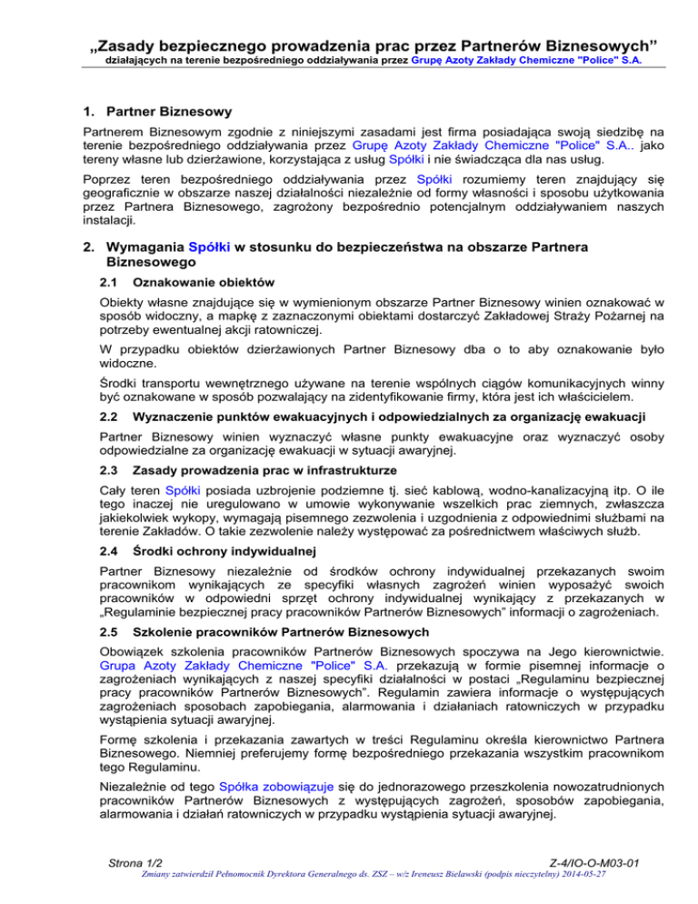 „Zasady bezpiecznego prowadzenia prac przez Partnerów Biznesowych” działających na terenie bezpośredniego oddziaływania przez Grupę Azoty Zakłady Chemiczne "Police" S.A. 1. Partner Biznesowy Partnerem Biznesowym zgodnie z niniejszymi zasadami jest firma posiadająca swoją siedzibę na terenie bezpośredniego oddziaływania przez Grupę Azoty Zakłady Chemiczne "Police" S.A.. jako tereny własne lub dzierżawione, korzystająca z usług Spółki i nie świadcząca dla nas usług. Poprzez teren bezpośredniego oddziaływania przez Spółki rozumiemy teren znajdujący się geograficznie w obszarze naszej działalności niezależnie od formy własności i sposobu użytkowania przez Partnera Biznesowego, zagrożony bezpośrednio potencjalnym oddziaływaniem naszych instalacji. 2. Wymagania Spółki w stosunku do bezpieczeństwa na obszarze Partnera Biznesowego 2.1 Oznakowanie obiektów Obiekty własne znajdujące się w wymienionym obszarze Partner Biznesowy winien oznakować w sposób widoczny, a mapkę z zaznaczonymi obiektami dostarczyć Zakładowej Straży Pożarnej na potrzeby ewentualnej akcji ratowniczej. W przypadku obiektów dzierżawionych Partner Biznesowy dba o to aby oznakowanie było widoczne. Środki transportu wewnętrznego używane na terenie wspólnych ciągów komunikacyjnych winny być oznakowane w sposób pozwalający na zidentyfikowanie firmy, która jest ich właścicielem. 2.2 Wyznaczenie punktów ewakuacyjnych i odpowiedzialnych za organizację ewakuacji Partner Biznesowy winien wyznaczyć własne punkty ewakuacyjne oraz wyznaczyć osoby odpowiedzialne za organizację ewakuacji w sytuacji awaryjnej. 2.3 Zasady prowadzenia prac w infrastrukturze Cały teren Spółki posiada uzbrojenie podziemne tj. sieć kablową, wodno-kanalizacyjną itp. O ile tego inaczej nie uregulowano w umowie wykonywanie wszelkich prac ziemnych, zwłaszcza jakiekolwiek wykopy, wymagają pisemnego zezwolenia i uzgodnienia z odpowiednimi służbami na terenie Zakładów. O takie zezwolenie należy występować za pośrednictwem właściwych służb. 2.4 Środki ochrony indywidualnej Partner Biznesowy niezależnie od środków ochrony indywidualnej przekazanych swoim pracownikom wynikających ze specyfiki własnych zagrożeń winien wyposażyć swoich pracowników w odpowiedni sprzęt ochrony indywidualnej wynikający z przekazanych w „Regulaminie bezpiecznej pracy pracowników Partnerów Biznesowych” informacji o zagrożeniach. 2.5 Szkolenie pracowników Partnerów Biznesowych Obowiązek szkolenia pracowników Partnerów Biznesowych spoczywa na Jego kierownictwie. Grupa Azoty Zakłady Chemiczne "Police" S.A. przekazują w formie pisemnej informacje o zagrożeniach wynikających z naszej specyfiki działalności w postaci „Regulaminu bezpiecznej pracy pracowników Partnerów Biznesowych”. Regulamin zawiera informacje o występujących zagrożeniach sposobach zapobiegania, alarmowania i działaniach ratowniczych w przypadku wystąpienia sytuacji awaryjnej. Formę szkolenia i przekazania zawartych w treści Regulaminu określa kierownictwo Partnera Biznesowego. Niemniej preferujemy formę bezpośredniego przekazania wszystkim pracownikom tego Regulaminu. Niezależnie od tego Spółka zobowiązuje się do jednorazowego przeszkolenia nowozatrudnionych pracowników Partnerów Biznesowych z występujących zagrożeń, sposobów zapobiegania, alarmowania i działań ratowniczych w przypadku wystąpienia sytuacji awaryjnej. Strona 1/2 Z-4/IO-O-M03-01 Zmiany zatwierdził Pełnomocnik Dyrektora Generalnego ds. ZSZ – w/z Ireneusz Bielawski (podpis nieczytelny) 2014-05-27 „Zasady bezpiecznego prowadzenia prac przez Partnerów Biznesowych” działających na terenie bezpośredniego oddziaływania przez Grupę Azoty Zakłady Chemiczne "Police" S.A. 3. Wzajemne informowanie o zagrożeniach Spółka i Partner Biznesowy wzajemnie się informują o zagrożeniach które potencjalnie mogą wykraczać poza obszar ich terytorium zgodnie z obowiązującymi przepisami. W trakcie zawierania umowy Spółka przekazuje informację w postaci „Regulaminu bezpiecznej pracy pracowników Partnerów Biznesowych” będący załącznikiem do umowy. Partner Biznesowy o ile takie zagrożenia mają miejsce przekazuje informacje w formie pisemnej. W przypadku zmian w trakcie działalności skutkujących zmianą zagrożeń obie strony niezwłocznie się o tym informują. 4. Informowanie o wypadkach przy pracy i zdarzeniach potencjalnie wypadkowych Spółka i Partner Biznesowy wzajemnie się informują w formie pisemnej o wypadkach przy pracy i zdarzeniach potencjalnie wypadkowych które miały miejsce na wspólnie użytkowanych ciągach komunikacyjnych. Opracował Sprawdził Stanowisko Imię i nazwisko Podpis Data Główny Specjalista ds. BHP Anna Malinowska Podpis nieczytelny 2009-01-13 Agata Kasprzak -Zalewska Podpis nieczytelny 2009-01-13 January Dąbrowski Podpis nieczytelny 2009-01-14 Dyrektor Organizacji i Zarządzania Janusz Motyliński Podpis nieczytelny 2009-01-16 Dyrektor Generalny Ryszard Siwiec Podpis nieczytelny 2009-01-22 Kierownik Działu Gospodarowania Nieruchomościami i Ubezpieczeń Majątku Pełnomocnik Dyrektora Generalnego ds. Zintegrowanego Systemu Zarządzania Zatwierdził Strona 2/2 Z-4/IO-O-M03-01 Zmiany zatwierdził Pełnomocnik Dyrektora Generalnego ds. ZSZ – w/z Ireneusz Bielawski (podpis nieczytelny) 2014-05-27