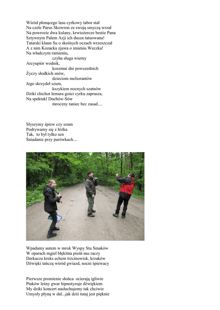 Wśród płonącego lasu cyrkowy tabor stał Na czele Parus Skowron ze swoją smyczą wrzał Na powrozie dwa kulany, krwiożercze bestie Pana Sztywnym Palem Azji ich dusza tatuowana! Tatarski klaun Su o skośnych oczach wrzeszczał A z nim Kozacka zjawa o imieniu Weczka! Na władczym ramieniu, czyha sługa wierny Arcyupiór wodnik, koszmar dni powszednich Życzy słodkich snów, dzieciom meliorantów Jego skrzydeł szum, kszykiem nocnych szatnów Dziki chichot lemura gości cyrku zaprasza, Na spektakl Duchów-Sów mroczny taniec bez zasad.... Słyszymy śpiew czy szum Podrywamy się z łóżka Tak, to był tylko sen Śniadanie przy parówkach.... Wpadamy autem w mrok Wyspy Stu Smaków W oparach mgieł błękitna pieśń nas raczy Derkacza kreks echem trzcinowisk, krzaków Dźwięki tańczą wśród gwiazd, nocni śpiewacy Pierwsze promienie słońca ocierają igliwie Ptaków leśny gwar hipnotyzuje dźwiękiem My dziki koncert nasłuchujemy tak chciwie Umysły płyną w dal...jak dziś tutaj jest pięknie Gwizdy muchołówek wśród listowia igrają Gdzieś z serca lasu dudni dzięcioła werbel Zieleń otulona dźwiękiem przyrody herbem Chórki małych istot wręcz nas upajają Ostatnie tchnienia bez deszczu dnia A na parkingu Conchita Kiełbasa.... Mięsne pierożki śpiewają swą pieśń Wkładką kot, czy też pies Pierożki nucą swą pieśń Czy to kot czy to pies Pierożki nucą swą pieśń Szalone pierożki Szalona pleśń! Kap, kap, kapie deszcz Otula nas zimny dreszcz! Kap, kap, z nieba ciecze Musimy na Mietków lecieć! Kap, kap strugi srogie Gdzie są nasze siewki drogie? Kap, kap...ot ulewa.... Pierwsza, druga, trzecia siewa! Mewa mała, oraz nur Bul...bul..bul.... Królowa na tronie siecze W Barycz już musimy lecieć Bo nam dnia zabraknie znów Remiz, remiz! uf, uf, uf.... W stawie głębokim, którego boki Trzcina porasta wysoka W stanie uniesienia naczesz marzenia Na Clandzie będzie widniało! Tam są biegusy, brodzce, pokusy Niech oczy łzawią na wietrze Sen to czy jawa, praca, zabawa Nie pozwól by to czekało! Kraina Stawów wita nas mile To mała parva, w buczynie chwile Na stawy gnamy, słońce na niebie Nie mamy lerki, kwiczoł w potrzebie... Groblą szybki marsz, wzrok wędruje po tafli Są kaczki, patrz! Nie ma już mżawki Jest bocian czarny i kołuje bielik Koi nas widok lecącej pościeli.... Słońce się mieni na horyzoncie Powili dogasa szalony dzień W półmroku pójdźki delikatny cień Sto trzydzieści siedem na naszym koncie Wybiła północ oto już noc jest Wieczorny chłód, wrzące emocje....
