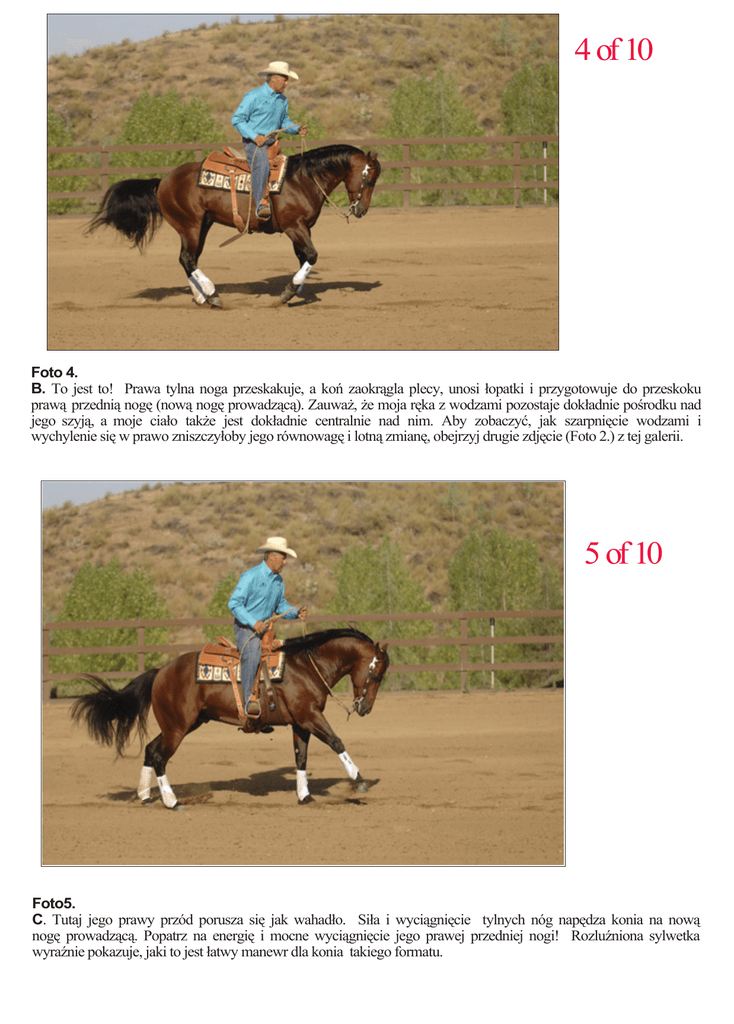 4 of 10 Foto 4. B. To jest to! Prawa tylna noga przeskakuje, a koń zaokrągla plecy, unosi łopatki i przygotowuje do przeskoku prawą przednią nogę (nową nogę prowadzącą). Zauważ, że moja ręka z wodzami pozostaje dokładnie pośrodku nad jego szyją, a moje ciało także jest dokładnie centralnie nad nim. Aby zobaczyć, jak szarpnięcie wodzami i wychylenie się w prawo zniszczyłoby jego równowagę i lotną zmianę, obejrzyj drugie zdjęcie (Foto 2.) z tej galerii. 5 of 10 Foto5. C. Tutaj jego prawy przód porusza się jak wahadło. Siła i wyciągnięcie tylnych nóg napędza konia na nową nogę prowadzącą. Popatrz na energię i mocne wyciągnięcie jego prawej przedniej nogi! Rozluźniona sylwetka wyraźnie pokazuje, jaki to jest łatwy manewr dla konia takiego formatu. ĆWICZENIE „GETTING IT STRAIGHT” Gdy skupiasz się na tym, by koń był prosty przed, podczas i po lotnej zmianie nogi , usuwasz problemy. Koń będzie trzymał łopatkę pionowo, w równowadze, co umożliwi mu uniesienie jej, więc tylną nogą po tej stronie może zamachnąć się do zmiany. Tego ćwiczenia nauczyłem się od Ala Duninga. Stosując je nauczysz swojego konia pozostawania w osi i równowadze oraz w dłuższym “zawieszeniu” w momencie, gdy będzie musiał zmienić prowadzącą nogę. Wykonując ćwiczenie będziesz robił two-track po prostej linii między dwoma drągami. Te drągi pomogą nie tylko utrzymać konia prosto, ale utworzą szablon prostoty dla ciebie i także tobie pomogą siedzieć prosto. Dlaczego two-track ? Manewr ten z jednoczesnym ruchem w przód i bok jest skuteczny, ponieważ prostuje konia ucząc go zaokrąglania pleców i podniesienia łopatek w momencie ustępowania od łydki. W efekcie pozwala to koniowi na łatwą zmianę nogi. UWAGA: To ćwiczenie jest dla zaawansowanych, gdyż przy jego wykonywaniu łatwo przestraszyć lub zdezorientować konia. Przed wykonaniem należy sie upewnić, że obydwoje - koń i jeździec rozumieją podstawy lotnej zmiany nogi a koń bez problemów ustepuje od łydki zarówno w ruchu do przodu jak i w bok. Jeżeli jeszcze nie osiągnąłeś tego poziomu, popracuj z renomowanym trenerem (PRO), aż będziesz gotów, zanim zabierzesz się do tego ćwiczenia. 6 of 10 Foto 6. 1. Zademonstruję lotną zmianę nogi z lewej na prawą (aby wykonać lotną zmianę w drugą stronę z prawej nogi na lewą, odwróć opisywane sygnały). Połóż dwa drągi na środku areny w odległości ok. 6 9 metrów od siebie. Ustal galop na lewą nogę. Skieruj konia na pół okręgu poniżej pierwszego drąga. Wyjechałeś z okręgu, więc jego ciało jest równolegle do drąga, jak widać na zdjęciu. Trzymaj go prosto pomiędzy wodzami i nogami, utrzymując nieznaczny kontakt swoją prawą nogą, by przez nacisk utrzymać jego lewą nogę prowadzącą. 7 of 10 Foto 7. 2. Gdy koń minie pierwszy drąg, zwiększaj nacisk prawą nogą, by wysłać go bokiem w lewo. Nie ciągnij jego głowy w tym kierunku. Zamiast tego nieznacznie unieś lewą wodzę, by utrzymać jego lewą łopatkę uniesioną, gdy porusza się w lewo. Użyj pomocy na ile to konieczne, by utrzymać konia wyprostowanego (zauważ, że ręka z wodzami jest na środku nad szyją konia). Pozostań w równowadze siedź na środku nie przechylając się.