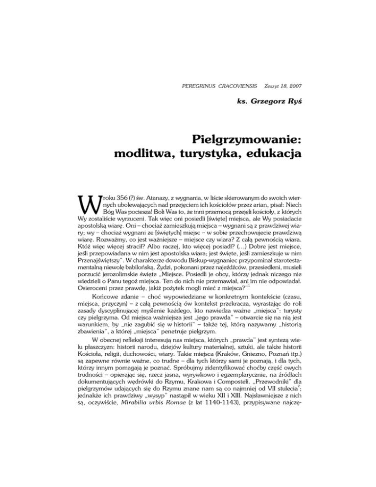 PEREGRINUS CRACOVIENSIS Zeszyt 18, 2007 ks. Grzegorz Ryś Pielgrzymowanie: modlitwa, turystyka, edukacja W roku 356 (?) św. Atanazy, z wygnania, w liście skierowanym do swoich wiernych ubolewających nad przejęciem ich kościołów przez arian, pisał: Niech Bóg Was pociesza! Boli Was to, że inni przemocą przejęli kościoły, z których Wy zostaliście wyrzuceni. Tak więc oni posiedli [święte] miejsca, ale Wy posiadacie apostolską wiarę. Oni – chociaż zamieszkują miejsca – wygnani są z prawdziwej wiary; wy – chociaż wygnani ze [świętych] miejsc – w sobie przechowujecie prawdziwą wiarę. Rozważmy, co jest ważniejsze – miejsce czy wiara? Z całą pewnością wiara. Któż więc więcej stracił? Albo raczej, kto więcej posiadł? (…) Dobre jest miejsce, jeśli przepowiadana w nim jest apostolska wiara; jest święte, jeśli zamieszkuje w nim Przenajświętszy”. W charakterze dowodu Biskup-wygnaniec przypominał starotestamentalną niewolę babilońską. Żydzi, pokonani przez najeźdźców, przesiedleni, musieli porzucić jerozolimskie święte „Miejsce. Posiedli je obcy, którzy jednak niczego nie wiedzieli o Panu tegoż miejsca. Ten do nich nie przemawiał, ani im nie odpowiadał. 1 Osieroceni przez prawdę, jakiż pożytek mogli mieć z miejsca?” Końcowe zdanie – choć wypowiedziane w konkretnym kontekście (czasu, miejsca, przyczyn) – z całą pewnością ów kontekst przekracza, wyrastając do roli zasady dyscyplinującej myślenie każdego, kto nawiedza ważne „miejsca”: turysty czy pielgrzyma. Od miejsca ważniejsza jest „jego prawda” – otwarcie się na nią jest warunkiem, by „nie zagubić się w historii” – także tej, którą nazywamy „historią zbawienia”, a której „miejsca” penetruje pielgrzym. W obecnej refleksji interesują nas miejsca, których „prawda” jest syntezą wielu płaszczyzn: historii narodu, dziejów kultury materialnej, sztuki, ale także historii Kościoła, religii, duchowości, wiary. Takie miejsca (Kraków, Gniezno, Poznań itp.) są zapewne równie ważne, co trudne – dla tych którzy sami je poznają, i dla tych, którzy innym pomagają je poznać. Spróbujmy zidentyfikować choćby część owych trudności – opierając się, rzecz jasna, wyrywkowo i egzemplarycznie, na źródłach dokumentujących wędrówki do Rzymu, Krakowa i Composteli. „Przewodniki” dla 2 pielgrzymów udających się do Rzymu znane nam są co najmniej od VII stulecia ; jednakże ich prawdziwy „wysyp” nastąpił w wieku XII i XIII. Najsławniejsze z nich są, oczywiście, Mirabilia urbis Romae (z lat 1140-1143), przypisywane najczę- ks. Grzeogorz Ryś 6 3 ściej Benedyktowi, kanonikowi watykańskiej bazyliki św. Piotra , oraz Narracio de mirabilibus urbis Romae mistrza Grzegorza, najpewniej Anglika, przebywającego 4 w Rzymie za czasów pontyfikatu Grzegorza IX (1227-41) . Ich dane warto wszakże 5 skonfrontować z informacjami podanymi np. przez Wilhelma z Malmesbury czy 6 Marcina Polaka . Mirabilia – zarówno Benedykta, jak i mistrza Grzegorza – od dawna przykuwają uwagę historyków, a to z racji na ich całkowitą koncentrację na rzymskim antyku, aż po wirtualne wykluczenie jakiegokolwiek zainteresowania Rzymem chrześcijańskim. Kościoły (nawet takie, jak bazyliki św. Piotra czy na Lateranie) są tu wspominane jedynie jako punkty orientacyjne w topografii miasta; watykański obelisk nie jest świadkiem śmierci „Księcia Apostołów”, lecz grobem Cezara (piramis Iulii 7 Cesaris) . Antyczne budowle: termy, świątynie, pałace cesarzy, łuki triumfalne, kolumny i grobowce oraz pogańskie rzeźby z brązu i marmuru zawładnęły całą fascynacją angielskiego duchownego. Ani słowem nie wspomina, by nawiedzał święte miejsca swojej wiary; za to z nie udawanym zawstydzeniem przyznaje się do aż 4-krotnych oględzin kapitolińskiej Wenus: „Z racji na jej piękno i nieznaną mi jakąś magiczną siłę, trzy razy byłem przymuszony, by wracać i ponownie ją oglądać”8. Wilhelmowi z Malmesbury również nieobca jest fascynacja dawną stolicą świata (domina orbis terrarum); jej opis rozpoczyna od obszernego cytatu ze sławnej pieśni Hildeberta z Tours (ok. 1056-1133), Par tibi, Roma, nihil9. Ostatecznie wszakże treściowe dominanty rozkładają się zupełnie inaczej. Bramy Rzymu – u Grzegorza wymienione niemal wyłącznie według swych tradycyjnych nazw (Porta Aurea, Sa10 laria, Flaminea etc.) – tu występują pod swymi chrześcijańskimi odpowiednikami: Cornelia jest zwana „Bramą św. Piotra”, Flaminea – „św. Walentyna”, Salaria – „św. Sylwestra” , a Aurea – „św. Pankracego”. Od bram Wilhelm prowadzi nas do wnętrza miasta, zatrzymując się przy grobach kolejnych męczenników i wymieniając wszystkie ważniejsze kościoły pielgrzymkowe. W stosunkowo krótkim tekście zostaje wymienionych z imienia aż 177 świętych, z dodaniem, iż obok nich spoczywa w Rzymie ich nieprzeliczone mnóstwo. To one stanowią prawdziwe „rzymskie sanktuaria” oraz zgromadzone na ziemi dowody bożej miłości do ludzi (haec sunt in 11 terris divina pignora) . O pogańskich mirabilia Romae Wilhelm nic nie wie. Za syntezę Wilhelma i mistrza Grzegorza można by uznać opis Marcina Polaka. Jego Rzym to: cesarskie pałace, pogańskie świątynie, starożytne budowle publiczne (np. byblioteca publica) i rzeźby (statua aurea), ale także katakumby i miejsce sławnego dialogu Piotra z Jezusem (quo vadis). Znane od czasów antycznych drogi prowadzą do bazylik sepulkralnych: nomentana ad sanctam agnetem; salaria ad sanctam sabinam. Trudno nie postawić pytania o źródła tak różnej optyki w postrzeganiu tego samego miejsca. Co sprawia, że uwaga jednego przewodnika jest w całości skoncentrowana na kwestiach, które w ogóle nie znajdują się w polu widzenia drugiego? Zapewne, jedną z przyczyn tej różnorodności jest kontekst (historyczny, kulturalny, religij