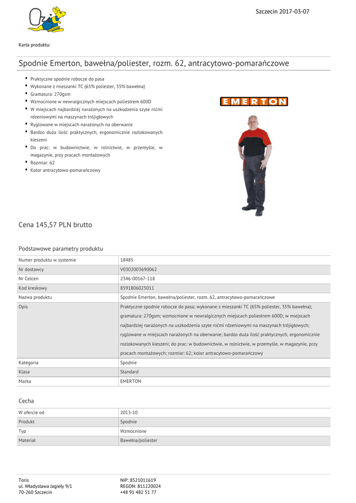Szczecin 2017-03-07 Karta produktu: Spodnie Emerton, bawełna/poliester, rozm. 62, antracytowo-pomarańczowe Praktyczne spodnie robocze do pasa Wykonane z mieszanki TC (65% poliester, 35% bawełna) Gramatura: 270gsm Wzmocnione w newralgicznych miejscach poliestrem 600D W miejscach najbardziej narażonych na uszkodzenia szyte nićmi rdzeniowymi na maszynach trójigłowych Ryglowane w miejscach narażonych na oberwanie Bardzo duża ilość praktycznych, ergonomicznie rozlokowanych kieszeni Do prac: w budownictwie, w rolnictwie, w przemyśle, w magazynie, przy pracach montażowych Rozmiar: 62 Kolor antracytowo-pomarańczowy Cena 145,57 PLN brutto Podstawowe parametry produktu Numer produktu w systemie 18485 Nr dostawcy V0302003690062 Nr Celcen 2346-00167-118 Kod kreskowy 8591806025011 Nazwa produktu Spodnie Emerton, bawełna/poliester, rozm. 62, antracytowo-pomarańczowe Opis Praktyczne spodnie robocze do pasa; wykonane z mieszanki TC (65% poliester, 35% bawełna); gramatura: 270gsm; wzmocnione w newralgicznych miejscach poliestrem 600D; w miejscach najbardziej narażonych na uszkodzenia szyte nićmi rdzeniowymi na maszynach trójigłowych; ryglowane w miejscach narażonych na oberwanie; bardzo duża ilość praktycznych, ergonomicznie rozlokowanych kieszeni; do prac: w budownictwie, w rolnictwie, w przemyśle, w magazynie, przy pracach montażowych; rozmiar: 62; kolor antracytowo-pomarańczowy Kategoria Spodnie Klasa Standard Marka EMERTON Cecha W ofercie od 2013-10 Produkt Spodnie Typ Wzmocnione Materiał Bawełna/poliester Toris ul. Władysława Jagieły 9/1 70-260 Szczecin NIP: 8521011619 REGON: 811220024 +48 91 482 51 77 Szczecin 2017-03-07 Karta katalogowa produktu cd. Spodnie Emerton, bawełna/poliester, rozm. 62, antracytowo-pomarańczowe Kolor Kolor Antracytowy/pomarańczowy Wymiary Gramatura (g/m2) 270 Rozmiar 62 Wspólny słownik zamówień CPV 35113400-3 Certyfikaty Hit Hit Nowy produkt w ofercie Standard Serdecznie zapraszamy do współpracy Toris zespół. Toris ul. Władysława Jagieły 9/1 70-260 Szczecin NIP: 8521011619 REGON: 811220024 +48 91 482 51 77
