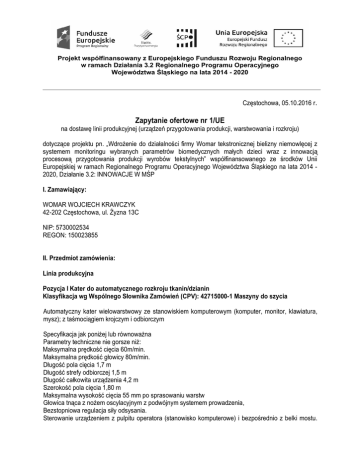 Projekt współfinansowany z Europejskiego Funduszu Rozwoju Regionalnego w ramach Działania 3.2 Regionalnego Programu Operacyjnego Województwa Śląskiego na lata 2014 - 2020 Częstochowa, 05.10.2016 r. Zapytanie ofertowe nr 1/UE na dostawę linii produkcyjnej (urządzeń przygotowania produkcji, warstwowania i rozkroju) dotyczące projektu pn. „Wdrożenie do działalności firmy Womar tekstronicznej bielizny niemowlęcej z systemem monitoringu wybranych parametrów biomedycznych małych dzieci wraz z innowacją procesową przygotowania produkcji wyrobów tekstylnych” współfinansowanego ze środków Unii Europejskiej w ramach Regionalnego Programu Operacyjnego Województwa Śląskiego na lata 2014 2020, Działanie 3.2: INNOWACJE W MŚP I. Zamawiający: WOMAR WOJCIECH KRAWCZYK 42-202 Częstochowa, ul. Żyzna 13C NIP: 5730002534 REGON: 150023855 II. Przedmiot zamówienia: Linia produkcyjna Pozycja I Kater do automatycznego rozkroju tkanin/dzianin Klasyfikacja wg Wspólnego Słownika Zamówień (CPV): 42715000-1 Maszyny do szycia Automatyczny kater wielowarstwowy ze stanowiskiem komputerowym (komputer, monitor, klawiatura, mysz); z taśmociągiem krojczym i odbiorczym Specyfikacja jak poniżej lub równoważna Parametry techniczne nie gorsze niż: Maksymalna prędkość cięcia 60m/min. Maksymalna prędkość głowicy 80m/min. Długość pola cięcia 1,7 m Długość strefy odbiorczej 1,5 m Długość całkowita urządzenia 4,2 m Szerokość pola cięcia 1,80 m Maksymalna wysokość cięcia 55 mm po sprasowaniu warstw Głowica tnąca z nożem oscylacyjnym z podwójnym systemem prowadzenia, Bezstopniowa regulacja siły odsysania. Sterowanie urządzeniem z pulpitu operatora (stanowisko komputerowe) i bezpośrednio z belki mostu. Chłodzenie noża Podgrzewane wiertło Pozycja II Zestaw do automatycznego warstwowania dzianin Klasyfikacja wg Wspólnego Słownika Zamówień (CPV): 42715000-1 Maszyny do szycia Zestaw do automatycznego warstwowania dzianin złożony z: II.1 Warstwowarka automatyczna Specyfikacja jak poniżej lub równoważna: Parametry techniczne nie gorsze niż: Szerokość robocza: 180 cm, Wysokość warstwowania: 20 cm, Maksymalna masa rolki: 100 kg. - Podawanie tkaniny na pasie podająco-stabilizującym, - Automatyczny odkrawacz warstw, - Płynna regulacja prędkości odcinania, - Regulacja szerokości odcinania, - Ruchoma klamra końcowa, - Platforma operatora z prowadnicami, - Kompletna instalacja elektryczna. II.2 Ładowarka rolek tkaniny/dzianiny z powierzchni podłogi na maszynę Specyfikacja jak poniżej lub równoważna: Parametry techniczne nie gorsze niż: - szerokość robocza 180 cm, - długość: 0,8 m, - maksymalna masa rolki: 100 kg. II.3 Stół do warstwowania mechanicznego z taśmą podającą conveyor Specyfikacja jak poniżej lub równoważna: Parametry techniczne nie gorsze niż: - długość całkowita: 10,5 mb - długość taśmy podającej: 8 mb - szerokość robocza: 180 cm Pozycja III Komputerowy system przygotowania produkcji Klasyfikacja wg Wspólnego Słownika Zamówień (CPV): 48321000-8 Pakiety oprogramowania i systemy informatyczne Komputerowy system przygotowania produkcji złożony z: III.1 Oprogramowanie CAD Specyfikacja jak poniżej lub równoważna: licencja na 1 stanowisko Moduły: Moduł do digitalizacji, projektowania, stopniowania i modyfikacji szablonów, Moduł do tworzenia układów kroju, Moduł do optymalizacji procesu krojenia. III.2 Digitizer Specyfikacja jak poniżej lub równoważna: Parametry techniczne nie gorsze niż: DIGITIZER A0 48”x36” ( pole robocze: 91x122cm), Precyzja urządzenia: 0,200 mm, Rozdzielczość 2540 LPI. III.3 Ploter Specyfikacja jak poniżej lub równoważna: Parametry techniczne nie gorsze niż: Maksymalna szerokość wydruku:180cm; Prędkość plotowania: 70 m2/h; Rozdzielczość plotowania: 300 dpi; Dwie głowice atramentowe Podawanie papieru: rolka podawcza, automatyczny odbiór papieru Automatyczne czyszczenie głowic III.4 Zestaw komputerowy ( komputer, monitor, klawiatura, mysz ) Specyfikacja jak poniżej lub równoważna: Parametry techniczne nie gorsze niż: • procesor klasy Intel Core i5 lub równoważny, • 500 GB pojemność dysku, • 4GB pamięci RAM, • 3,4 GHz częstotliwość taktowanie procesora, • system operacyjny, • Monitor LCD 23”. Zamawiający dopuszcza możliwość składania ofert częściowych na poszczególne pozycje zapytania. III. Warunki udziału w postępowaniu: III.1 O udzielenie zamówienia mogą ubiegać się Oferenci, którzy zaakceptowali bez zastrzeżeń wszystkie postanowienia niniejszego zapytania ofertowego. III.2 Nie jest dopuszczalne składanie ofert przez podmioty, które powiązane są z Zamawiającym lub osobami upoważnionymi do zaciągania zobowiązań w imieniu Zamawiającego lub osobami wykonującymi w imieniu Zamawiającego czynności związane z przygotowaniem i przeprowadzeniem procedury wyboru Wykonawcy osobowo lub kapitałowo, w szczególności przez: a) uczestnictwo w spółce jako wspólnik spółki cywilnej lub spółki osobowej, b) posiadanie co najmniej 10 % udziałów lub akcji, c) pełnienie funkcji członka organu nadzorczego lub zarządzającego, prokurenta, pełnomocnika, d) pozostawanie w związku małżeńskim, w stosunku pokrewieństwa lub powinowactwa w linii prostej, pokrewieństwa drugiego stopnia lub powinowactwa drugiego stopnia w linii bocznej lub w stosunku przysposobienia, opieki lub kurateli. IV. Opis sposobu dokonywania oceny spełniania warunków udziału w postępowaniu: 1. W celu potwierdzenia spełniania warunków udziału w postępowaniu, do oferty należy dołączyć: Oświadczenie o spełnieniu warunków udziału w postępowaniu, stanowiące załącznik nr 1 do niniejszego zapytania ofertowego. 2. Ocena spełnienia warunków udziału w postępowaniu zostanie dokonana na podstawie przedstawionego przez Oferenta oświadczenia określonego w punkcie IV.1, zgodnie z formułą SPEŁNIA/ NIE SPEŁNIA. 3. Niespe