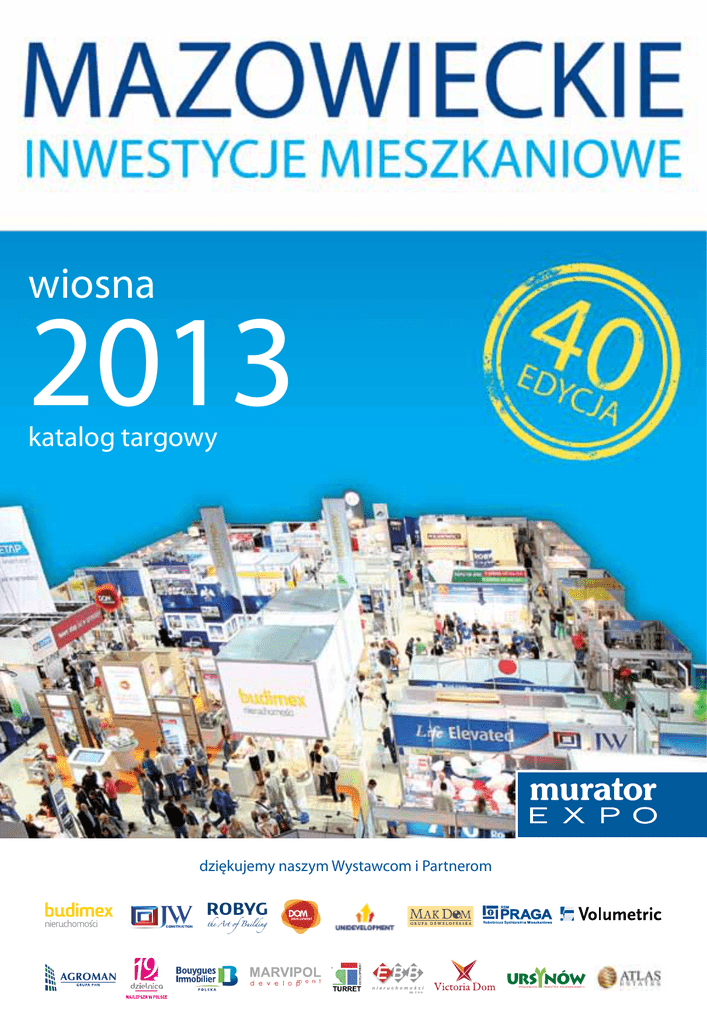 wiosna 2013 katalog targowy dziękujemy naszym Wystawcom i Partnerom Spis Treści Targi Mieszkaniowe Nowy DOM, Nowe MIESZKANIE 2i3 marca Opis zastosowanych piktogramów 2013 Partnerzy Targów 6 łącze internetowe Słowo Wstępne 8 parking Program Targów 11 Miesięcznik „Murator” poleca 12 recepcja Miesięcznik „M jak Mieszkanie” poleca 18 plac zabaw dla dzieci Spis Wystawców 26 ochrona całodobowa Współpraca 44 Prezentacje pozostałych inwestycji 52 teren ogrodzony winda telefon fitness usługi w budynku tv kablowa własna kotłownia basen Partnerzy Targów Patronat Honorowy Minister Transportu, Budownictwa i Gospodarki Morskiej – Sławomir Nowak Marszałek Województwa Mazowieckiego – Adam Struzik Warszawskie Stowarzyszenie Pośredników w Obrocie Nieruchomościami – Prezes Marek Kunicki Polska Federacja Stowarzyszeń Rzeczoznawców Majątkowych – Prezydent Krzysztof Bratkowski Polska Federacja Rynku Nieruchomości – Prezydent Leszek A. Hardek Partner Patronat Medialny 6 Partnerzy Targów Współpraca Medialna Patron Radiowy Organizator Sali Zabaw Partner Internetowy 7 Słowo Wstępne Szanowni Państwo, wiosenna edycja Targów Mieszkaniowych Nowy DOM Nowe MIESZKANIE jest okazją do obejrzenia aktualnej oferty mieszkaniowej oraz pokazania najwyższych standardów w zakresie projektowania i zarządzania budynkami. Przygotowana w ministerstwie nowelizacja ustawy o wyrobach budowlanych, związana z nowymi, zmienionymi zasadami wprowadzania wyrobów do obrotu i ich udostępniania na rynku unijnym, powinna poprawić skuteczność i przejrzystość przepisów dotyczących wyrobów budowlanych z jednoczesnym ograniczeniem ich uciążliwości dla małych i średnich przedsiębiorstw. W przygotowanej przez Ministerstwo Transportu, Budownictwa i Gospodarki Morskiej nowej ustawie o charakterystyce energetycznej budynków zwróciliśmy uwagę na praktyczny aspekt zwiększenia efektywności energetycznej budynków - pomoc użytkownikom w ograniczeniu kosztów zużycia energii pierwotnej. Janusz Żbik Podsekretarz Stanu Ministerstwo Transportu, Budownictwa i Gospodarki Morskiej Trwają prace nad kompleksową regulacją procesu inwestycyjno-budowlanego. W tym celu powołana została Komisja Kodyfikacyjna Prawa Budowlanego. Do prac nad wszystkimi prowadzonymi w ministerstwie projektami zapraszam środowisko budowlane. Organizatorom Targów i wystawcom dziękuję za przygotowanie ciekawych propozycji i projektów ekspozycyjnych dla zwiedzających. Wszystkim uczestnikom Targów życzę owocnych spotkań z klientami, a także by prezentowane nowoczesne rozwiązania i technologie znalazły zastosowanie w ofercie rynkowej. Szanowni Państwo, serdecznie witam na 40. Targach Mieszkaniowych Nowy DOM Nowe MIESZKANIE. Ta cykliczna impreza organizowana przez spółkę Murator EXPO, która należy do ścisłej czołówki organizatorów targów w Polsce, to niezwykle cenne i ważne przedsięwzięcie. Cieszę się, że mogłem objąć nad nim po raz kolejny patronat honorowy. Targi Nowy DOM Nowe MIESZKANIE, odbywające się w Warszawie, od lat skupiają najbardziej liczące się na rynku firmy i instytucje związane z sektorem nieruchomości oraz przyciągają rzesze indywidualnych inwestorów zainteresowanych kupnem domu lub mieszkania. Podczas marcowej edycji imprezy zaprezentuje się blisko 200 wystawców: znanych i cenionych deweloperów, spółdzielni mieszkaniowych, pośredników w obrocie nieruchomościami oraz banków. Targom towarzyszyć będzie również konferencja zawodowa Warszawskiego Stowarzyszenia Pośredników w Obrocie Nieruchomościami. Adam Struzik Marszałek Województwa Mazowieckiego Zwiedzający będą mieli okazję uczestniczyć w spotkaniach z inspektorem nadzoru budowlanego oraz innymi niezależnymi ekspertami i doradcami, którzy opowiedzą m.in. o klauzulach niedozwolonych w umowach deweloperskich, usuwaniu negatywnych wpisów w rejestrach bankowych i konsumenckich, jak również o bezpiecznym kupowaniu na rynku wtórnym i pierwotnym oraz rozliczeniach podatkowych przy zakupie i sprzedaży nieruchomości. Na gości czekać będą także liczne promocje, rabaty i inne atrakcje. Targi Mieszkaniowe firmy Murator EXPO są bardzo potrzebne i zasługują na uznanie. Udział w tego typu wydarzeniach umożliwia bowiem Polakom poszerzanie fachowej wiedzy i ułatwia im podejmowanie w sposób coraz bardziej świadomy ważnych i odpowiedzialnych decyzji związanych z kupnem wymarzonego mieszkania lub domu. Wierzę, że impreza po raz kolejny okaże się sukcesem i spełni oczekiwania zarówno organizatorów, jak i wystawców oraz zwiedzających. Życzę Państwu udanych Targów i zawarcia samych korzystnych transakcji. 8 Słowo Wstępne Szanowni Państwo, Drodzy Goście Targów Nowy DOM Nowe MIESZKANIE, to już 40 edycja tej znakomitej imprezy, która trwale wpisała się już w kalendarz stołecznych spotkań poświęconych nieruchomościom. Jak za każdym razem, tak i teraz Warszawskie Stowarzyszenie Pośredników w Obrocie Nieruchomościami (WSPON) zapewnia gościom wsparcie w postaci dyżurów specjalistów-członków Stowarzyszenia, którzy przez 2 dni targowe z przyjemnością odpowiedzą na każde pytanie dotyczące rynku nieruchomości. Gorąco zachęcam do odwiedzenia naszego stanowiska, na którym zaprezentujemy także zalety Systemu MLS, opartego na umowach na wyłączność. Marek Kunicki Prezes Zarządu Warszawskiego Stowarzyszenia Pośredników w Obrocie Nieruchomościami Tej edycji Targów towarzyszy dużo emocji politycznych. Zapowiedziana rok temu tzw. „de-regulacja” zawodów doprowadzona została do etapu prac sejmowych. Mimo zgłoszenia przez środowisko, a także licznych ekspertów, profesorów wyższych uczelni oraz niektórych polityków zastrzeżeń do proponowanego zakresu zmian przepisów dotyczących wykonywania usług pośrednictwa (a także wielu innych zawodów, w tym notariusza, zarządcy) minister Gowin doprowadził do skierowania projektu do 