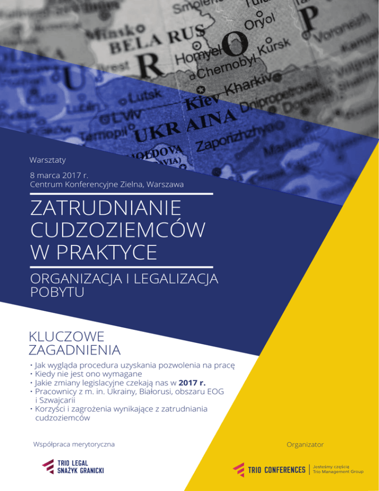 Warsztaty 8 marca 2017 r. Centrum Konferencyjne Zielna, Warszawa ZATRUDNIANIE CUDZOZIEMCÓW W PRAKTYCE ORGANIZACJA I LEGALIZACJA POBYTU KLUCZOWE ZAGADNIENIA • Jak wygląda procedura uzyskania pozwolenia na pracę • Kiedy nie jest ono wymagane • Jakie zmiany legislacyjne czekają nas w 2017 r. • Pracownicy z m. in. Ukrainy, Białorusi, obszaru EOG i Szwajcarii • Korzyści i zagrożenia wynikające z zatrudniania cudzoziemców Współpraca merytoryczna Organizator ZATRUDNIANIE CUDZOZIEMCÓW W PRAKTYCE ORGANIZACJA I LEGALIZACJA POBYTU Serdecznie zapraszamy do udziału w warsztatach, dzięki którym zdobędą Państwo kompleksową wiedzę na temat zasad sprowadzania pracowników z zagranicy i legalizacji ich pobytu w kraju. KLUCZOWE ZAGADNIENIA SPOTKANIA: • Jak wygląda procedura wizowa w praktyce • W jakich przypadkach zezwolenie na pracę nie jest wymagane • Jakie są typy zezwoleń na pracę i jak wygląda proces ich pozyskiwania oraz przedłużania • Jakie korzyści i zagrożenia wiążą się z zatrudnianiem cudzoziemców Warsztaty powstały przy współpracy merytorycznej z Kancelarią Trio Legal Snażyk Granicki. Tomasz Snażyk – Partner, Trio Legal Snażyk Granicki Jest ekspertem w dziedzinach umów inwestycyjnych, M&A, project finance, prawie spółek, a także wdrożeń projektów R&D oraz projektów energetycznych. Na co dzień doradza inwestorom, funduszom Venture Capital oraz założycielom startup-ów. Doradzał przy wielu inwestycjach, reprezentując fundusze Venture Capital, aniołów biznesu oraz założycieli startup-ów. Wcześniej pracował m.in. w butikowej kancelarii w San Francisco oraz kancelarii Gide, gdzie zajmował się m. in. obsługą prawną projektów inwestycyjnych, w tym projektów crowdfundingowych, postępowaniami gospodarczymi oraz obsługą korporacyjną spółek. Pełnił również funkcję głównego doradcy w polskiej spółce zajmującej się energią odnawialną oraz doradzał amerykańskiej spółce lotniczej aktywnie działającej w rejonie Europy Środkowo-Wschodniej. Damian Szczerbaty – Prawnik, Trio Legal Snażyk Granicki Specjalizuje się w tematyce związanej z procesami inwestycyjnymi, prawem spółek, prawem własności intelektualnej oraz ochroną danych osobowych. W kancelarii zajmuje się obsługą funduszy VC, branży e-commerce oraz spółek technologicznych, m.in. z sektora kosmicznego. Swoje doświadczenie zawodowe zdobywał jako prawnik wewnętrzny w Grupie Bio Alians, gdzie odpowiadał m.in. za procesy inwestycyjne, monitoring regulacyjny i obsługę korporacyjną. Później jako szef biura jednego z renomowanych think tanków zajmował się m.in. koordynacją projektów legislacyjnych. Przed dołączeniem do zespołu Kancelarii, pracował w jednej z renomowanych warszawskich kancelarii, gdzie zajmował się m. in. obsługą prawną projektów inwestycyjnych, w tym projektów crowdfundingowych, postępowaniami gospodarczymi oraz obsługą korporacyjną spółek. Bartosz Tokajuk – Prawnik, Trio Legal Snażyk Granicki Specjalizuje się w prawie korporacyjnym oraz prawie rynku kapitałowego, a w szczególności w obsłudze prawnej transakcji M&A, badaniach due diligence oraz procesach inwestycyjnych. Ponadto do jego zadań należy bieżąca obsługa korporacyjna spółek, m.in. w sprawach z zakresu ochrony danych osobowych, prawa pracy oraz umów prawa cywilnego. Swoje zainteresowania zawodowe skupia wokół prawa nowych technologii oraz procedur związanych z legalizacją pobytu i zatrudnienia cudzoziemców. Doświadczenie prawne zdobywał min. w Prokuraturze Rejonowej dla Warszawy Pragi-Północ oraz w Prokuraturze Rejonowej w Siemiatyczach. Karina Choroś-Wrzeszcz – Niezależny Ekspert Od ponad 8 lat prowadzi działalność związaną z legalizacją pobytu cudzoziemców w całej Polsce, współpracuje z dużymi firmami, zatrudniającymi masowo cudzoziemców (od 20 do 180 osób). Od 2008 roku pośredniczyła w procedurze legalizacji ponad 600 cudzoziemców z 18 krajów. 8 marca 2017r., Warszawa Program warsztatów Warsztaty poprowadzą: Tomasz Snażyk, Partner, Trio Legal Snażyk Granicki Damian Szczerbaty, Prawnik, Trio Legal Snażyk Granicki Bartosz Tokajuk, Prawnik, Trio Legal Snażyk Granicki Karina Wrzeszcz, Niezależny Ekspert 9:30 Poranna kawa, rejestracja uczestników Legalny pobyt w Polsce, a legalna praca • • Wizy i procedura wizowa Kiedy zezwolenie na pracę nie jest wymagane: o grupy zwolnione z obowiązku posiadania zezwolenia na pracę o oświadczenie o zamiarze powierzenia pracy (Armenia, Białoruś, Gruzja, Mołdawia, Federacja Rosyjska i Ukraina) przerwa kawowa Typy zezwoleń na pracę • • • Procedura ubiegania się o zezwolenie Test rynku pracy Przedłużenie zezwolenia lunch Zezwolenie na pobyt (zezwolenie zintegrowane) • • Typy zezwoleń na pobyt czasowy Zezwolenie na pobyt rezydenta długoterminowego UE 14:40 Praca i pobyt obywateli EOG i Szwajcarii 15:30 przerwa kawowa 15:45 Korzyści i zagrożenia wynikające z zatrudniania cudzoziemców • • • • • • 16:30 www.trioconferences.pl Pobyt i praca obywateli niektórych innych państw Planowane zmiany legislacyjne Jak wygląda proces zatrudniania – legalizacja pobytu pracownika w praktyce z uwzględnieniem najnowszych zmian prawnych Analiza ekonomiczna – porównanie stawek w rożnych województwach, porównanie efektywności Analiza ryzyka - brak właściwych kwalifikacji, wykorzystanie wizy pracowniczej do wjazdu na teren Unii, problem używek Proces przedłużania uprawnień Zakończenie warsztatów Warsztaty ZATRUDNIANIE CUDZOZIEMCÓW W PRAKTYCE ORGANIZACJA I LEGALIZACJA POBYTU 8 marca 2017 r. Centrum Konferencyjne Zielna, Warszawa FORMULARZ ZGŁOSZENIOWY PIERWSZA OSOBA Stanowisko................................................................................................................... Wyślij DZIŚ ZGŁOSZENIE NA NUMER FAKSU Departament..................................................................