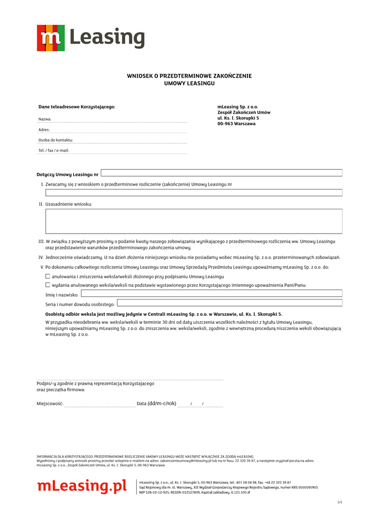 WNIOSEK O PRZEDTERMINOWE ZAKOŃCZENIE UMOWY LEASINGU Dane teleadresowe Korzystającego: mLeasing Sp. z o.o. Zespół Zakończeń Umów ul. Ks. I. Skorupki 5 00-963 Warszawa Nazwa: Adres: Osoba do kontaktu: Tel. / fax / e-mail: Dotyczy Umowy Leasingu nr I. Zwracamy się z wnioskiem o przedterminowe rozliczenie (zakończenie) Umowy Leasingu nr II. Uzasadnienie wniosku: III. W związku z powyższym prosimy o podanie kwoty naszego zobowiązania wynikającego z przedterminowego rozliczenia ww. Umowy Leasingu oraz przedstawienie warunków przedterminowego zakończenia umowy. IV. Jednocześnie oświadczamy, iż na dzień złożenia niniejszego wniosku nie posiadamy wobec mLeasing Sp. z o.o. przeterminowanych zobowiązań. V. Po dokonaniu całkowitego rozliczenia Umowy Leasingu oraz Umowy Sprzedaży Przedmiotu Leasingu upoważniamy mLeasing Sp. z o.o. do: anulowania i zniszczenia weksla/weksli złożonego przy podpisaniu Umowy Leasingu wydania anulowanego weksla/weksli na podstawie wystawionego przez Korzystającego imiennego upoważnienia Pani/Panu: Imię i nazwisko: Seria i numer dowodu osobistego: Osobisty odbiór weksla jest możliwy jedynie w Centrali mLeasing Sp. z o.o. w Warszawie, ul. Ks. I. Skorupki 5. W przypadku nieodebrania ww. weksla/weksli w terminie 30 dni od daty uiszczenia wszelkich należności z tytułu Umowy Leasingu, niniejszym upoważniamy mLeasing Sp. z o.o. do zniszczenia ww. weksla/weksli, zgodnie z wewnętrzną procedurą niszczenia weksli obowiązującą w mLeasing Sp. z o.o. Podpis/-y zgodnie z prawną reprezentacją Korzystającego oraz pieczątka firmowa: Miejscowość: Data (dd/m-c/rok) / / INFORMACJA DLA KORZYSTAJĄCEGO: PRZEDTERMINOWE ROZLICZENIE UMOWY LEASINGU MOŻE NASTĄPIĆ WYŁĄCZNIE ZA ZGODĄ mLEASING. Wypełniony i podpisany wniosek prosimy przesłać wstępnie e-mailem na adres: [email protected] lub na nr faxu: 22 320 39 87, a następnie oryginał pocztą na adres: mLeasing Sp. z o.o., Zespół Zakończeń Umów, ul. Ks. I. Skorupki 5, 00-963 Warszawa 1/1
