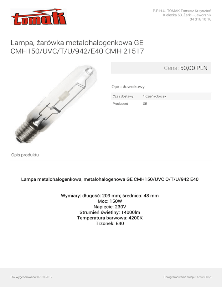 P.P.H.U. TOMAK Tomasz Krzysztoń Kielecka 63, Żarki - Jaworznik 34 316 10 16 Lampa, żarówka metalohalogenkowa GE CMH150/UVC/T/U/942/E40 CMH 21517 Cena: 50,00 PLN Opis słownikowy Czas dostawy 1 dzień roboczy Producent GE Opis produktu Lampa metalohalogenkowa, metalohalogenowa GE CMH150/UVC O/T/U/942 E40 Wymiary: długość: 209 mm; średnica: 48 mm Moc: 150W Napięcie: 230V Strumień świetlny: 14000lm Temperatura barwowa: 4200K Trzonek: E40 Plik wygenerowano: 07-03-2017 Powered by TCPDF (www.tcpdf.org) Oprogramowanie sklepu: AptusShop