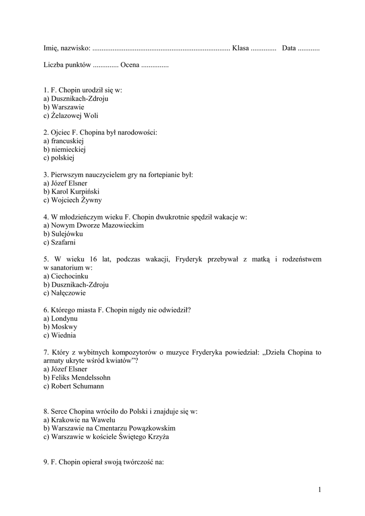 Imię, nazwisko: ........................................................................... Klasa .............. Data ............ Liczba punktów .............. Ocena ............... 1. F. Chopin urodził się w: a) Dusznikach-Zdroju b) Warszawie c) Żelazowej Woli 2. Ojciec F. Chopina był narodowości: a) francuskiej b) niemieckiej c) polskiej 3. Pierwszym nauczycielem gry na fortepianie był: a) Józef Elsner b) Karol Kurpiński c) Wojciech Żywny 4. W młodzieńczym wieku F. Chopin dwukrotnie spędził wakacje w: a) Nowym Dworze Mazowieckim b) Sulejówku c) Szafarni 5. W wieku 16 lat, podczas wakacji, Fryderyk przebywał z matką i rodzeństwem w sanatorium w: a) Ciechocinku b) Dusznikach-Zdroju c) Nałęczowie 6. Którego miasta F. Chopin nigdy nie odwiedził? a) Londynu b) Moskwy c) Wiednia 7. Który z wybitnych kompozytorów o muzyce Fryderyka powiedział: „Dzieła Chopina to armaty ukryte wśród kwiatów”? a) Józef Elsner b) Feliks Mendelssohn c) Robert Schumann 8. Serce Chopina wróciło do Polski i znajduje się w: a) Krakowie na Wawelu b) Warszawie na Cmentarzu Powązkowskim c) Warszawie w kościele Świętego Krzyża 9. F. Chopin opierał swoją twórczość na: 1 a) muzyce klasycznej b) polskiej muzyce ludowej c) muzyce średniowiecznej 10. Ile sonat fortepianowych napisał F. Chopin? a) 3 b) 5 c) 8 11. Ile ballad fortepianowych skomponował F. Chopin? a) 2 b) 4 c) 6 12. Ile koncertów fortepianowych stworzył F. Chopin? a) 2 b) 4 c) 6 13. Gdzie odbywa się Międzynarodowy Konkurs Pianistyczny im. Fryderyka Chopina? a) w Krakowie b) w Poznaniu c) w Warszawie 14. Międzynarodowy Konkurs Pianistyczny im. Fryderyka Chopina odbywa się co: a) 2 lata b) 4 lata c) 5 lat 15. Gdzie znajduje się muzeum F. Chopina? a) w Będominie b) w Krakowie c) w Żelazowej Woli 16. W jakim mieście znajduje się Uniwersytet Muzyczny im. F. Chopina? a) w Katowicach b) w Krakowie c) w Warszawie Klucz 2 1. – c; 2. – a; 3. – c; 4. – c; 5. – b; 6. – b; 7. – c; 8. – c; 9. – b; 10. – a; 11. – b; 12. – a; 13. – c; 14. – c; 15. – c; 16. – c. Opracował Karol Chilewicz 3