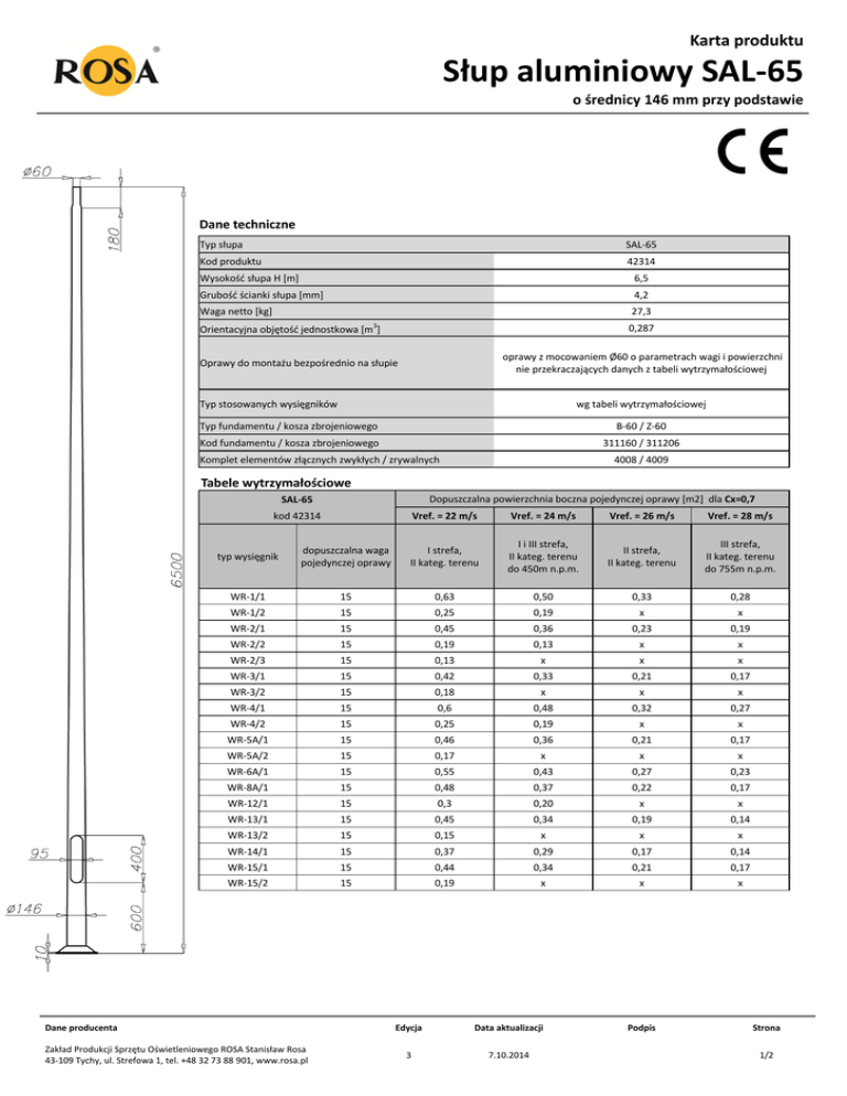 Karta produktu Słup aluminiowy SAL-65 o średnicy 146 mm przy podstawie Dane techniczne Typ słupa SAL-65 Kod produktu 42314 Wysokośd słupa H *m+ 6,5 Grubośd ścianki słupa *mm+ 4,2 Waga netto [kg] 27,3 Orientacyjna objętośd jednostkowa *m3] 0,287 oprawy z mocowaniem Ø60 o parametrach wagi i powierzchni nie przekraczających danych z tabeli wytrzymałościowej Oprawy do montażu bezpośrednio na słupie Typ stosowanych wysięgników wg tabeli wytrzymałościowej Typ fundamentu / kosza zbrojeniowego B-60 / Z-60 Kod fundamentu / kosza zbrojeniowego 311160 / 311206 Komplet elementów złącznych zwykłych / zrywalnych 4008 / 4009 Tabele wytrzymałościowe Dopuszczalna powierzchnia boczna pojedynczej oprawy [m2] dla Cx=0,7 SAL-65 kod 42314 Vref. = 22 m/s Vref. = 24 m/s Vref. = 26 m/s Vref. = 28 m/s typ wysięgnik dopuszczalna waga pojedynczej oprawy I strefa, II kateg. terenu I i III strefa, II kateg. terenu do 450m n.p.m. II strefa, II kateg. terenu III strefa, II kateg. terenu do 755m n.p.m. WR-1/1 15 0,63 0,50 0,33 0,28 WR-1/2 15 0,25 0,19 x x WR-2/1 15 0,45 0,36 0,23 0,19 WR-2/2 15 0,19 0,13 x x WR-2/3 15 0,13 x x x WR-3/1 15 0,42 0,33 0,21 0,17 WR-3/2 15 0,18 x x x WR-4/1 15 0,6 0,48 0,32 0,27 WR-4/2 15 0,25 0,19 x x WR-5A/1 15 0,46 0,36 0,21 0,17 WR-5A/2 15 0,17 x x x WR-6A/1 15 0,55 0,43 0,27 0,23 WR-8A/1 15 0,48 0,37 0,22 0,17 WR-12/1 15 0,3 0,20 x x WR-13/1 15 0,45 0,34 0,19 0,14 WR-13/2 15 0,15 x x x WR-14/1 15 0,37 0,29 0,17 0,14 WR-15/1 15 0,44 0,34 0,21 0,17 WR-15/2 15 0,19 x x x Dane producenta Zakład Produkcji Sprzętu Oświetleniowego ROSA Stanisław Rosa 43-109 Tychy, ul. Strefowa 1, tel. +48 32 73 88 901, www.rosa.pl Edycja Data aktualizacji 3 7.10.2014 Podpis Strona 1/2 Karta produktu Słup aluminiowy SAL-65 o średnicy 146 mm przy podstawie Tabele wytrzymałościowe Dopuszczalna powierzchnia boczna pojedyoczej oprawy *m2+ dla Cx=0,7 SAL-65 kod 42314 Vref. = 22 m/s Vref. = 24 m/s Vref. = 26 m/s Vref. = 28 m/s typ wysięgnik dopuszczalna waga pojedynczej oprawy I strefa, II kateg. terenu I i III strefa, II kateg. terenu do 450m n.p.m. II strefa, II kateg. terenu III strefa, II kateg. terenu do 755m n.p.m. WR-18 15 0,23 0,15 x x WR-31 15 0,17 x x x WR-61 15 0,23 0,14 x x WN-1 15 0,5 (Cx=1) 0,4 (Cx=1) 0,27 (Cx=1) 0,24 (Cx=1) WN-2 15 0,22 (Cx=1) 0,18 (Cx=1) x x WN-21 15 0,2 (Cx=1) 0,16 (Cx=1) x x Dopuszczalna powierzchnia boczna opraw i wysięgników *m2] dla Cx=1 SAL-65 kod 42314 Vref. = 22 m/s Vref. = 24 m/s Vref. = 26 m/s Vref. = 28 m/s Dopuszczalna masa opraw i wysięgników [kg] I strefa, II kateg. terenu I i III strefa, II kateg. terenu do 450m n.p.m. II strefa, II kateg. terenu III strefa, II kateg. terenu do 755m n.p.m. 30 0,52 0,42 0,29 0,25 powierzchnia: aluminium szlifowane anodowanie w 10 kolorach, każdy z możliwością wybłyszczania opcja malowania proszkowego wg RAL (inne farby na życzenie klienta) zabezpieczenie elastomerem w kolorze słupa do wysokości 350 mm (inna wysokośd na życzenie klienta) wnęka standard ROSA pakowanie: włóknina polipropylenowa certyfikat bezpieczeostwa biernego 100NE2 Dane producenta Zakład Produkcji Sprzętu Oświetleniowego ROSA Stanisław Rosa 43-109 Tychy, ul. Strefowa 1, tel. +48 32 73 88 901, www.rosa.pl Edycja Data aktualizacji 3 7.10.2014 Podpis Strona 2/2