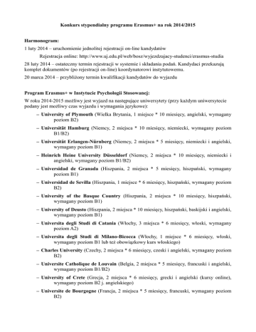 Konkurs stypendialny programu Erasmus+ na rok 2014/2015 Harmonogram: 1 luty 2014 – uruchomienie jednolitej rejestracji on-line kandydatów Rejestracja online: http://www.uj.edu.pl/web/bosz/wyjezdzajacy-studenci/erasmus-studia 28 luty 2014 – ostateczny termin rejestracji w systemie i składania podań. Kandydaci przekazują komplet dokumentów (po rejestracji on-line) koordynatorowi instytutowemu. 20 marca 2014 – przybliżony termin kwalifikacji kandydatów do wyjazdu Program Erasmus+ w Instytucie Psychologii Stosowanej: W roku 2014-2015 możliwy jest wyjazd na następujące uniwersytety (przy każdym uniwersytecie podany jest możliwy czas wyjazdu i wymagania językowe): University of Plymouth (Wielka Brytania, 1 miejsce * 10 miesięcy, angielski, wymagany poziom B2) Universität Hamburg (Niemcy, 2 miejsca * 10 miesięcy, niemiecki, wymagany poziom B1/B2) Universität Erlangen-Nürnberg (Niemcy, 2 miejsca * 5 miesięcy, niemiecki i angielski, wymagany poziom B1) Heinrich Heine University Düsseldorf (Niemcy, 2 miejsca * 10 miesięcy, niemiecki i angielski, wymagany poziom B1/B2) Universidad de Granada (Hiszpania, 2 miejsca * 5 miesięcy, hiszpański, wymagany poziom B1) Universidad de Sevilla (Hiszpania, 1 miejsce * 6 miesięcy, hiszpański, wymagany poziom B2) University of the Basque Country (Hiszpania, 2 miejsca * 10 miesięcy, hiszpański, wymagany poziom B1) University of Deusto (Hiszpania, 2 miejsca * 10 miesięcy, hiszpański, baskijski i angielski, wymagany poziom B1) Universita degli Studi di Catania (Włochy, 3 miejsca * 6 miesięcy, włoski, wymagany poziom A2) Universita degli Studi di Milano-Bicocca (Włochy, 1 miejsce * 6 miesięcy, włoski, wymagany poziom B1 lub też obowiązkowy kurs włoskiego) Charles University (Czechy, 2 miejsca * 6 miesięcy, czeski i angielski, wymagany poziom B2) Universite Catholique de Louvain (Belgia, 2 miejsca * 5 miesięcy, francuski i angielski, wymagany poziom B1/B2) University of Crete (Grecja, 2 miejsca * 6 miesięcy, grecki i angielski (kursy online), wymagany poziom B2 j. angielskiego) Universite de Bourgogne (Francja, 2 miejsca * 5 miesięcy, francuski, wymagany poziom B2) Kryteria kwalifikacji w Instytucie Psychologii Stosowanej: Do zakwalifikowania się do wyjazdu konieczne jest spełnienie wymagań językowych określonych przez uniwersytet, do którego planuje się wyjechać (por. lista powyżej): Kryteria dodatkowe: wyższa niż na poziomie B2 znajomość jednego z języków wykładowych uniwersytetu, na który planuje się wyjechać (C1 – 2 punkty, C2 – 4 punkty) średnia ocen za cały dotychczasowy okres studiów (liczba punktów = średnia ocen * 3, czyli maksymalnie 15 punktów do zdobycia) rok studiów w czasie planowanego wyjazdu (2 rok – 0.25 punktu, 3 rok – 0.5 punktu, 4 rok – 0.75 punktu, 5 rok – 0.5 punktu) udokumentowana dodatkowa działalność w kołach naukowych, samorządzie studenckim, ESN, stowarzyszeniach, działalność no profit, społeczna, charytatywna, działalność na rzecz IPS UJ, praktyki zagraniczne (do 3 punktów) Wymagane dokumenty: podanie o przyznanie stypendium programu Erasmus aktualny życiorys (CV) oraz list motywacyjny listę 3 najbardziej preferowanych miejsc wyjazdu – w formie tabeli, wraz z informacją o poziomie znajomości języka wykładowego (języków wykładowych) na tych uczelniach (w skali A1, A2, B1, B2, C1, C2) wystawione przez Instytut Psychologii Stosowanej potwierdzenie średniej ocen za cały dotychczasowy okres studiów zaświadczenia o poziomie znajomości języków obcych – najlepiej wystawione przez Jagiellońskie Centrum Językowe (ewentualnie ze szkoły językowej, certyfikaty językowe, matura) potwierdzenie(a) działalności dodatkowej Ważne informacje dla studentów wyjeżdżających na program Erasmus+: wybierając kursy do zrealizowania podczas wyjazdu (przygotowując tzw. Learning Agreement) wybierać można kursy psychologiczne oraz takie, które mogą być psychologowi przydatne i w znaczący sposób poszerzają wiedzę profesjonalną psychologa. W ramach wyjazdu nie można realizować kursów językowych (nie dotyczy to krótkich kursów organizowanych dla przyjeżdżających studentów i nie wchodzących w skład Learning Agreement) oraz kursów, których odpowiedniki realizowało się w Polsce. Wybierając kursy należy także zwrócić uwagę na to, aby możliwie duża ich część mogła zostać potem zaliczona w poczet studiów w Polsce (np. jako wykłady monograficzne i/lub fakultety) oraz na to, aby w danym roku akademickim zdobyć przynajmniej 50 punktów ECTS-u (na poczet tej liczby policzone zostaną kursy zrealizowane w Polsce oraz te kursy zrealizowane podczas wyjazdu, które będzie można zaliczyć w poczet studiów w Polsce) Po dokonaniu wstępnego wyboru kursów można skonsultować się z Dyrektorem ds. dydaktycznych IPS, w celu potwierdzenia możliwości zaakceptowania wybranego przedmiotu po jego zrealizowaniu jako odpowiednika przedmiotu obowiązującego w IPS (najczęściej z puli przedmiotów „do wyboru”). dokonując zmian w ramach wybranych kursów (już podczas wyjazdu) należy najpierw skonsultować się z koordynatorem programu, który poinformuje, czy dokonanie takiej zmiany będzie możliwe (i przygotować tzw. Changes). Na zmiany dokonane bez uprzedniej konsultacji może potem nie być możliwe udzielenie zgody. Wszelkie dodatkowe informacje uzyskać można na spotkaniach informacyjnych (zob. http://www.uj.edu.pl/en_GB/web/bosz/wyjezdzajacy-studenci/erasmus-studia) lub też u koordynatora programu Erasmus+ na Instytucie Psychologii Stosowanej: dr Konrad Banicki ( [email protected])