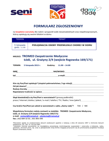 FORMULARZ ZGŁOSZENIOWY na bezpłatne warsztaty dla rodzin i przyjaciół osób niesamodzielnych oraz niepełnosprawnych, którzy opiekują się swoimi bliskimi w domu TERMIN TEMAT 5 listopada godz. 11.00 PIELĘGNACJA OSOBY PRZEWLEKLE CHOREJ W DOMU MIEJSCE: TERMIN: IMIĘ tel. TROMED Zaopatrzenie Medyczne Łódź, ul. Grażyny 2/4 (wejście Rzgowska 169/171) 5 listopada 2015 r. Godziny: 11.00 – 14.00 NAZWISKO e-mail: Kim się Pan/Pani opiekuje? (stopień pokrewieństwa / typ relacji) Od jak dawna? Rodzaj choroby Napotykane trudności w opiece Skąd dowiedział/a się Pan/Pani o warsztatach? (proszę podkreślić) prasa / Internet /ulotka / plakat / e-mail / telefon / TV / Radio / inne (jakie?) Czy brał/a Pan/Pani już udział w warsztatach z cyklu „Damy radę”? TAK / NIE Wypełniony formularz należy zostawić w siedzibie TROMED Zaopatrzenie Medyczne, Łódź, ul. Grażyny 2/4 (wejście Rzgowska 169/171) e-mail: [email protected] , [email protected] fax.: (42) 684 32 02 , 501 893 590 *Wyrażam zgodę na przetwarzanie danych osobowych zgodnie z Ustawą z dnia 29 sierpnia 1997 o Ochronie Danych Osobowych, Dz. Ust. nr 133 poz 883. *Udzielam również pozwolenia na nieodpłatną prezentację moich/jego/jej wypowiedzi i wizerunku w telewizji, radiu, gazetach, stronach www, itp. oraz w jakiejkolwiek innej formie mogącej przyczynić się do promowania projektów Fundacji Razem Zmieniamy Świat.