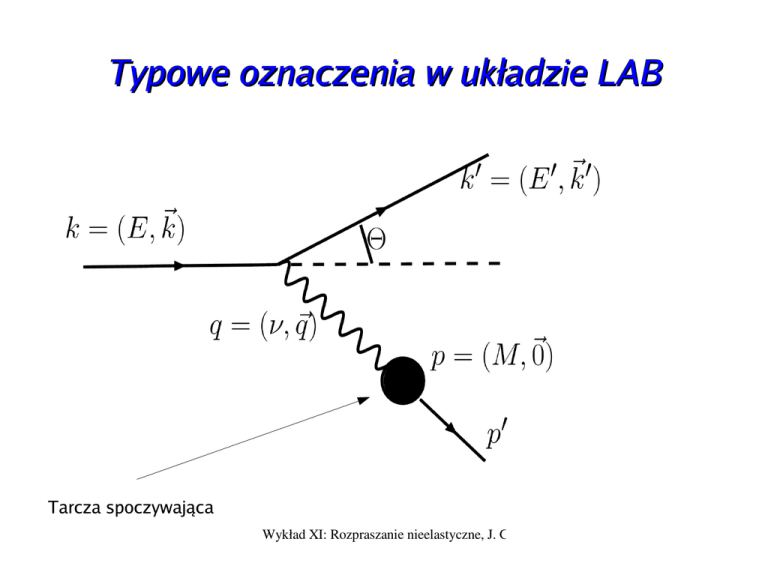Typowe oznaczenia w układzie LAB Tarcza spoczywająca Wykład XI: Rozpraszanie nieelastyczne, J. Gluza Podstawowe relacje Przy zaniedbaniu masy rozpraszanej cząstki Wykład XI: Rozpraszanie nieelastyczne, J. Gluza Podstawowe relacje ● Relacje te można napisać jeszcze nieco inaczej: Wykład XI: Rozpraszanie nieelastyczne, J. Gluza Rozpraszanie sprężyste elektron-proton ● Amplitudę obliczamy jak zwykle z prądów elektronowego (to już znamy) i protonowego Wykład XI: Rozpraszanie nieelastyczne, J. Gluza G_M,G_E można zinterpretować jako fourierowskie obrazy momentu magnetycznego oraz ładunku Wzór Rosenblutha Wykład XI: Rozpraszanie nieelastyczne, J. Gluza Formfaktory: układ Breita ● G_E,G_M mogą być zinterpretowane w specjalnym układzie (Breita) jako fourierowskie obrazy rozkładu ładunku i momentu magnetycznego (tablica) Wykład XI: Rozpraszanie nieelastyczne, J. Gluza Wykład XI: Rozpraszanie nieelastyczne, J. Gluza http://www.nobel-winners.com/Physics/robert_hofstadter.html Wykład XI: Rozpraszanie nieelastyczne, J. Gluza Rozkład ładunkowy protonu, neutronu Wykład XI: Rozpraszanie nieelastyczne, J. Gluza Rozpraszanie głęboko nieelastyczne: stan końcowy z W>>M Wykład XI: Rozpraszanie nieelastyczne, J. Gluza ● Pierwszy rezonans (pomniejszony 8 krotnie): elastyczne rozpraszanie na protonie (proton przed “ rozpadem” ), następne rezonanse: kreacja różnych stanów barionowych, większe W poza rezonansami to suma skomplikowanych stanów wielocząstkowych Wykład XI: Rozpraszanie nieelastyczne, J. Gluza Wykład XI: Rozpraszanie nieelastyczne, J. Gluza Model partonowy Feynmana (1969) ● ● Wiemy już (patrz r. Rutherforda), że przy dużych energiach rozpraszanie elektronów na protonach “ wychodzi” poza punktowy obraz tarczy Feynman zaproponował następujący obraz Wykład XI: Rozpraszanie nieelastyczne, J. Gluza Rozpraszanie od składników nukleonu (partonów) ● I sumowanie: Określa prawdopodobieństwo tego, że parton i niesie pęd x*p Wykład XI: Rozpraszanie nieelastyczne, J. Gluza Czym jest x? dokładniej Born Funkcje dystrybucji partonów “ f” są uniwersalne niezależnie od tego co rozprasza się w rameczce! Wykład XI: Rozpraszanie nieelastyczne, J. Gluza Sumowanie na poprzednim slajdzie jest bardzo ważne (nie ma interferencji), dlaczego? Przed zderzeniem po W trakcie Sterman, hep-ph/9606321 Wykład XI: Rozpraszanie nieelastyczne, J. Gluza Krótko: ● ● ● Przed (a): Elektron bardzo szybko przebiega przez nukleon, zdąży zadziałać tylko z jednym partonem, a nie układem partonów (czas reakcji pomiędzy partonami >> czasu oddz. elektronu z nukleonem (b) Oddziaływanie (jeśli) to tylko z jednym Po (c): oddz. długozasięgowe formują hadrony, są na tyle długie, że nie interferują z krótkozasięgowym oddziaływaniem w trakcie Sterman, hep-ph/9606321 (b) Wykład XI: Rozpraszanie nieelastyczne, J. Gluza Czyli ● DIS to niekoherentne rozpraszanie ponieważ oddziaływanie początkowe (wiążące nukleon) są zbyt wcześnie, a oddziaływania końcowe (produkujące stany hadronowe) są zbyt późno (odseparowanie oddz. partonów z różnych hadronów) w porównaniu z krótkim czasem “ twardego” o ddziaływania elektronu z danym partonem Sterman, hep-ph/9606321 Wykład XI: Rozpraszanie nieelastyczne, J. Gluza Oczywiście musi być spełniony związek: Wykład XI: Rozpraszanie nieelastyczne, J. Gluza Kinematyka partonu Tu też ma być delta, ale z ułamkową masą m danego partonu (=x*M) Wykład XI: Rozpraszanie nieelastyczne, J. Gluza Skalowanie Bjorkena ● Ze względu na delty Diraca, funkcje struktury nie są funkcją dwóch zmiennych, dla ustalonego x, nie zależą od Q^2 Wykład XI: Rozpraszanie nieelastyczne, J. Gluza Ok, ale skąd wiadomo, że parton to kwark? Jaki jest związek między funkcjami struktury W1 i W2 a funkcjami rozkładu gęstości samych partonów? Można pokazać (!), przez porównanie dwóch form pzrekrojów, iż oraz F1 = M* W1 Co więcej, Jaka jest rzeczywistość? Wykład XI: Rozpraszanie nieelastyczne, J. Gluza Partony mają spin 1/2 Wykład XI: Rozpraszanie nieelastyczne, J. Gluza Pełniejszy obraz nukleonu Gluony mogą tworzyć także pętle wewnętrzne, poprawki wyższych rzędów Wykład XI: Rozpraszanie nieelastyczne, J. Gluza przewidywania Zachowanie B,Q,S Wykład XI: Rozpraszanie nieelastyczne, J. Gluza x->1, u_v>>d_v eksperyment Około 1/4 Wykład XI: Rozpraszanie nieelastyczne, J. Gluza Wykład XI: Rozpraszanie nieelastyczne, J. Gluza A jaka jest rola gluonów? Zaniedbujemy kwarki morza Wykład XI: Rozpraszanie nieelastyczne, J. Gluza Łamanie skalowania ● Dla małych x F rośnie ● Dla dużych x F maleje dlaczego? Wykład XI: Rozpraszanie nieelastyczne, J. Gluza Kwark może wyemitować gluon przed jak i po oddziaływaniu z fotonem Wykład XI: Rozpraszanie nieelastyczne, J. Gluza Równanie DGLAP (Altarelli-Parisi) Ta zależność jest odpowiedzialna za łamanie skalowania Wykład XI: Rozpraszanie nieelastyczne, J. Gluza Gluony i multijety Wykład XI: Rozpraszanie nieelastyczne, J. Gluza Faktoryzacja w QCD ● W wysokich energiach mamy do czynienia ze zderzeniami i rozpraszaniem podstawowych składników materii Wykład XI: Rozpraszanie nieelastyczne, J. Gluza ● ● ● ● Z drugiej strony wiemy, że takie swobodne kwarki i gluony są jedynie na małych odległościach (asymptotyczna swoboda) Na dużych odległościach zaczyna działać “ uwięzienie” kwarków, objawia się to tym, że ubierają się one w stany hadronowe, jety Podsumowując, przekroje czynne są kombinacją krótko- i długo-zasięgowych relacji, czyli rachunku perturbacyjnego oraz nieperturbacyjnego Aby połączyć te dwa obrazy stosujemy faktoryzację Wykład XI: Rozpraszanie nieelastyczne, J. Gluza ● ● Krótki zasięg – rozpraszanie twarde (r. perturbacyjny) Kluczowa skala faktoryzacji , przykład np. hep-ph/0409313 Wykład XI: Rozpraszanie nieelastyczne, J. Gluza PDF's, funkcje fragmentacji,... Wyk
