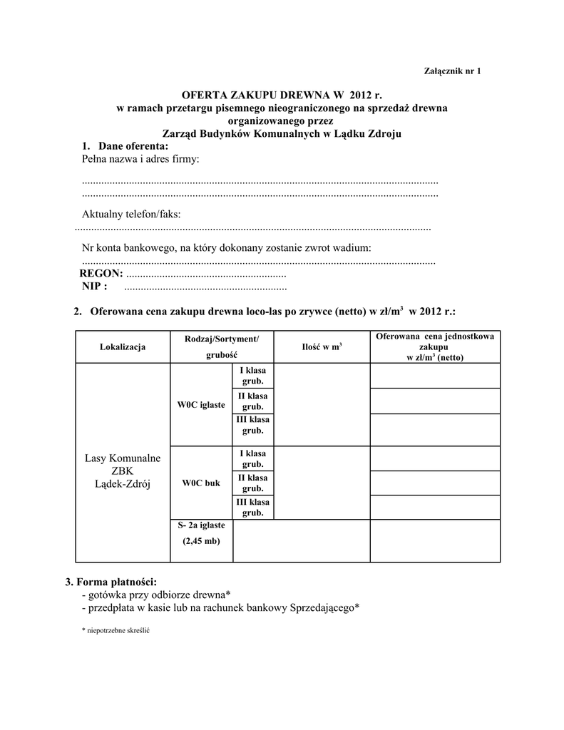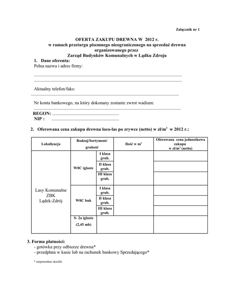 Załącznik nr 1 OFERTA ZAKUPU DREWNA W 2012 r. w ramach przetargu pisemnego nieograniczonego na sprzedaŜ drewna organizowanego przez Zarząd Budynków Komunalnych w Lądku Zdroju 1. Dane oferenta: Pełna nazwa i adres firmy: ................................................................................................................................. ................................................................................................................................. Aktualny telefon/faks: ................................................................................................................................. Nr konta bankowego, na który dokonany zostanie zwrot wadium: ................................................................................................................................ REGON: .......................................................... NIP : ........................................................... 2. Oferowana cena zakupu drewna loco-las po zrywce (netto) w zł/m3 w 2012 r.: Lokalizacja Rodzaj/Sortyment/ grubość Ilość w m3 I klasa grub. W0C iglaste Lasy Komunalne ZBK Lądek-Zdrój W0C buk II klasa grub. III klasa grub. I klasa grub. II klasa grub. III klasa grub. S- 2a iglaste (2,45 mb) 3. Forma płatności: - gotówka przy odbiorze drewna* - przedpłata w kasie lub na rachunek bankowy Sprzedającego* * niepotrzebne skreślić Oferowana cena jednostkowa zakupu w zł/m3 (netto) 4. Wadium Wadium w kwocie.................................zł zostało wniesione w dniu …………………… ……………………………………………… data i miejsce oraz podpis osoby uprawnionej do składania oświadczeń woli