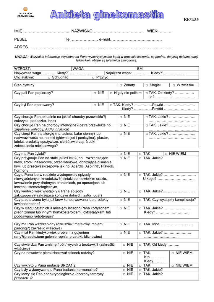 RE/1/35 IMIĘ …………………………….. NAZWISKO………………………………… WIEK:…….… PESEL Tel………………… e-mail………………………...………. ADRES……………………………………………………………………………………….……… UWAGA: Wszystkie informacje uzyskane od Pana wykorzystywane będą w procesie leczenia, są poufne, dotyczą dokumentacji lekarskiej i objęte są tajemnicą zawodową. WZROST: WAGA: BMI: Najwyższa waga ……….. Kiedy? …………………… Najniższa waga: ………….. Kiedy? ………………. Chciałabym: □ Schudnąć □ Przytyć Stan cywilny □ Singiel □ Żonaty □ W związku Czy pali Pan papierosy? □ NIE □ Nigdy nie paliłem □ TAK. Od kiedy? ……………. Ile? …………………………… Czy był Pan operowany? □ NIE □ TAK. Kiedy? ……………Powód ……………….……. Kiedy? ……………Powód ……………….……. Czy choruje Pan aktualnie na jakieś choroby przewlekłe?( cukrzyca, padaczka, inne) Czy choruje Pan na choroby infekcyjne?(ostre/przewlekłe np. zapalenie wątroby, AIDS, gruźlica) Czy cierpi Pan na alergię (np. astma, katar sienny) lub nadwrażliwość np. na leki (głównie jod i penicylina), plaster, lateks, produkty spożywcze, sierść zwierząt, środki znieczulenia miejscowego? □ NIE Czy ma Pan żylaki? Czy przyjmuje Pan na stałe jakieś leki?( np. rozrzedzające krew, środki nasercowe, przeciwbólowe, obniżające ciśnienie krwi lub przeciwzakrzepowe jak np. Acard®, Aspirin®, Plavix®, hormony Czy u Pana lub w rodzinie występowały epizody niewyjaśnionych krwotoków?( siniaki po niewielkim urazie, krwawienie przy drobnych zranieniach, po operacjach lub leczeniu stomatologicznym, Czy kiedykolwiek wystąpiły u Pana epizody zakrzepowe?(zakrzepica kończyn dolnych, zator, udar) Czy przetaczana była już krew konserwowana lub produkty krwiopochodne? Czy w ciągu ostatnich 3 miesięcy leczono Pana kortyzonem, prednizonem lub innymi kortykosteroidami, cytostatykami lub poddawano radioterapii? □ NIE □ NIE □ TAK □ NIE WIEM □ TAK. Jakie? □ NIE □ TAK. Jakie? ……………………… U kogo? …………………………. □ NIE □ TAK. Jakie?................................. □ NIE □ TAK. Czy wystąpiły komplikacje? □ NIE □ TAK. Jakie? ………………….. Kiedy? ……………………….. □ NIE □ TAK. Inne ………………………. □ NIE □ TAK. Jakie? ………………….. ……………………….. Czy ma Pan wszczepiony rozrusznik/ metalowy implant/ piercing?( zakreślić właściwe) Czy miał Pan kiedykolwiek problem z gojeniem rany?(przedłużone gojenie ropnie, przetoki, bliznowiec) □ NIE □ NIE □ TAK. Jakie? …………………. …… …………………………… □ TAK. Jakie? …………………. …… …………………………… □ TAK. Jakie? …………………. …… …………………………… Czy stwierdza Pan zmianę / ból / wyciek z brodawki? (zakreślić właściwe) Czy na nowotwór piersi chorował członek rodziny? □ NIE □ TAK. Od kiedy ………. □ NIE Czy wykryto u Pana mutację BRCA1,2 Czy były wykonywane u Pana badania hormonalne? Czy leczy się Pan endokrynologicznie (choroby tarczycy, przysadki)? □ NIE □ NIE □ NIE □ TAK. Kto ............. Kiedy……… □ TAK □ TAK. Jakie? □ TAK. Jakie? □ NIE WIEM □ NIE WIEM Skąd otrzymał Pan informacje o operacjach ginekomastii? Od kiedy myśli Pan o poddaniu się operacji? Czy konsultował Pan z innymi chirurgami operację ginekomastii? Jakie były przyczyny, że do tej pory nie wykonał Pan operacji? Kto wspiera Pana w postanowieniu o zabiegu? Kto jest przeciwny zabiegowi? Umówiłem się na wizytę aby: □ TV □ Znajomi □ > 1 rok □ NIE □ Internet □ Gazety □ Inne □ < 1 rok □ …………… □ TAK. Z iloma?...... □ Finansowa □ nie byłem przekonany □ brak dostatecznej wiedzy □ Przyjaciele □ Przyjaciele □ rodzina była przeciwna □ Partner / ka □ Nikt □ strach przed bólem □ Inne □ Inne □ Inne □ dowiedzieć się o szczegółach, tj. ryzyko, komplikacje, itp □ uzyskać poradę lekarską □ przygotować się do operacji □ Inne …………………………….. data i podpis pacjenta Wypełnia lekarz: KWALIFIKACJA: PRZECIWSKAZANIA: □ TAK □ TAK □ NIE □ NIE …………………………….. data, podpis i pieczątka lekarza