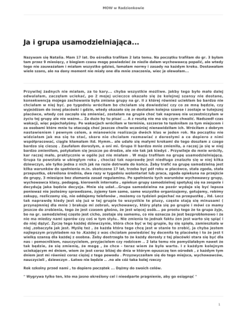 MOW w Radzionkowie Ja i grupa usamodzielniająca... Nazywam się Natalia. Mam 17 lat. Do ośrodka trafiłam 2 lata temu. Na początku trafiłam do gr. 3 byłam tam przez 9 miesięcy, z biegiem czasu mogę powiedzieć że nieźle dałam wychowawcą popalić, ale wtedy tego nie zauważałam i miałam wszystko gdzieś, łamałam normy i zasady na każdym kroku. Dostawałam wiele szans, ale na dany moment nie miały one dla mnie znaczenia, wiec je olewałam... Przywilej żadnych nie miałam, za to kary... chyba wszystkie możliwe. Jakby tego było mało dalej odwalałam, zaczęłam uciekać, po 2 mojej ucieczce okazało się że kolejnej szansy nie dostane, konsekwencją mojego zachowania była zmiana grupy na gr. II z której również uciekłam bo bardzo nie chciałam w niej być. po tygodniu wróciłam bo chciałam się dowiedzieć czy co ze mną będzie, czy wyjeżdżam do innej placówki i gdzie, wtedy okazało się ze dostałam kolejna szanse i zostaje w tutejszej placówce, wtedy coś zaczęło się zmieniać, zostałam na grupie choć tak naprawę nie uczestniczyłam w życiu tej grupy ale nie ważne... Za dużo by tu pisać ... A z resztą nie ma się czym chwalić. Nadszedł czas wakacji, więc pojechałyśmy. Po wakacjach wróciłam w terminie, szczerze to tęskniłam za tym miejscem i za osobami które mnie tu otaczają choć jeszcze chwile wcześniej nienawidziłam ich. Wróciłam z dobrym nastawieniem i pewnym celem, a mianowicie realizacja dwóch klas w jeden rok. Na początku nie widziałam jak ma się to stać, skoro nie chciałam rozmawiać z dorosłymi a co dopiero z nimi współpracować, ciągle kłamałam itd. Hymm.. ale udało się małymi krokami do tego doszłam z czego bardzo się cieszę . Zaufałam dorosłym, a oni mi. Grupa II bardzo mnie zmieniła, a raczej ja się w niej bardzo zmieniłam, potykałam się jeszcze po drodze, ale nie tak jak kiedyś . Przywileje do mnie wróciły, kar raczej mało, praktycznie w ogóle już nie miałam . W maju trafiłam na grupę usamodzielniającą. Grupa ta powstała w ubiegłym roku , chociaż tak naprawdę jest niedługo znalazło się w niej kilka dziewczyn, ale tylko jedna z nich jak na razie dotrwała do końca. Żeby trafić na grupę samodzielną jest kilka warunków do spełnienia m.in. skończone 17 lat, trzeba być pół roku w placówce, stała zgoda, stała przepustka, określona średnia, dwa razy w tygodniu wolontariat lub praca, zgoda opiekuna na przejście do grupy, 3 miesiące bez złamania zasad regulaminu. Po spełnieniu tych warunków wychowawcy grupy, wychowawca klasy, pedagog, kierownik internatu , opiekun grupy samodzielnej spotykaj się na zespole i decydują jaka będzie decyzja. Mnie się udał...Grupa samodzielna na pozór wydaje się być lepsza ponieważ nie jesteśmy sprawdzane, żyjemy tam same, same wszystko organizujemy, gotujemy, robimy zakupy, rozliczamy się, nie oddajemy telefonów , możemy co tydzień pojechać na przepustkę , itd. Lecz tak naprawdę kiedy jest się już w tej grupie to wszystkie te plusy, często stają się minusami ( przynajmniej dla mnie ) brakuje mi zebrań, wychowawcy, który pląta się po grupie i mówi co mamy jeszcze do zrobienia, tego że jest czasem głośno, że jest więcej osób... po prostu tego że ta grupa żyje, bo na gr. samodzielnej często jest cicho, zostaje się samemu, co nie oznacza że jest bezproblemowo i że nie ma miedzy nami sporów czy coś w tym stylu.. Nie zmienia to jednak faktu żen jest warto się spiąć i do niej dążyć. Życzę tego każdej dziewczynie, która chce być w tej grupie, by się spięła, zamieszkała w niej ,zobaczyła jak jest. Myślę też , że każda która tego chcę jest w stanie to zrobić, ja chyba jestem najlepszym przykładem na to .Każdej z was chciałam powiedzieć by doceniła tę placówkę i to że jest t wielką szansą dla każdej z osobna. Żeby dostrzegła to że każdy dorosły z tej placówki stara się być dla nas : pomocnikiem, nauczycielem, przyjacielem czy rodzicem .. 2 lata temu nie pomyślałabym nawet że tak będzie, że się zmienię, że mogę , że chce - teraz wiem że było warto. I z każdym kolejnym uciekającym mi dniem, wiem że jest coraz bliżej do dnia w którym opuszczę ten ośrodek , z każdym tym dniem jest mi również coraz ciężej z tego powodu . Przyzwyczaiłam się do tego miejsca, wychowawców, nauczycieli , dziewczyn . Łatwo nie będzie .. .no ale cóż taka kolej rzeczy Rok szkolny przed nami , to dopiero początek ... Dążmy do swoich celów. " Wygrywa tylko ten, kto ma jasno określony cel i nieodparte pragnienie, aby go osiągnąć " 1 MOW w Radzionkowie Natalia Sz. 2