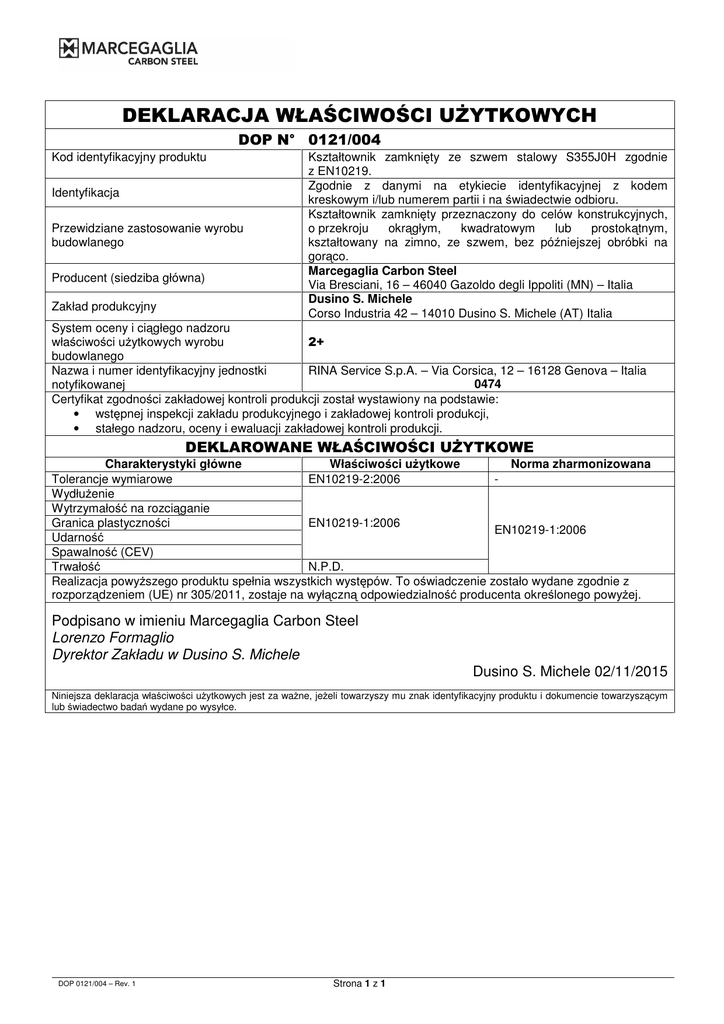 DEKLARACJA WŁAŚCIWOŚCI UŻYTKOWYCH DOP N° 0121/004 Kod identyfikacyjny produktu Identyfikacja Przewidziane zastosowanie wyrobu budowlanego Producent (siedziba główna) Zakład produkcyjny Kształtownik zamknięty ze szwem stalowy S355J0H zgodnie z EN10219. Zgodnie z danymi na etykiecie identyfikacyjnej z kodem kreskowym i/lub numerem partii i na świadectwie odbioru. Kształtownik zamknięty przeznaczony do celów konstrukcyjnych, o przekroju okrągłym, kwadratowym lub prostokątnym, kształtowany na zimno, ze szwem, bez późniejszej obróbki na gorąco. Marcegaglia Carbon Steel Via Bresciani, 16 – 46040 Gazoldo degli Ippoliti (MN) – Italia Dusino S. Michele Corso Industria 42 – 14010 Dusino S. Michele (AT) Italia System oceny i ciągłego nadzoru właściwości użytkowych wyrobu 2+ budowlanego Nazwa i numer identyfikacyjny jednostki RINA Service S.p.A. – Via Corsica, 12 – 16128 Genova – Italia 0474 notyfikowanej Certyfikat zgodności zakładowej kontroli produkcji został wystawiony na podstawie: • wstępnej inspekcji zakładu produkcyjnego i zakładowej kontroli produkcji, • stałego nadzoru, oceny i ewaluacji zakładowej kontroli produkcji. DEKLAROWANE WŁAŚCIWOŚCI UŻYTKOWE Charakterystyki główne Właściwości użytkowe Norma zharmonizowana Tolerancje wymiarowe EN10219-2:2006 Wydłużenie Wytrzymałość na rozciąganie Granica plastyczności EN10219-1:2006 EN10219-1:2006 Udarność Spawalność (CEV) Trwałość N.P.D. Realizacja powyższego produktu spełnia wszystkich występów. To oświadczenie zostało wydane zgodnie z rozporządzeniem (UE) nr 305/2011, zostaje na wyłączną odpowiedzialność producenta określonego powyżej. Podpisano w imieniu Marcegaglia Carbon Steel Lorenzo Formaglio Dyrektor Zakładu w Dusino S. Michele Dusino S. Michele 02/11/2015 Niniejsza deklaracja właściwości użytkowych jest za ważne, jeżeli towarzyszy mu znak identyfikacyjny produktu i dokumencie towarzyszącym lub świadectwo badań wydane po wysyłce. DOP 0121/004 – Rev. 1 Strona 1 z 1