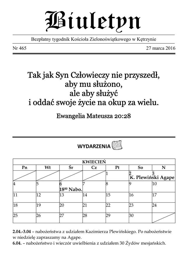 Biuletyn Bezpłatny tygodnik Kościoła Zielonoświątkowego w Kętrzynie Nr 465 27 marca 2016 WYDARZENIA Pn Wt 4 5 11 Śr KWIECIEŃ Cz 1 Pt So N 2 3 K. Plewiński Agape 6 7 8 9 10 12 13 14 15 16 17 18 19 20 21 22 23 24 25 26 27 28 29 30 1800 Nabo. 2.04.-3.04 – nabożeństwa z udziałem Kazimierza Plewińskiego. Po nabożeństwie w niedzielę zapraszamy na Agape. 6.04. – nabożeństwo i wieczór uwielbienia z udziałem 30 Żydów mesjańskich. Kazanie wygłosi: Arkadiusz Jurgiełajtis LISTA MODLITEWNA kielich ode mnie...” i deklarować poddanie – „wszakże nie co Ja chcę, ale co Ty”. (Marka 14:36 ) * o zbawienie: Andrzeja D. (męża Ani). Danuty K. Tadeusza W. Lilli R. (żony Mirka) męża Bogumiły Panfil. rodziców Darka Biłdy. taty i brata Moniki Czerwonki. Justyny J. (żony Marcina Dominika). URODZINY Dziś urodziny obchodzi: 27.03. Mariusz Bandurow W tym tygodniu urodziny obchodzi: * o zdrowie: Leszka (męża Iwony). Marty Bieleckiej. Danuty K. Patrycji i Magdy Owierczuk. Debory Marczuk. Marianny i Jerzego Zakrzewskich. Alfredy Kopaczel. Bogumiły Panfil. 28.03. Mariola Babicz Życzymy Bożych błogosławieństw! ROZWAŻANIE Spojrzenie Pana * o uzdrowienie i wzrost duchowy Rafała (bratanka Lucyny Tęczy.); * o błogosławieństwa, Boże prowadzenie dla Władysława i Krystyny Plewińskich, będących na misji za granicą. Życie Pana Jezusa na tej ziemi było krótkie. W całości około 33 lat, lecz to najważniejsze, tylko nieco trochę ponad trzy lata. Tak krótko, a jednak w tym czasie, tak dużo się wydarzyło. Czterej ewangeliści opisują nam jedynie najważniejsze wydarzenia, gdyż, jak napisał jeden z nich: „gdyby miały być spisane jedna po drugiej, mniemam, że i cały świat nie pomieściłby ksiąg, które by należało napisać” (Jan 21:25). Najważniejsze jednak wydarzenia miały miejsce w ciągu zaledwie kilku ostatnich dni. Na dwa dni przed żydowskim świętem Paschy, Jezus po REFLEKSJE W chwilach niepokoju i trwogi, za przykładem Chrystusa Pana, zwracając się do Boga Ojca w niebie, my też winniśmy: wyznawać swoją wiarę – „Abba, Ojcze! Ty wszystko możesz...”, wypowiadać swoje pragnienia – „oddal ten 2 raz kolejny zapowiedział to najważniejsze ze wszystkich wydarzeń, że „Syn Człowieczy będzie wydany na ukrzyżowanie” (Łuk. 26:2). I od tego momentu czas nabrał rozpędu. Po niezwykłym namaszczeniu w gościnnym domu w Betanii, Chrystus zgromadził swoich wybrańców na Wieczerzy, podczas której ogłosił najważniejszy punkt Bożego planu odkupienia grzesznej ludzkości. Po przełamaniu się chlebem, symbolizującym Jego ciało, Jezus podając uczniom kielich, powiedział: „Pijcie z niego wszyscy; albowiem to jest krew moja nowego przymierza, która się za wielu wylewa na odpuszczenie grzechów” (Łuk. 26:28). Nowe przymierze, jak różne od tych zawieranych przez Boga z Noem, Abrahamem czy też z Dawidem. Tamte oparte były na udziale człowieka w wypełnieniu warunków Bożego planu. Teraz, wszystko zostało powierzone Chrystusowi. On został przeznaczony na ołtarz Bożego miłosierdzia, jak baranek, którego Pan przygotował na zastąpienie Izaaka, gdy wierny sługa Abraham podniósł już swoją rękę, okazując zupełne posłuszeństwo. Nowe przymierze oparte jest na zupełnym przebaczeniu, bez udziału człowieka. Już wcześniej, gdy przyprowadzono do Niego grzeszą niewiastę, Pan Jezus, zamiast podawanych mu do ręki kamieni, jedynie pisał palcem po ziemi, jak gdyby chciał okazać, że nie kamień jest rozwiązaniem, lecz przebaczenie. Gdy już ludzcy oskarżyciele odeszli ze spuszczonym ze wstydu wzrokiem, Pan śmierci i życia oświadczył: „I Ja cię nie potępiam: Idź i odtąd już nie grzesz” (Jan 8:11). W tych słowach wyrażona jest prawda o nowym życiu, które Chrystus daje w darze, życiu wolnym od grzechu. Później, apostoł Paweł, który osobiście doświadczył tej przemiany w swoim życiu, napisał, że „nasz stary człowiek został wespół z nim ukrzyżowany, aby grzeszne ciało zostało unicestwione, byśmy już nadal nie służyli grzechowi” (Rzym. 6:6). W czasie tych dwóch ostatnich dni przed ukrzyżowaniem, bezpośrednio po Ostatniej Wieczerzy, Chrystus wyszedł do ogrodu Getsemane, aby w osobistej rozmowie z Ojcem poddać się całkowicie Jego woli. To był największy bój, jaki przeszedł Chrystus, gdyż w nim musiał pokonać ciężar Bożego gniewu wobec całej ludzkości. Chrystus zgodził się wypić kielich wypełniony sprawiedliwym gniewem, spowodowanym naszymi grzechami. Gdy jeszcze Pan rozmawiał z uczniami, nadszedł Judasz z tłumem uzbrojonym w miecze i kije, aby za cenę trzydziestu srebrników wydać Pana Jezusa. Każdy z ewangelistów opisuje te wydarzenia, naświetlając różne ich strony. Gdy czytamy ten opis męki Pana Jezusa, możemy odtworzyć wiele szczegółów, z których każdy ma swoją wymowę. Każde słowo, każdy gest a nawet spojrzenie Pana Jezusa, tak wiele mówi. W tym rozważaniu chcę zwrócić naszą uwagę na jedno przelotne spojrzenia Chrystusa, tak krótkie, że jedynie Łukasz je zauważył. Jak sam napisał we wstępie do ewangelii, „postanowiłem i ja, który wszystko od 3 początku przebadałem, dokładnie kolejno ci to opisać” (Łuk. 1:3). Dlatego też, czytając opisy ewangelistów tych ostatnich momentów życia Pana Jezusa na naszej ziemi, zwróciłem swoja uwagę na to spojrzenie Pana Jezusa, które wywołało tak ogromną reakcję w życiu Piotra. Wszyscy ewangeliści opisują nam z większymi, lub mniejszymi szczegółami moment zaparcia się Piotra. Słyszałem wiele kazań wygłoszonych na ten temat, a nawet sam wygłosiłam też nie jedno. Najczęściej zwraca się uwagę na naganną postawę tego ucznia. Podkreśla się fakt, że przecież Pan Jezus ostrzegał Piotra, że „nie zapieje dzisiaj kur, a ty się trzykroć zaprzesz, że mnie znasz” (Łuk. 22:34). Dlaczego więc Piotr był tak nieostrożny? 
