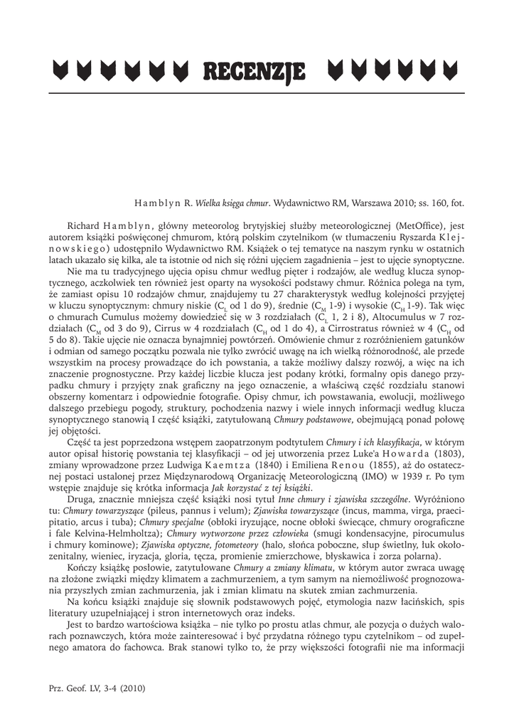 H a m b l y n R. Wielka księga chmur. Wydawnictwo RM, Warszawa 2010; ss. 160, fot. Richard H a m b l y n , główny meteorolog brytyjskiej służby meteorologicznej (MetOffice), jest autorem książki poświęconej chmurom, którą polskim czytelnikom (w tłumaczeniu Ryszarda K l e j n o w s k i e g o ) udostępniło Wydawnictwo RM. Książek o tej tematyce na naszym rynku w ostatnich latach ukazało się kilka, ale ta istotnie od nich się różni ujęciem zagadnienia – jest to ujęcie synoptyczne. Nie ma tu tradycyjnego ujęcia opisu chmur według pięter i rodzajów, ale według klucza synoptycznego, aczkolwiek ten również jest oparty na wysokości podstawy chmur. Różnica polega na tym, że zamiast opisu 10 rodzajów chmur, znajdujemy tu 27 charakterystyk według kolejności przyjętej w kluczu synoptycznym: chmury niskie (CL od 1 do 9), średnie (CM 1-9) i wysokie (CH 1-9). Tak więc o chmurach Cumulus możemy dowiedzieć się w 3 rozdziałach (CL 1, 2 i 8), Altocumulus w 7 rozdziałach (CM od 3 do 9), Cirrus w 4 rozdziałach (CH od 1 do 4), a Cirrostratus również w 4 (CH od 5 do 8). Takie ujęcie nie oznacza bynajmniej powtórzeń. Omówienie chmur z rozróżnieniem gatunków i odmian od samego początku pozwala nie tylko zwrócić uwagę na ich wielką różnorodność, ale przede wszystkim na procesy prowadzące do ich powstania, a także możliwy dalszy rozwój, a więc na ich znaczenie prognostyczne. Przy każdej liczbie klucza jest podany krótki, formalny opis danego przypadku chmury i przyjęty znak graficzny na jego oznaczenie, a właściwą część rozdziału stanowi obszerny komentarz i odpowiednie fotografie. Opisy chmur, ich powstawania, ewolucji, możliwego dalszego przebiegu pogody, struktury, pochodzenia nazwy i wiele innych informacji według klucza synoptycznego stanowią I część książki, zatytułowaną Chmury podstawowe, obejmującą ponad połowę jej objętości. Część ta jest poprzedzona wstępem zaopatrzonym podtytułem Chmury i ich klasyfikacja, w którym autor opisał historię powstania tej klasyfikacji – od jej utworzenia przez Luke'a H o w a r d a (1803), zmiany wprowadzone przez Ludwiga K a e m t z a (1840) i Emiliena R e n o u (1855), aż do ostatecznej postaci ustalonej przez Międzynarodową Organizację Meteorologiczną (IMO) w 1939 r. Po tym wstępie znajduje się krótka informacja Jak korzystać z tej książki. Druga, znacznie mniejsza część książki nosi tytuł Inne chmury i zjawiska szczególne. Wyróżniono tu: Chmury towarzyszące (pileus, pannus i velum); Zjawiska towarzyszące (incus, mamma, virga, praecipitatio, arcus i tuba); Chmury specjalne (obłoki iryzujące, nocne obłoki świecące, chmury orograficzne i fale Kelvina-Helmholtza); Chmury wytworzone przez człowieka (smugi kondensacyjne, pirocumulus i chmury kominowe); Zjawiska optyczne, fotometeory (halo, słońca poboczne, słup świetlny, łuk okołozenitalny, wieniec, iryzacja, gloria, tęcza, promienie zmierzchowe, błyskawica i zorza polarna). Kończy książkę posłowie, zatytułowane Chmury a zmiany klimatu, w którym autor zwraca uwagę na złożone związki między klimatem a zachmurzeniem, a tym samym na niemożliwość prognozowania przyszłych zmian zachmurzenia, jak i zmian klimatu na skutek zmian zachmurzenia. Na końcu książki znajduje się słownik podstawowych pojęć, etymologia nazw łacińskich, spis literatury uzupełniającej i stron internetowych oraz indeks. Jest to bardzo wartościowa książka – nie tylko po prostu atlas chmur, ale pozycja o dużych walorach poznawczych, która może zainteresować i być przydatna różnego typu czytelnikom – od zupełnego amatora do fachowca. Brak stanowi tylko to, że przy większości fotografii nie ma informacji Prz. Geof. LV, 3-4 (2010) 246 Recenzje o miejscu, a przy żadnej o czasie wykonania fotografii – a wiele z nich jest bardzo interesujących. Wartość książki dla polskiego czytelnika podnosi dobre tłumaczenie; można tylko mieć wątpliwości, czy Ziemia i Słońce jako ciała niebieskie powinny tu być pisane tak jak w tekstach literackich, tzn. małą literą. Również tytuł Zorza jest chyba mylący, gdy tematem jest zorza polarna, bowiem słowo zorza bez tego przymiotnika ma inny sens. Ogólnie jednak tekst polski jest poprawny i klarowny, czyta się go po prostu z przyjemnością. Miłą niespodzianką jest też spis literatury przygotowany z myślą o polskim czytelniku. Urszula Kossowska-Cezak K o c k G., L a m m e r h u b e r L., P i l l e r W.E., Planet Austria: Stein – Wasser – Leben. Edition Lammerhuber i Österreichische Akademie der Wissenschaften, Baden 2009; ss. 408. Realizowane obecnie w Austrii projekty naukowe, zarówno krajowe jak i międzynarodowe, zainspirowały Austriacką Akademię Nauk (Österreichische Akademie der Wissenschaften) do wydania książki Planeta Austria, w której zaprezentowano wybrane projekty badawcze austriackich naukowców. Tematyka projektów obejmuje takie dziedziny, jak np. geologia, geofizyka, hydrologia, a także zmiany klimatu Ziemi i badania w Alpach. Książka składa się z kilku części. Pierwszą z nich jest wprowadzenie, które stanowi przedmowa prezydenta Heinza F i s c h e r a oraz rozmowa autorów książki z ministrem Johannisem H a h n e m na temat przyszłości austriackiej nauki. Warto zwrócić uwagę na słowa prezydenta Fischera, wyrażającego uznanie wobec autorów książki za zaangażowanie w jej przygotowanie oraz nadzieję na to, że książka ta wzbudzi zainteresowanie wśród uczniów szkół. Następny rozdział nosi tytuł Naukowcy w pracy. Jest on nie tylko fotograficzną relacją z wybranych badań, ale przede wszystkim przedstawieniem sylwetek zafascynowanych przyrodą badaczy wraz z ich warsztatem pracy. Część właściwą książki stanowi opis 33 projektów naukowych. Ciekawość wzbudza podział tychże opisów na 3 główne kierunki badawcze projektów: skała, woda i życie (Stein, Was