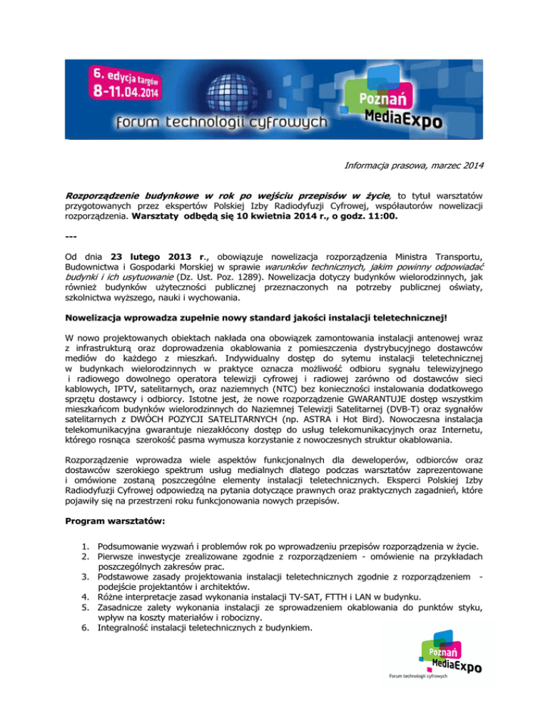Informacja prasowa, marzec 2014 Rozporządzenie budynkowe w rok po wejściu przepisów w Ŝycie, to tytuł warsztatów przygotowanych przez ekspertów Polskiej Izby Radiodyfuzji Cyfrowej, współautorów nowelizacji rozporządzenia. Warsztaty odbędą się 10 kwietnia 2014 r., o godz. 11:00. --Od dnia 23 lutego 2013 r., obowiązuje nowelizacja rozporządzenia Ministra Transportu, Budownictwa i Gospodarki Morskiej w sprawie warunków technicznych, jakim powinny odpowiadać budynki i ich usytuowanie (Dz. Ust. Poz. 1289). Nowelizacja dotyczy budynków wielorodzinnych, jak równieŜ budynków uŜyteczności publicznej przeznaczonych na potrzeby publicznej oświaty, szkolnictwa wyŜszego, nauki i wychowania. Nowelizacja wprowadza zupełnie nowy standard jakości instalacji teletechnicznej! W nowo projektowanych obiektach nakłada ona obowiązek zamontowania instalacji antenowej wraz z infrastrukturą oraz doprowadzenia okablowania z pomieszczenia dystrybucyjnego dostawców mediów do kaŜdego z mieszkań. Indywidualny dostęp do sytemu instalacji teletechnicznej w budynkach wielorodzinnych w praktyce oznacza moŜliwość odbioru sygnału telewizyjnego i radiowego dowolnego operatora telewizji cyfrowej i radiowej zarówno od dostawców sieci kablowych, IPTV, satelitarnych, oraz naziemnych (NTC) bez konieczności instalowania dodatkowego sprzętu dostawcy i odbiorcy. Istotne jest, Ŝe nowe rozporządzenie GWARANTUJE dostęp wszystkim mieszkańcom budynków wielorodzinnych do Naziemnej Telewizji Satelitarnej (DVB-T) oraz sygnałów satelitarnych z DWÓCH POZYCJI SATELITARNYCH (np. ASTRA i Hot Bird). Nowoczesna instalacja telekomunikacyjna gwarantuje niezakłócony dostęp do usług telekomunikacyjnych oraz Internetu, którego rosnąca szerokość pasma wymusza korzystanie z nowoczesnych struktur okablowania. Rozporządzenie wprowadza wiele aspektów funkcjonalnych dla deweloperów, odbiorców oraz dostawców szerokiego spektrum usług medialnych dlatego podczas warsztatów zaprezentowane i omówione zostaną poszczególne elementy instalacji teletechnicznych. Eksperci Polskiej Izby Radiodyfuzji Cyfrowej odpowiedzą na pytania dotyczące prawnych oraz praktycznych zagadnień, które pojawiły się na przestrzeni roku funkcjonowania nowych przepisów. Program warsztatów: 1. Podsumowanie wyzwań i problemów rok po wprowadzeniu przepisów rozporządzenia w Ŝycie. 2. Pierwsze inwestycje zrealizowane zgodnie z rozporządzeniem - omówienie na przykładach poszczególnych zakresów prac. 3. Podstawowe zasady projektowania instalacji teletechnicznych zgodnie z rozporządzeniem podejście projektantów i architektów. 4. RóŜne interpretacje zasad wykonania instalacji TV-SAT, FTTH i LAN w budynku. 5. Zasadnicze zalety wykonania instalacji ze sprowadzeniem okablowania do punktów styku, wpływ na koszty materiałów i robocizny. 6. Integralność instalacji teletechnicznych z budynkiem. 7. Nowe instalacje teletechniczne w budynkach - perspektywa operatorów kablowych. 8. Podsumowanie zapisów rozporządzenia w aspekcie rozwoju usług dostępu do Internetu i usług TV w nadchodzącym czasie. 9. Pytania, dyskusja Przewidywane czas trwania warsztatów to 2 godziny. Więcej informacji na www.mediaexpo.pl.