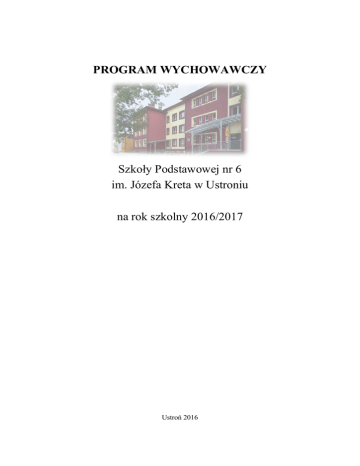 PROGRAM WYCHOWAWCZY Szkoły Podstawowej nr 6 im. Józefa Kreta w Ustroniu na rok szkolny 2016/2017 Ustroń 2016 2 Rozdział I Funkcja wychowawcza szkoły §1 Postanowienia wstępne 1. Szkoła Podstawowa nr 6 im. Józefa Kreta w Ustroniu realizując funkcję dydaktyczną, wychowawczą i opiekuńczą chce dążyć do wprowadzenia uczniów w różnorodne dziedziny życia, a także zapewnić im możliwość atrakcyjnego spędzania czasu wolnego. 2. Program Wychowawczy został opracowany przez nauczycieli przy współpracy Rady Rodziców, po rozpoznaniu potrzeb uczniów i oczekiwań rodziców względem szkoły. 3. Treści Programu są zgodne ze Statutem Szkoły. 4. Program oparty jest na zapisach: 1) Konstytucji Rzeczpospolitej Polskiej, 2) Konwencji o Prawach Dziecka, 3) Ustaw oświatowych, 4) Rozporządzeń Ministra Edukacji Narodowej, 5) Statutu Szkoły Podstawowej nr 6 im. Józefa Kreta w Ustroniu. 5. Koncepcja Programu Wychowawczego uwzględnia różne aspekty, m.in.: 1) odwołuje się do tradycji szkoły, 2) uwzględnia podstawę programową kształcenia ogólnego, 3) zwraca uwagę na potrzeby szkoły, środowiska lokalnego, kształtowanie szacunku dla polskiej kultury, otwarcie na wartości kultury europejskiej, 4) uwzględnia zagrożenia współczesnego świata, by wypracować możliwość skutecznego przeciwdziałania im, 5) uwzględnia kształtowanie wszechstronnego rozwoju uczniów w wymiarze intelektualnym, psychicznym, społecznym, zdrowotnym, moralnym i duchowym, 6) łączy treści wychowania, nauczania i kształcenia w celu realizacji na zajęciach edukacyjnych. §2 Wizja szkoły 1. Chcemy, aby nasza szkoła była postrzegana w środowisku lokalnym jako przyjazna i życzliwa uczniom i ich rodzicom, kładąca nacisk na wszechstronny rozwój. 2. Chcemy starać się, aby podejmowane przez szkołę zadania rozwijały w uczniach dociekliwość poznawczą zwracając uwagę na wartości dobra, prawdy i piękna. 3. Chcemy budzić w uczniach wrażliwość moralną i szacunek dla wspólnego dobra. 4. Nasza szkoła będzie promować pozytywny system wartości z poszanowaniem wolności wyznania w duchu ekumenizmu i tolerancji. 5. Badając i analizując możliwości ucznia oraz jego potrzeby, chcemy dołożyć wszelkich starań, aby mógł on wykazać się swoją wiedzą i rozwijać swoje zainteresowania. 3 Rozdział II Cele i zadania szkoły oraz formy ich realizacji §1 Cele szkoły 1. Celami wychowawczymi szkoły są: 1) wszechstronny rozwój osobowy ucznia, 2) wspomaganie rozwoju w wymiarze intelektualnym, psychicznym, społecznym, zdrowotnym, estetycznym, moralnym i duchowym, 3) rozpoznawanie i zaspokajanie indywidualnych potrzeb ucznia, 4) kształtowanie samodzielności w działaniu oraz poczucia odpowiedzialności za siebie i innych, 5) rozwijanie dociekliwości poznawczej, poszukiwanie piękna, dobra i prawdy, 6) przygotowanie do aktywnego uczestnictwa w życiu społecznym, 7) wspieranie i uzupełnianie pracy wychowawczej rodziców, 8) integrowanie uczniów niepełnosprawnych i z dysfunkcjami z rówieśnikami, 9) profilaktyka agresji i przemocy. §2 Zadania szkoły 1. Zadaniami szkoły są: 1) uznanie kształcenia, wychowania i opieki za integralną całość, 2) dbanie o bezpieczeństwo i harmonijny rozwój ucznia, 3) wychowywanie w duchu tolerancji, 4) kształtowanie dbałości o sprawność fizyczną uczniów, 5) umożliwienie uczniom zdobycia wiedzy i umiejętności niezbędnych do funkcjonowania we współczesnym świecie, 6) rozpoznawanie specjalnych potrzeb edukacyjnych ucznia poprzez zapewnienie odpowiedniej pomocy psychologiczno-pedagogicznej, 7) praca nad wzmocnieniem więzi emocjonalnych z najbliższym otoczeniem i jego mieszkańcami, 8) współpraca z rodzicami, wspierając ich w wychowaniu dzieci, 9) wspieranie rozwoju dziecka 6-letniego. §3 Formy realizacji celów i zadań wychowawczych szkoły 1. Do form realizacji celów i zadań szkoły zaliczamy m.in.: 1) organizowanie konkursów przedmiotowych i artystycznych, 2) pracę z uczniem zdolnym z wykorzystaniem aktywnych metod uczenia w celu wyzwolenia twórczej aktywności, 3) pracę z uczniem z problemami edukacyjnymi lub wychowawczymi, 4) pracę z uczniem niepełnosprawnym lub z dysfunkcjami, 4 5) organizowanie uroczystości szkolnych związanych z obchodzeniem świąt państwowych, spotkań z ciekawymi ludźmi, przedstawień, wycieczek itp., 6) prezentacje osiągnięć uczniów na stronie internetowej szkoły, 7) współpracę z rodzicami uczniów, 8) uczestnictwo w kołach zainteresowań. 5 Rozdział III Działania wychowawcze §1 Plan pracy wychowawczej w klasie 1. Wychowawca klasy przygotowując plan pracy wychowawczej powinien zawrzeć w nim tematykę zawartą w Programie. 2. Plan pracy wychowawczej realizowany jest w czasie lekcji wychowawczych, a także w czasie wszystkich innych zajęć lekcyjnych oraz podczas uroczystości szkolnych i imprez. 1. 2. 3. 4. 5. 6. 7. 8. §2 Tematyka działań wychowawczych dla klas I-VI Prawdomówność: 1) kształtowanie odpowiedzialności za słowa i czyny. Szacunek: 1) poszanowanie godności osobistej, 2) wyrabianie szacunku dla innych, 3) wyrabianie szacunku dla pracy innych, 4) dbanie o estetykę klasy i szkoły. Tolerancja: 1) kształtowanie pozytywnych postaw wobec różnych opinii i innych osób – niepełnosprawnych, chorych, słabszych, 2) przeciwdziałanie dyskryminacji. Kultura osobista: 1) kształtowanie nawyków kulturalnego zachowania, 2) kształtowanie umiejętności współżycia w grupie społecznej i rodzinie zgodnie z obowiązującymi normami i regułami. Poszanowanie życia i zdrowia: 1) kształtowanie nawyków zdrowego żywienia i aktywnego trybu życia, 2) nabywanie umiejętności życia w zgodzie z przyrodą i jej prawami. Nieuleganie nałogom: 1) wskazywanie negatywnych skutków nałogów, 2) działania profilaktyczne zapobiegające nałogom. Poszanowanie mienia: 1) uwrażliwienie na dobro własne i wspólne, 2) wpajanie zasad uczciwości i szacunku dla