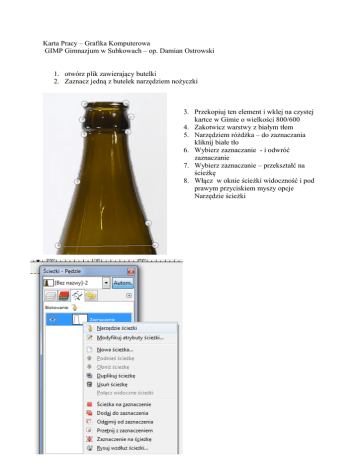Karta Pracy – Grafika Komputerowa GIMP Gimnazjum w Subkowach – op. Damian Ostrowski 1. otwórz plik zawierający butelki 2. Zaznacz jedną z butelek narzędziem nożyczki 3. Przekopiuj ten element i wklej na czystej kartce w Gimie o wielkości 800/600 4. Zakotwicz warstwy z białym tłem 5. Narzędziem różdżka – do zaznaczania kliknij białe tło 6. Wybierz zaznaczanie - i odwróć zaznaczanie 7. Wybierz zaznaczanie – przekształć na ścieżkę 8. Włącz w oknie ścieżki widoczność i pod prawym przyciskiem myszy opcje Narzędzie ścieżki 9. Poprzesuwaj punkty zaznaczania ściżki tak jak na rysunku poniżej. 10. Jeszcze raz kliknij Zaznaczanie ze ścieżki. 11. Dodaj przezroczystą warstwę na zakładce z warstwami. 12. Zmień aktualny kolor wypełnienia na biały 13. Wybierz na palecie ścieżki polecenie Rysuj wzdłuż ścieżki i ustaw tak jak na rysunku poniżej. 14. Na zakładce warstwy wyłącz warstwę TŁO - powinno być tak jak na rysunku poniżej 15. Zaznacz narzędziem Różdżka obszar na zewnątrz butelki i wypełnij go zielonym gradientem. 16. Zaznacz narzędziem Różdżka obszar wewnątrz butelki i wypełnij go zielonym kolorem. 17. Zaznacz nożyczkami jedną z butelek i skopiuj 18. Wklej butelkę zmniejsz ją poprzez opcje Skaluj i ustaw, następnie skopiuj ja ponownie i ustaw jak na poniższym wzorcu (obróć i zmniejsz krycie do 20) – tak aby były trzy z trzema odbiciami. 19. Dodaj butelkę na tle zielonej szyjki i biały napis – oto GOTOWA REKLAMA!!! 20.