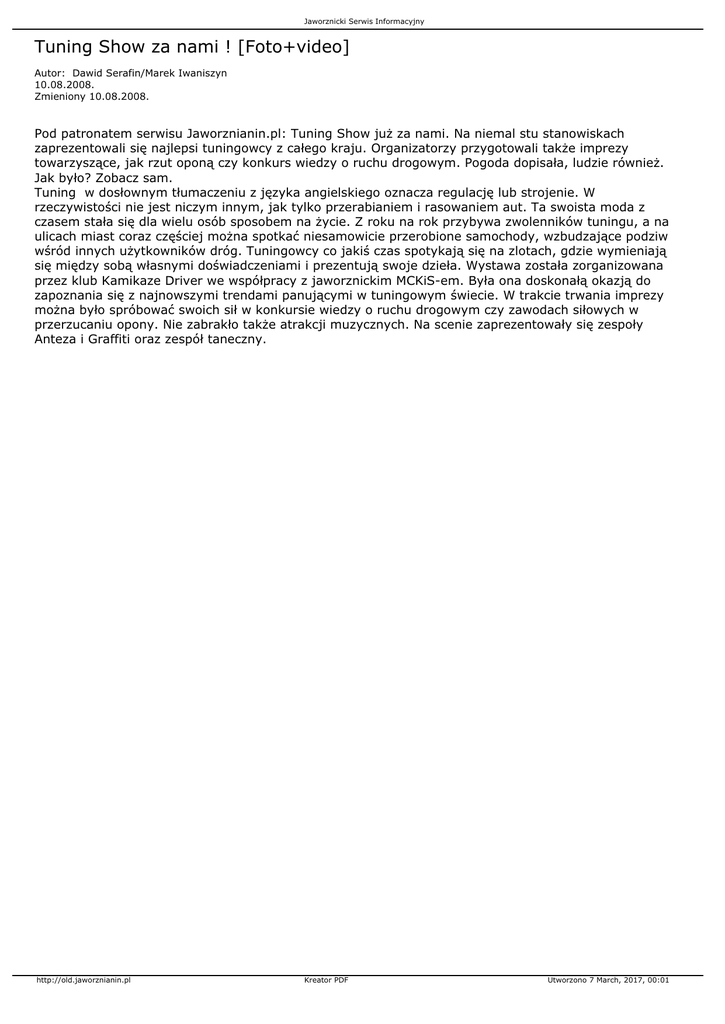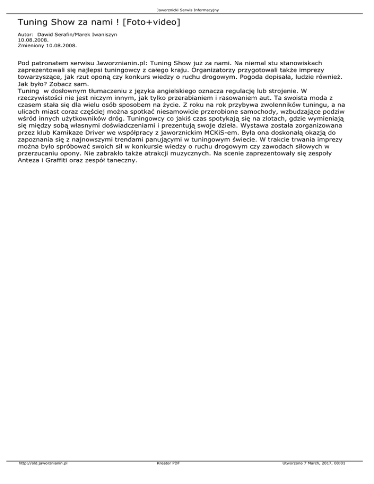 Jaworznicki Serwis Informacyjny Tuning Show za nami ! [Foto+video] Autor: Dawid Serafin/Marek Iwaniszyn 10.08.2008. Zmieniony 10.08.2008. Pod patronatem serwisu Jaworznianin.pl: Tuning Show już za nami. Na niemal stu stanowiskach zaprezentowali się najlepsi tuningowcy z całego kraju. Organizatorzy przygotowali także imprezy towarzyszące, jak rzut oponą czy konkurs wiedzy o ruchu drogowym. Pogoda dopisała, ludzie również. Jak było? Zobacz sam. Tuning w dosłownym tłumaczeniu z języka angielskiego oznacza regulację lub strojenie. W rzeczywistości nie jest niczym innym, jak tylko przerabianiem i rasowaniem aut. Ta swoista moda z czasem stała się dla wielu osób sposobem na życie. Z roku na rok przybywa zwolenników tuningu, a na ulicach miast coraz częściej można spotkać niesamowicie przerobione samochody, wzbudzające podziw wśród innych użytkowników dróg. Tuningowcy co jakiś czas spotykają się na zlotach, gdzie wymieniają się między sobą własnymi doświadczeniami i prezentują swoje dzieła. Wystawa została zorganizowana przez klub Kamikaze Driver we współpracy z jaworznickim MCKiS-em. Była ona doskonałą okazją do zapoznania się z najnowszymi trendami panującymi w tuningowym świecie. W trakcie trwania imprezy można było spróbować swoich sił w konkursie wiedzy o ruchu drogowym czy zawodach siłowych w przerzucaniu opony. Nie zabrakło także atrakcji muzycznych. Na scenie zaprezentowały się zespoły Anteza i Graffiti oraz zespół taneczny. http://old.jaworznianin.pl Kreator PDF Utworzono 7 March, 2017, 00:01