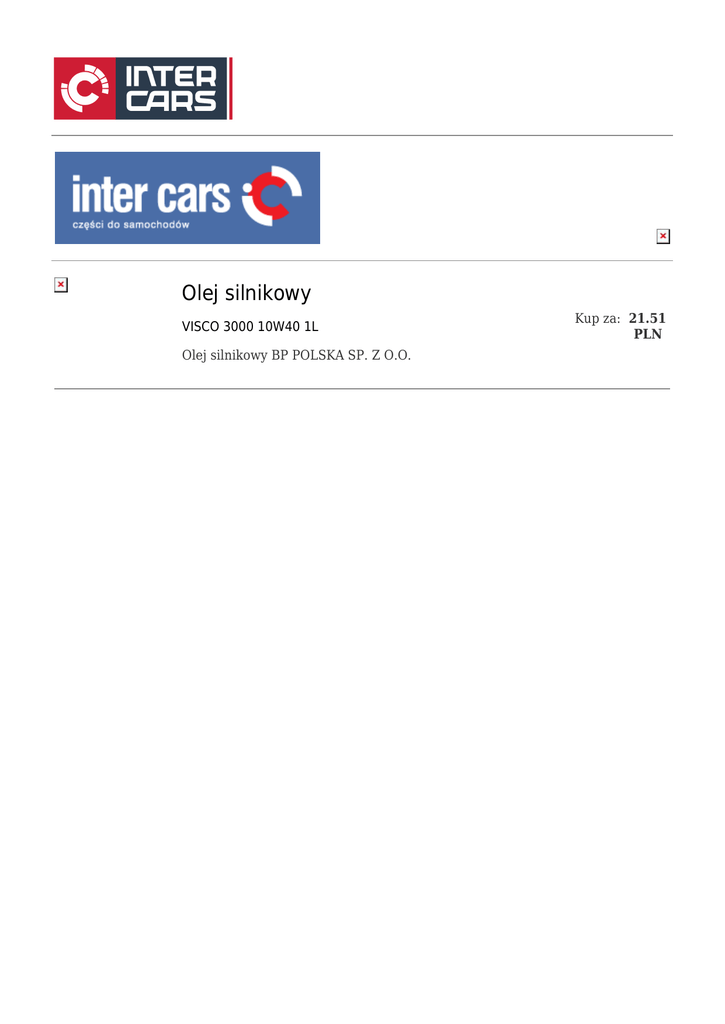 Olej silnikowy VISCO 3000 10W40 1L Olej silnikowy BP POLSKA SP. Z O.O. Kup za: 21.51 PLN Dodatkowe informacje katalogowe IC: Producent: BP Nazwa: Olej silnikowy Klasa lepkościowa SAE: 10W40 Pojemność [l]: 1 Norma: MB 229.1 Norma: FIAT 9.55535-D2 Norma: VW 501.01 Norma: VW 505.00 Specyfikacja API: SL Specyfikacja API: CF Specyfikacja ACEA: A3 Specyfikacja ACEA: B4 Linia: Visco Podział piktogramy: 1_Oleje silnikowe Przeznaczenie: Osobowe Olej silnikowy ma smarować i uszczelniać silnik oraz odbierać od niego ciepło. Ponadto, w zależności od klasy i przeznaczenia oleju, zawiera on dodatki polepszające smarowanie i przeciwkorozyjne. Visco 3000 jest przeznaczony do silników benzynowych oraz Diesla, w których wymagana jest specyfikacja API SL/CF, ACEA A3/B4 lub wcześniejsze. Oleje BP wykorzystują technologię CleanGuard, zapobiegającą powstawaniu w silniku osadów oraz utrzymującą go w czystości, niezbędnej do prawidłowej, wydajnej pracy. Silne właściwości płuczące tego oleju pozwalają utrzymywać minimalne opory pracy jednostki, co przekłada się na zmniejszone zużycie paliwa. Wymianę oleju powinno się przeprowadzać zgodnie z zaleceniami producenta pojazdu. Jeżeli pojazd jest użytkowany w trudnych warunkach, przebiegi między wymianami powinno się skrócić. Zużyty olej nie zapewnia niezbędnego smarowania silnika, dodatkowo może dochodzić do zrywania filmu olejowego, czego efektem jest praca silnika bez smarowania. Zużyty olej zawiera liczne pozostałości spalania paliwa, które dodatkowo zagęszczają go i mogą powodować zatykanie filtru oleju, co może doprowadzić do przegrzewania i zatarcia silnika. Wymianie oleju bezwzględnie powinna towarzyszyć wymiana filtra oleju. Ubytki oleju powinno się zastępować olejem o takich samych parametrach i najlepiej tego samego producenta. Co prawda oleje mieszają się, lecz dodatki stosowane przez różnych producentów mogą ze sobą nie współdziałać, pogarszając warunki pracy i ochronę silnika. Olejem półsyntetycznym można zastąpić olej mineralny tylko, jeśli silnik jest w dobrym stanie technicznym. Środki myjące zawarte w olejach półsyntetycznych mogą spowodować wypłukiwanie osadów i rozszczelnienie zużytego silnika. Infolinia: 801 80 20 20 07-03-2017 akcesoria.intercars.com.pl