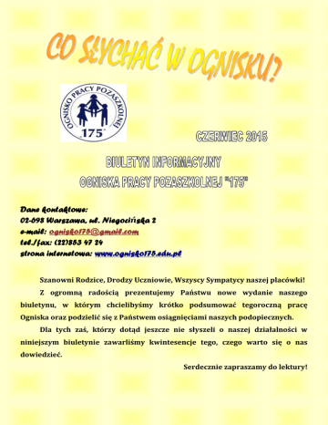 Dane kontaktowe: 02-698 Warszawa, ul. Niegocińska 2 e-mail: [email protected] tel./fax: (22)853 47 24 strona internetowa: www.ognisko175.edu.pl Szanowni Rodzice, Drodzy Uczniowie, Wszyscy Sympatycy naszej placówki! Z ogromną radością prezentujemy Państwu nowe wydanie naszego biuletynu, w którym chcielibyśmy krótko podsumować tegoroczną pracę Ogniska oraz podzielić się z Państwem osiągnięciami naszych podopiecznych. Dla tych zaś, którzy dotąd jeszcze nie słyszeli o naszej działalności w niniejszym biuletynie zawarliśmy kwintesencje tego, czego warto się o nas dowiedzieć. Serdecznie zapraszamy do lektury! Kim jesteśmy? W jaki sposób można do nas trafić? Ognisko Pracy Pozaszkolnej „175” jest państwową placówką oświatową. Organem prowadzącym jest Wydział Oświaty i Wychowania dla dzielnicy Mokotów. Siedzibą ogniska jest budynek Szkoły Podstawowej nr 271 przy ulicy Niegocińskiej 2. Co ważne, nasza działalność finansowana jest z budżetu państwa, z tego więc względu zajęcia są zupełnie bezpłatne. Działamy na terenie szkół: Szkoła Podstawowa nr 191 Szkoła Podstawowa 146 Szkoła Podstawowa 271 Gimnazjum nr 6 w nowym roku szkolnym rozpoczynamy również współpracę z SP 46 W roku 2014/2015 zaczęliśmy nową formę rekrutacji na zajęcia. Wszystkie zainteresowane osoby odsyłamy do naszej strony internetowej, aby zapoznać się z Regulaminem Rekrutacji www.ognisko175.edu.pl Jakie zajęcia proponujemy? Jakimi osiągnięciami możemy się podzielić? W naszej placówce nie brakuje zajęć zróżnicowanych tematycznie z tego też względu każde dziecko znajdzie dla siebie coś ciekawego. Proponujemy zajęcia rozwijające zdolności plastyczne, muzyczne, taneczne, sportowe. Grupy warsztatowe dobierane są zazwyczaj wg wieku uczestników. Grupy w przedziale od klas I do III Grupy w przedziale od klas IV do VI Warsztaty wokalne Na zajęciach dzieci uczą się poprawnej emisji głosu, starannej dykcji oraz interpretacji utworów. W tok zajęć wpleciony jest również warsztat z zakresu podstaw choreografii i wizerunku scenicznego. Wspólnie muzykując bawimy się i dzielimy radością, którą niesie ten szczególny rodzaj sztuki. Nabyte umiejętności prezentujemy na różnego rodzaju imprezach kulturalnych. Na zajęcia zaprasza p. Jakub Kącki Warsztaty biżuterii Nie ma nic piękniejszego niż własnoręcznie wykonana ozdoba. Podczas roku szkolnego 2014/2015 na zajęciach koła biżuterii powstało bardzo wiele takich ozdób. Aby móc je tworzyć, nauczyliśmy się wykorzystywać m.in. profesjonalne narzędzia używane przez rękodzielników do wyrobu biżuterii. Wykonywaliśmy kolczyki, bransoletki oraz naszyjniki, w trakcie każdych zajęć wyobraźnia uczestników okazywała się niewyczerpanym źródłem twórczych inspiracji. Na zajęcia zaprasza p. Magdalena Klepczarek Warsztaty szachowe „Nauczcie dzieci grać w szachy, a o ich przyszłość możecie być spokojni.” P. Morphy. Gra w szachy to nie tylko ćwiczenie logicznego myślenia czy twórczego rozwiązywania problemów. Szachy to przede wszystkim pomoc przy wszechstronnym i harmonijnym rozwoju dziecka, które bez wątpienia zaowocuje w przyszłości. Prowadzimy zarówno grupy początkujące, jak i zawansowane. Na zajęcia zaprasza p. Dagmara Przyczyna Koło teatralne Zajęcia koła teatralnego służą pobudzaniu wyobraźni oraz twórczego myślenia. Pomagamy rozwijać pasje literackie, teatralne i filmowe. W trakcie warsztatów w klasach młodszych odtwarzamy różnego rodzaju bajki, nawiązujemy do znanych legend, szukamy inspiracji w dziecięcej liryce. Starsze dzieci samodzielnie tworzą własne scenariusze przedstawień, którymi w trakcie zajęć świetnie się bawią. Na zajęcia zaprasza p. Karolina Marcjanik Koło tańca ludowego W trakcie zajęć, za pomocą różnego rodzaju tańców, dzieci zapoznają się z kulturą i tradycją poszczególnych regionów Polski, co pomaga im zrozumieć, jak ważna w życiu człowieka jest świadomość jego korzeni. Ponad to uczestnicy warsztatów przyswajają podstawową terminologię taneczną, a poprzez różnego rodzaju ćwiczenia kształtują poprawną sylwetkę oraz poczucie rytmu. Na zajęcia zaprasza p. Anna Waśko Koło gry na fortepianie, keyboardzie, flecie Towarzyszy nam prawie zawsze: w pracy, w zabawie, w czasie odpoczynku… Muzyka, bo o niej właśnie mowa, odgrywa ogromną rolę w harmonijnym rozwoju jednostki. Jedni mogą jej tylko słuchać, inni zaś potrafią ją również współtworzyć. Dla tej właśnie grupy osób są dedykowane nasze zajęcia. Wszystkich, którzy chcą zostać oczarowani dźwiękami fortepianu lub fletu serdecznie zapraszamy na nasze zajęcia. Na zajęcia zaprasza p. Maria Popławska-Staniszewska Łamigłówki Łamigłówki to jeden z najbardziej rozpowszechnionych i zarazem najbardziej efektywnych sposobów nauki poprzez rozrywkę. W trakcie zajęć dzieci wyrabiają sobie spostrzegawczość, pomysłowość oraz kreatywne myślenie. Ponad to wiele zabaw ma za zadanie uruchomić wyobraźnię dzieci przede wszystkim po to, aby mogły one z powodzeniem nauczyć się twórczego działania. Na zajęcia zaprasza p. Beata Leszczyńska Koło gry na gitarze O tym, jak istotna jest muzyka w życiu człowieka nie trzeba chyba nikogo przekonywać. O tym zaś, jak wiele może dawać radości i satysfakcji najlepiej zaświadczą nasi uczniowie, którzy w tegorocznym roku szkolnym odnieśli wiele sukcesów. Nasi podopieczni wystąpili m.in w wieczorze kolęd przy kościele Maksymiliana, natomiast uczeń Ogniska - Dominik Wysota uświetnił swoim występem IX Wojewódzki Konkurs Kolęd i Pastorałek. Wszystkich chętnych przyłączeniem się do grupy naszych zdolnych gitarzystów serdecznie zapraszamy. Na zajęcia zaprasza p. Tomasz Ziułek Koło tańca nowoczesnego Radość, euforia, ruch, dobra zabawa. W tych kilku słowach można zawrzeć sedno naszych zajęć. Na zajęciach koła tańca nowocz