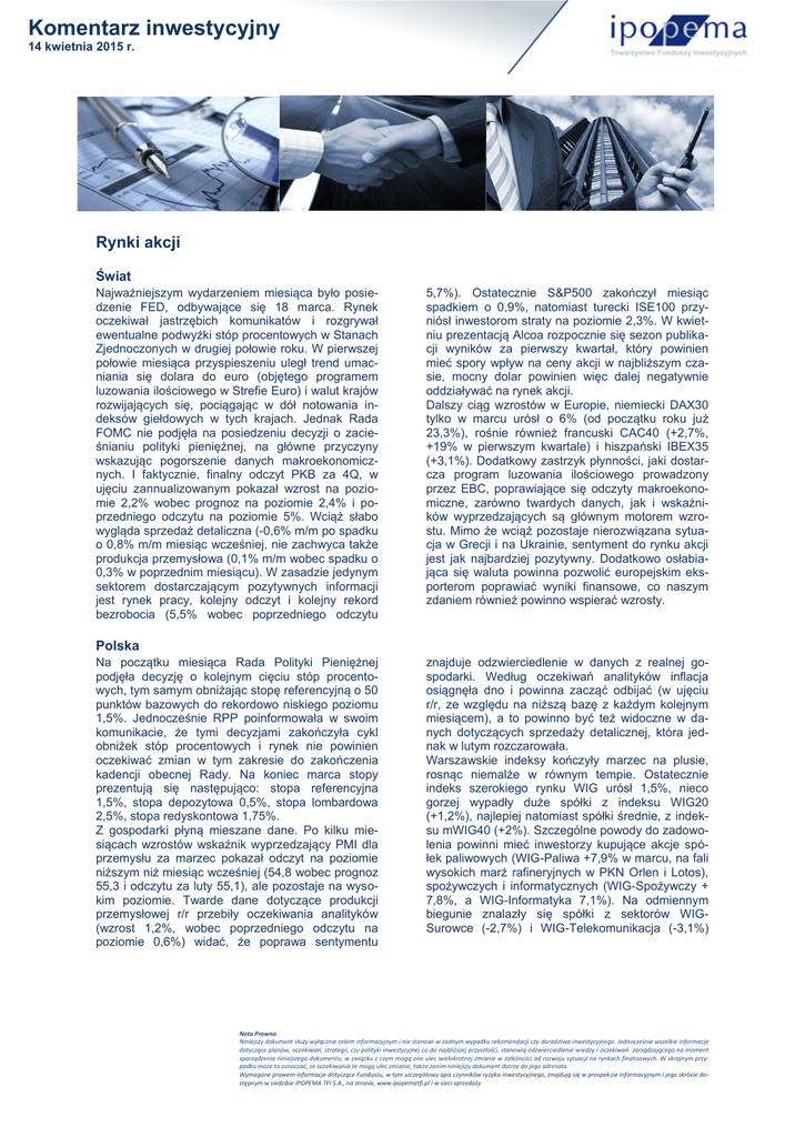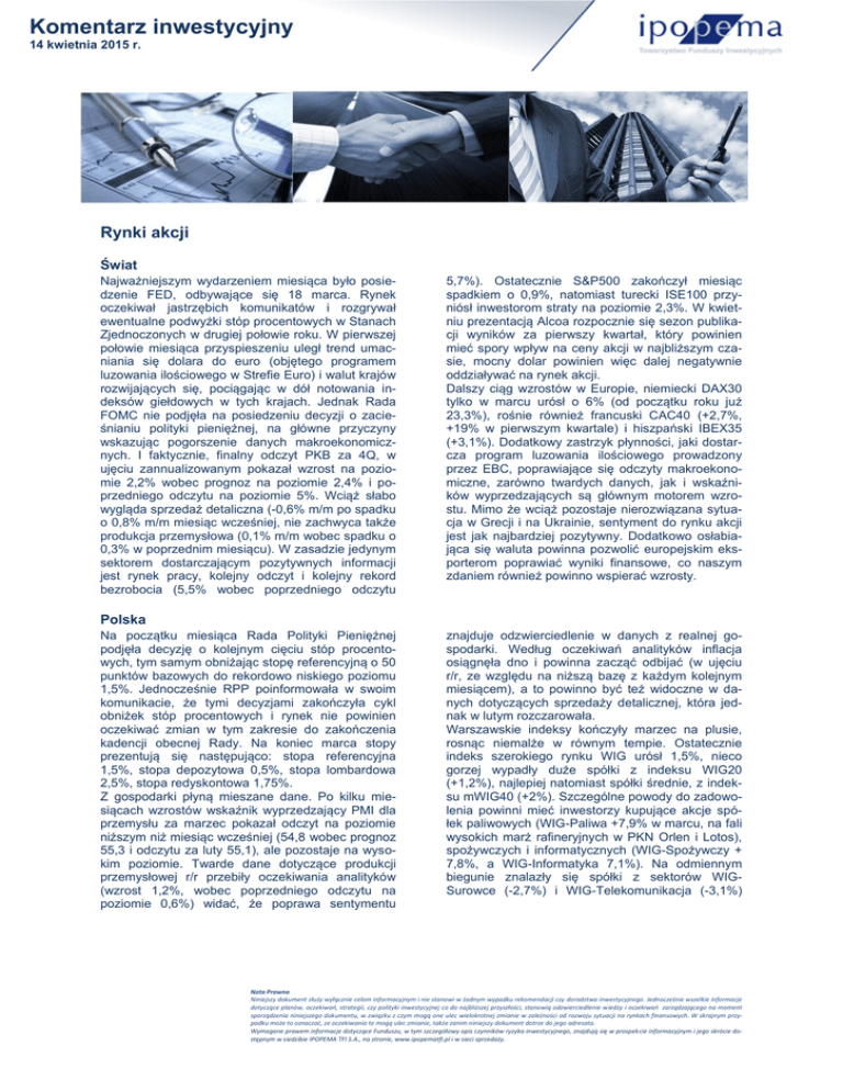 Komentarz inwestycyjny 14 kwietnia 2015 r. Rynki akcji Świat Najważniejszym wydarzeniem miesiąca było posiedzenie FED, odbywające się 18 marca. Rynek oczekiwał jastrzębich komunikatów i rozgrywał ewentualne podwyżki stóp procentowych w Stanach Zjednoczonych w drugiej połowie roku. W pierwszej połowie miesiąca przyspieszeniu uległ trend umacniania się dolara do euro (objętego programem luzowania ilościowego w Strefie Euro) i walut krajów rozwijających się, pociągając w dół notowania indeksów giełdowych w tych krajach. Jednak Rada FOMC nie podjęła na posiedzeniu decyzji o zacieśnianiu polityki pieniężnej, na główne przyczyny wskazując pogorszenie danych makroekonomicznych. I faktycznie, finalny odczyt PKB za 4Q, w ujęciu zannualizowanym pokazał wzrost na poziomie 2,2% wobec prognoz na poziomie 2,4% i poprzedniego odczytu na poziomie 5%. Wciąż słabo wygląda sprzedaż detaliczna (-0,6% m/m po spadku o 0,8% m/m miesiąc wcześniej, nie zachwyca także produkcja przemysłowa (0,1% m/m wobec spadku o 0,3% w poprzednim miesiącu). W zasadzie jedynym sektorem dostarczającym pozytywnych informacji jest rynek pracy, kolejny odczyt i kolejny rekord bezrobocia (5,5% wobec poprzedniego odczytu 5,7%). Ostatecznie S&P500 zakończył miesiąc spadkiem o 0,9%, natomiast turecki ISE100 przyniósł inwestorom straty na poziomie 2,3%. W kwietniu prezentacją Alcoa rozpocznie się sezon publikacji wyników za pierwszy kwartał, który powinien mieć spory wpływ na ceny akcji w najbliższym czasie, mocny dolar powinien więc dalej negatywnie oddziaływać na rynek akcji. Dalszy ciąg wzrostów w Europie, niemiecki DAX30 tylko w marcu urósł o 6% (od początku roku już 23,3%), rośnie również francuski CAC40 (+2,7%, +19% w pierwszym kwartale) i hiszpański IBEX35 (+3,1%). Dodatkowy zastrzyk płynności, jaki dostarcza program luzowania ilościowego prowadzony przez EBC, poprawiające się odczyty makroekonomiczne, zarówno twardych danych, jak i wskaźników wyprzedzających są głównym motorem wzrostu. Mimo że wciąż pozostaje nierozwiązana sytuacja w Grecji i na Ukrainie, sentyment do rynku akcji jest jak najbardziej pozytywny. Dodatkowo osłabiająca się waluta powinna pozwolić europejskim eksporterom poprawiać wyniki finansowe, co naszym zdaniem również powinno wspierać wzrosty. Polska Na początku miesiąca Rada Polityki Pieniężnej podjęła decyzję o kolejnym cięciu stóp procentowych, tym samym obniżając stopę referencyjną o 50 punktów bazowych do rekordowo niskiego poziomu 1,5%. Jednocześnie RPP poinformowała w swoim komunikacie, że tymi decyzjami zakończyła cykl obniżek stóp procentowych i rynek nie powinien oczekiwać zmian w tym zakresie do zakończenia kadencji obecnej Rady. Na koniec marca stopy prezentują się następująco: stopa referencyjna 1,5%, stopa depozytowa 0,5%, stopa lombardowa 2,5%, stopa redyskontowa 1,75%. Z gospodarki płyną mieszane dane. Po kilku miesiącach wzrostów wskaźnik wyprzedzający PMI dla przemysłu za marzec pokazał odczyt na poziomie niższym niż miesiąc wcześniej (54,8 wobec prognoz 55,3 i odczytu za luty 55,1), ale pozostaje na wysokim poziomie. Twarde dane dotyczące produkcji przemysłowej r/r przebiły oczekiwania analityków (wzrost 1,2%, wobec poprzedniego odczytu na poziomie 0,6%) widać, że poprawa sentymentu znajduje odzwierciedlenie w danych z realnej gospodarki. Według oczekiwań analityków inflacja osiągnęła dno i powinna zacząć odbijać (w ujęciu r/r, ze względu na niższą bazę z każdym kolejnym miesiącem), a to powinno być też widoczne w danych dotyczących sprzedaży detalicznej, która jednak w lutym rozczarowała. Warszawskie indeksy kończyły marzec na plusie, rosnąc niemalże w równym tempie. Ostatecznie indeks szerokiego rynku WIG urósł 1,5%, nieco gorzej wypadły duże spółki z indeksu WIG20 (+1,2%), najlepiej natomiast spółki średnie, z indeksu mWIG40 (+2%). Szczególne powody do zadowolenia powinni mieć inwestorzy kupujące akcje spółek paliwowych (WIG-Paliwa +7,9% w marcu, na fali wysokich marż rafineryjnych w PKN Orlen i Lotos), spożywczych i informatycznych (WIG-Spożywczy + 7,8%, a WIG-Informatyka 7,1%). Na odmiennym biegunie znalazły się spółki z sektorów WIGSurowce (-2,7%) i WIG-Telekomunikacja (-3,1%) Nota Prawna Niniejszy dokument służy wyłącznie celom informacyjnym i nie stanowi w żadnym wypadku rekomendacji czy doradztwa inwestycyjnego. Jednocześnie wszelkie informacje dotyczące planów, oczekiwań, strategii, czy polityki inwestycyjnej co do najbliższej przyszłości, stanowią odzwierciedlenie wiedzy i oczekiwań zarządzającego na moment sporządzenia niniejszego dokumentu, w związku z czym mogą one ulec wielokrotnej zmianie w zależności od rozwoju sytuacji na rynkach finansowych. W skrajnym przypadku może to oznaczać, ze oczekiwania te mogą ulec zmianie, także zanim niniejszy dokument dotrze do jego adresata. Wymagane prawem informacje dotyczące Funduszu, w tym szczegółowy opis czynników ryzyka inwestycyjnego, znajdują się w prospekcie informacyjnym i jego skrócie dostępnym w siedzibie IPOPEMA TFI S.A., na stronie, www.ipopematfi.pl i w sieci sprzedaży. Komentarz inwestycyjny 14 kwietnia 2015 r. Rynek długu W minionym miesiącu rentowności krajowych obligacji skarbowych wzrosły na całej krzywej dochodowości. Najmocniejszy ruch zanotowały papiery z długiego końca krzywej (10 lat), wzrost o 13 pb (punktów bazowych) do poziomu 2,28%, rentowność na krótkim końcu (2 lata) wzrosła o 2 pb do poziomu 1,6%, natomiast obligacje 5-letnie odnotowały wzrost rentowności o 5 pb do 1,92%. Na marcowym posiedzeniu Rada Polityki Pieniężnej (RPP) podjęła decyzję o obniżeniu podstawowej stopy procentowej o 50 pb. Choć skala cięcia była zdecydowanie wyższa niż oczekiwał tego rynek, to mieliśmy do czynienia z dość gwałtownym wzrostem rentowności krajowych obligacji. Reakcja rynku