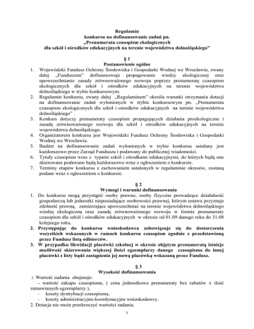 Regulamin konkursu na dofinansowanie zadań pn. „Prenumerata czasopism ekologicznych dla szkół i ośrodków edukacyjnych na terenie województwa dolnośląskiego” 1. 2. 3. 4. 5. 6. 7. §1 Postanowienie ogólne Wojewódzki Fundusz Ochrony Środowiska i Gospodarki Wodnej we Wrocławiu, zwany dalej „Funduszem” dofinansowuje propagowanie wiedzy ekologicznej oraz upowszechnianie zasady zrównoważonego rozwoju poprzez prenumeratę czasopism ekologicznych dla szkół i ośrodków edukacyjnych na terenie województwa dolnośląskiego w trybie konkursowym. Regulamin konkursu, zwany dalej „Regulaminem” określa warunki otrzymania dotacji na dofinansowanie zadań wyłonionych w trybie konkursowym pn. „Prenumerata czasopism ekologicznych dla szkół i ośrodków edukacyjnych na terenie województwa dolnośląskiego” . Konkurs dotyczy prenumeraty czasopism propagujących działania proekologiczne i zasadę zrównoważonego rozwoju dla szkół i ośrodków edukacyjnych na terenie województwa dolnośląskiego. Organizatorem konkursu jest Wojewódzki Fundusz Ochrony Środowiska i Gospodarki Wodnej we Wrocławiu. Budżet na dofinansowanie zadań wyłonionych w trybie konkursu ustalany jest każdorazowo przez Zarząd Funduszu i podawany do publicznej wiadomości. Tytuły czasopism wraz z typami szkół i ośrodkami edukacyjnymi, do których będą one skierowane podawane będą każdorazowo wraz z ogłoszeniem o konkursie. Terminy etapów konkursu z zachowaniem ustalonych w regulaminie okresów, zostaną podane wraz z ogłoszeniem o konkursie. §2 Wymogi i warunki dofinansowania 1. Do konkursu mogą przystąpić osoby prawne, osoby fizyczne prowadzące działalność gospodarczą lub jednostki nieposiadające osobowości prawnej, którym ustawa przyznaje zdolność prawną, zamierzające upowszechniać na terenie województwa dolnośląskiego wiedzę ekologiczną oraz zasadę zrównoważonego rozwoju w formie prenumeraty czasopism dla szkół i ośrodków edukacyjnych w okresie od 01.09 danego roku do 31.08 kolejnego roku. 2. Przystępując do konkursu wnioskodawca zobowiązuje się do dostarczenia wszystkich wskazanych w ramach konkursu czasopism zgodnie z przedstawioną przez Fundusz listą odbiorców. 3. W przypadku likwidacji placówki szkolnej w okresie objętym prenumeratą istnieje możliwość skierowania większej ilości egzemplarzy danego czasopisma do innej placówki z listy bądź zastąpienia jej nową placówką wskazaną przez Fundusz. §3 Wysokość dofinansowania 1. Wartość zadania obejmuje: - wartość zakupu czasopisma, ( cena jednostkowa prenumeraty bez rabatów x ilość zamawianych egzemplarzy ), - koszty dystrybucji czasopisma, - koszty administracyjno-koordynacyjne wnioskodawcy. 2. Dotacja nie może przekroczyć wartości zadania. 1 3. Wysokość dofinansowania może stanowić do 100 % wartości zadania pomniejszonej o udzielone rabaty. §4 Procedura przeprowadzenia konkursu 1. Ogłoszenie o konkursie: Informacja o ogłoszeniu konkursu zostanie rozpowszechniona na stronie internetowej Funduszu www.wfosigw.wroclaw.pl oraz w miejscu powszechnie dostępnym w siedzibie Funduszu i oddziałach biura Funduszu. 2. Nabór wniosków : a) W celu przystąpienia do konkursu należy złożyć wniosek opracowany według obowiązującego wzoru wraz z załącznikami w sekretariacie siedziby Funduszu lub oddziałach biura Funduszu w terminie podanym w ogłoszeniu konkursu. b) Formularz wniosku dostępny jest na stronie internetowej Funduszu. 3. Ocena formalna wniosku: a) Rejestracji i oceny formalnej wniosku dokonuje pracownik Funduszu w terminie do14 dni od daty zakończenia naboru wniosków. b) Na etapie oceny formalnej dopuszcza się możliwość uzupełnienia wniosku o dodatkowe lub brakujące dokumenty wymagane na etapie oceny formalnej w terminie do 10 dni od daty otrzymania pisma. . c) W przypadku braku uzupełnień w wymaganym terminie, wniosek ten zostaje wyłączony z dalszego postępowania. d) Wniosek, który otrzymał negatywną ocenę formalną jest wyłączony z dalszego postępowania. 4. Ocena Komisji Konkursowej: a) Warunkiem dopuszczenia wniosku do oceny Komisji Konkursowej jest pozytywna ocena formalna wniosku. b) Komisja Konkursowa dokonuje oceny wniosków i przedkłada Zarządowi Funduszu w terminie do 45 dni od daty zakończenia naboru wniosków, propozycję rozstrzygnięcia konkursu w postaci listy rankingowej ocenionych wniosków. c) Skład Komisji Konkursowej ustala Zarząd Funduszu. d) Komisja Konkursowa dokonuje oceny wniosków, biorąc pod uwagę kryterium ceny. e) Komisja Konkursowa sporządza Protokół z posiedzenia oraz listę rankingową wniosków i przedkłada Zarządowi Funduszu. 5. Decyzja organów Funduszu: a) Organ Funduszu podejmuje decyzję o wyborze najkorzystniejszej oferty w terminie do 60 dni od dnia przekazania przez Komisję Konkursową listy rankingowej ocenionych wniosków. b) Wnioskodawcy, których wnioski zostały rozpatrzone przez organ Funduszu otrzymają pisemną informację o wynikach rozstrzygnięcia konkursu . Informacje zostaną wysłane w terminie do 14 dni od daty podjęcia decyzji przez organ Funduszu. 6. Zawarcie umowy: a) Udzielenie dotacji odbywa się na podstawie umowy cywilnoprawnej zawartej pomiędzy Funduszem a Wnioskodawcą, w oparciu o obowiązujące w Funduszu wzory umów. b) Zawarcie umowy dotacji następuje w terminie do 45 dni od daty podjęcia pozytywnej decyzji przez organ Funduszu, pod warunkiem przedłożenia przez Wnioskodawcę wymaganych przez Fundusz dokumentów, koniecznych do zawarcia umowy. c) Umowa może zostać zawarta po przedstawieniu umowy z wykonawcami zadania. 2 7. d) Dotowany w umowach z wykonawcami zadania zobowiąże ich do zamieszczenia w prenumerowanych w ramach konkursu czasopismach następującego zapisu: „Prenumerata czasopisma dla szkół ( należy podać poziom szkół ) w województwie dolnośląskim dofinansowana jest ze środków WFOŚiGW we Wrocławiu. Poglądy autorów i t
