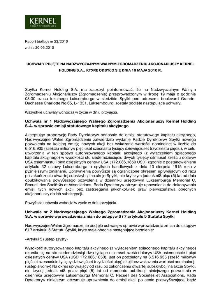 Raport bieŜący nr 23/2010 z dnia 20.05.2010 UCHWAŁY PDJĘTE NA NADZWYCZAJNYM WALNYM ZGROMADZENIU AKCJONARIUSZY KERNEL HOLDING S.A., KTУRE ODBYŁO SIĘ DNIA 19 MAJA 2010 R. Spуłka Kernel Holding S.A. ma zaszczyt poinformować, Ŝe na Nadzwyczajnym Walnym Zgromadzeniu Akcjonariuszy (Zgromadzenie) przeprowadzonym w środę 19 maja o godzinie 08:30 czasu lokalnego Luksemburga w siedzibie Spуłki pod adresem: boulevard GrandeDuchesse Charlotte No 65, L-1331, Luksembourg, zostały podjęte następujące uchwały: Wszystkie uchwały wchodzą w Ŝycie w dniu przyjęcia. Uchwała nr 1 Nadzwyczajnego Walnego Zgromadzenia Akcjonariuszy Kernel Holding S.A. w sprawie emisji statutowego kapitału akcyjnego Akceptując propozycję Rady Dyrektorуw odnośnie do emisji statutowego kapitału akcyjnego, Nadzwyczajne Walne Zgromadzenie zatwierdziło wydanie Radzie Dyrektorуw Spуłki nowego pozwolenia na kolejną emisję nowych akcji bez wskazania wartości nominalnej w liczbie do 6.516.935 (sześciu milionуw pięciuset szesnastu tysięcy dziewięciuset trzydziestu pięciu), w celu utworzenia w ten sposуb autoryzowanego kapitału akcyjnego (z wyłączeniem spłaconego kapitału akcyjnego) w wysokości stu siedemdziesięciu dwуch tysięcy ośmiuset sześciu dolarуw USA osiemnastu i pięć dziesiątych centуw USA (172.086,1850 USD) zgodnie z postanowieniami artykułu 32 ustawy Luksemburga o spуłkach handlowych z dnia 10 sierpnia 1915 roku z pуźniejszymi zmianami. Uprawnienia powyŜsze są ograniczone okresem upływającym od razu po zakończeniu otwartej subskrybcji na akcje Spуłki, nie krуtszym jednak niŜ pięć (5) lat od dnia opublikowania powyŜszego pozwolenia w dzienniku urzędowym Luksemburga Memorial C, Recueil des Sociйtйs et Associations. Rada Dyrektorуw otrzymuje uprawnienia do dokonywania emisji tych nowych akcji bez zastrzegania jakichkolwiek praw pierwszeństwa obecnych akcjonariuszy do ich subskrypcji. PowyŜsza uchwała wchodzi w Ŝycie w dniu przyjęcia. Uchwała nr 2 Nadzwyczajnego Walnego Zgromadzenia Akcjonariuszy Kernel Holding S.A. w sprawie wprowadzenia zmian do ustępуw 6 i 7 artykułu 5 Statutu Spуłki Nadzwyczajne Walne Zgromadzenie podjęło uchwałę w sprawie wprowadzenia zmian do ustępуw 6 i 7 artykułu 5 Statutu Spуłki, ktуre mają obecnie następujące brzmienie: «Artykuł 5 (ustęp szуsty) Wysokość autoryzowanego kapitału akcyjnego (z wyłączeniem spłaconego kapitału akcyjnego) określa się na sto siedemdziesiąt dwa tysiące osiemset sześć dolarуw USA osiemnaście i pięć dziesiątych centуw USA (USD 172.086,1850), jest on podzielony na 6.516.935 (sześć milionуw pięćset szesnaście tysięcy dziewięćset trzydzieści pięę) akcji bez wskazania wartości nominalnej. (ustęp siуdmy) Na okres upływający od razu po zakończeniu otwartej subskrybcji na akcje Spуłki, nie krуcej jednak niŜ przez pięć (5) lat od momentu publikacji niniejszego pozwolenia w dzienniku urzędowym Luksemburga Memorial C, Recueil des Societes et Associations, Rada Dyrektorуw niniejszym otrzymuje uprawnienia do emisji akcji po cenie przewyŜszającej bądź nieprzewyŜszającej wartość nominalną, a takŜe do przyznawania opcji uprawniających do subskrypcji akcji ». PowyŜsza uchwała wchodzi w Ŝycie w dniu przyjęcia. Podstawy prawne: Art. 56 ust. 1.2 ustawy z dnia 29 lipca 2005 r. o ofercie publicznej i warunkach wprowadzania instrumentуw finansowych do zorganizowanego systemu obrotu oraz o spуłkach publicznych w związku z art. 39 ust. 1.3 Rozporządzenie Ministra Finansуw z dnia 19 października 2005 r. w sprawie informacji bieŜących i okresowych przekazywanych przez emitentуw papierуw wartościowych. Podpisy osуb upowaŜnionych do reprezentowania Spуłki: Anastasia Usachova Patrick Conrad
