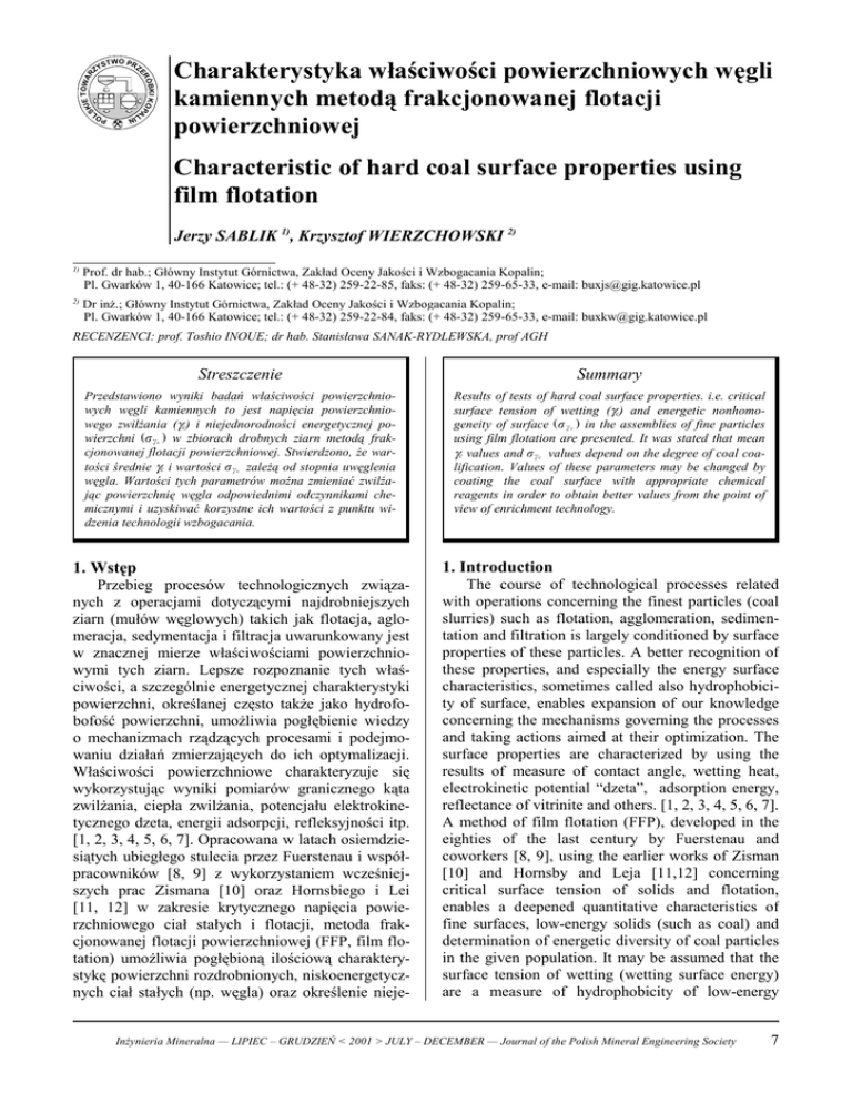 TWO PR Z IE TOWAR SK ÓBKI KOPA ER S ZY Charakterystyka właściwości powierzchniowych węgli kamiennych metodą frakcjonowanej flotacji powierzchniowej N LI PO L Characteristic of hard coal surface properties using film flotation Jerzy SABLIK 1), Krzysztof WIERZCHOWSKI 2) 1) Prof. dr hab.; Główny Instytut Górnictwa, Zakład Oceny Jakości i Wzbogacania Kopalin; Pl. Gwarków 1, 40-166 Katowice; tel.: (+ 48-32) 259-22-85, faks: (+ 48-32) 259-65-33, e-mail: [email protected] 2) Dr inż.; Główny Instytut Górnictwa, Zakład Oceny Jakości i Wzbogacania Kopalin; Pl. Gwarków 1, 40-166 Katowice; tel.: (+ 48-32) 259-22-84, faks: (+ 48-32) 259-65-33, e-mail: [email protected] RECENZENCI: prof. Toshio INOUE; dr hab. Stanisława SANAK-RYDLEWSKA, prof AGH Streszczenie Summary Przedstawiono wyniki badań właściwości powierzchniowych węgli kamiennych to jest napięcia powierzchniowego zwilżania (γc) i niejednorodności energetycznej powierzchni (" c ) w zbiorach drobnych ziarn metodą frakcjonowanej flotacji powierzchniowej. Stwierdzono, że wartości średnie γc i wartości " c zależą od stopnia uwęglenia węgla. Wartości tych parametrów można zmieniać zwilżając powierzchnię węgla odpowiednimi odczynnikami chemicznymi i uzyskiwać korzystne ich wartości z punktu widzenia technologii wzbogacania. Results of tests of hard coal surface properties. i.e. critical surface tension of wetting (γc) and energetic nonhomogeneity of surface ( " c ) in the assemblies of fine particles using film flotation are presented. It was stated that mean γc values and " c values depend on the degree of coal coalification. Values of these parameters may be changed by coating the coal surface with appropriate chemical reagents in order to obtain better values from the point of view of enrichment technology. 1. Wstęp 1. Introduction Przebieg procesów technologicznych związanych z operacjami dotyczącymi najdrobniejszych ziarn (mułów węglowych) takich jak flotacja, aglomeracja, sedymentacja i filtracja uwarunkowany jest w znacznej mierze właściwościami powierzchniowymi tych ziarn. Lepsze rozpoznanie tych właściwości, a szczególnie energetycznej charakterystyki powierzchni, określanej często także jako hydrofobofość powierzchni, umożliwia pogłębienie wiedzy o mechanizmach rządzących procesami i podejmowaniu działań zmierzających do ich optymalizacji. Właściwości powierzchniowe charakteryzuje się wykorzystując wyniki pomiarów granicznego kąta zwilżania, ciepła zwilżania, potencjału elektrokinetycznego dzeta, energii adsorpcji, refleksyjności itp. [1, 2, 3, 4, 5, 6, 7]. Opracowana w latach osiemdziesiątych ubiegłego stulecia przez Fuerstenau i współpracowników [8, 9] z wykorzystaniem wcześniejszych prac Zismana [10] oraz Hornsbiego i Lei [11, 12] w zakresie krytycznego napięcia powierzchniowego ciał stałych i flotacji, metoda frakcjonowanej flotacji powierzchniowej (FFP, film flotation) umożliwia pogłębioną ilościową charakterystykę powierzchni rozdrobnionych, niskoenergetycznych ciał stałych (np. węgla) oraz określenie nieje- The course of technological processes related with operations concerning the finest particles (coal slurries) such as flotation, agglomeration, sedimentation and filtration is largely conditioned by surface properties of these particles. A better recognition of these properties, and especially the energy surface characteristics, sometimes called also hydrophobicity of surface, enables expansion of our knowledge concerning the mechanisms governing the processes and taking actions aimed at their optimization. The surface properties are characterized by using the results of measure of contact angle, wetting heat, electrokinetic potential “dzeta”, adsorption energy, reflectance of vitrinite and others. [1, 2, 3, 4, 5, 6, 7]. A method of film flotation (FFP), developed in the eighties of the last century by Fuerstenau and coworkers [8, 9], using the earlier works of Zisman [10] and Hornsby and Leja [11,12] concerning critical surface tension of solids and flotation, enables a deepened quantitative characteristics of fine surfaces, low-energy solids (such as coal) and determination of energetic diversity of coal particles in the given population. It may be assumed that the surface tension of wetting (wetting surface energy) are a measure of hydrophobicity of low-energy Inżynieria Mineralna — LIPIEC – GRUDZIEŃ < 2001 > JULY – DECEMBER — Journal of the Polish Mineral Engineering Society 7 dnorodności energetycznej ziarn węglowych w danej populacji. Można założyć, że wartości napięcia powierzchniowego zwilżania (energii powierzchniowej zwilżania) są miarą hydrofobowości powierzchni ciał niskoenergetycznych. W niniejszym opracowaniu przedstawiono wyniki dotychczasowych badań właściwości powierzchniowych węgla metodą FFP wykonanych przez autorów niniejszego artykułu. solids. This study shows results of the hitherto research of surface coal properties using FFP method by the authors of this paper. 2. Istota metody FFP i jej podstawy teoretyczne 2. The principle of FFP method and its theoretical basis Opracowana przez Fuerstenau i jego współpracowników [8, 9] metoda FFP polega na umieszczeniu na powierzchni cieczy monowarstwy ziarn, które w zależności od ich napięcia powierzchniowego i napięcia powierzchniowego cieczy albo utrzymają się na powierzchni tej cieczy albo utoną. Użycie do badań cieczy o zmieniającym się napięciu powierzchniowym (np. malejącym) powoduje, że liczba ziarn utrzymujących się na powierzchni cieczy (liofobowych) maleje, zaś liczba ziarn tonących (liofilowych) rośnie. Badania węgla prowadzi się na powierzchni wody, metanolu oraz ich mieszanin o różnym składzie, a więc o różnym napięciu powierzchniowym w zakresie od 22 mN/m do 72 mN/m. Zakres ten można rozszerzyć stosując wodne roztwory chlorku sodu [13]. Uzyskane w wyniku takich badań dane umo