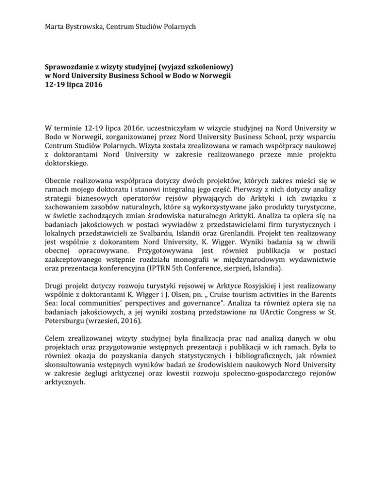 Marta Bystrowska, Centrum Studiów Polarnych Sprawozdanie z wizyty studyjnej (wyjazd szkoleniowy) w Nord University Business School w Bodo w Norwegii 12-19 lipca 2016 W terminie 12-19 lipca 2016r. uczestniczyłam w wizycie studyjnej na Nord University w Bodo w Norwegii, zorganizowanej przez Nord University Business School, przy wsparciu Centrum Studiów Polarnych. Wizyta została zrealizowana w ramach współpracy naukowej z doktorantami Nord University w zakresie realizowanego przeze mnie projektu doktorskiego. Obecnie realizowana współpraca dotyczy dwóch projektów, których zakres mieści się w ramach mojego doktoratu i stanowi integralną jego część. Pierwszy z nich dotyczy analizy strategii biznesowych operatorów rejsów pływających do Arktyki i ich związku z zachowaniem zasobów naturalnych, które są wykorzystywane jako produkty turystyczne, w świetle zachodzących zmian środowiska naturalnego Arktyki. Analiza ta opiera się na badaniach jakościowych w postaci wywiadów z przedstawicielami firm turystycznych i lokalnych przedstawicieli ze Svalbardu, Islandii oraz Grenlandii. Projekt ten realizowany jest wspólnie z dokorantem Nord University, K. Wigger. Wyniki badania są w chwili obecnej opracowywane. Przygotowywana jest również publikacja w postaci zaakceptowanego wstępnie rozdziału monografii w międzynarodowym wydawnictwie oraz prezentacja konferencyjna (IPTRN 5th Conference, sierpień, Islandia). Drugi projekt dotyczy rozwoju turystyki rejsowej w Arktyce Rosyjskiej i jest realizowany wspólnie z doktorantami K. Wigger i J. Olsen, pn. „ Cruise tourism activities in the Barents Sea: local communities’ perspectives and governance”. Analiza ta również opiera się na badaniach jakościowych, a jej wyniki zostaną przedstawione na UArctic Congress w St. Petersburgu (wrzesień, 2016). Celem zrealizowanej wizyty studyjnej była finalizacja prac nad analizą danych w obu projektach oraz przygotowanie wstępnych prezentacji i publikacji w ich ramach. Była to również okazja do pozyskania danych statystycznych i bibliograficznych, jak również skonsultowania wstępnych wyników badań ze środowiskiem naukowych Nord University w zakresie żeglugi arktycznej oraz kwestii rozwoju społeczno-gospodarczego rejonów arktycznych.