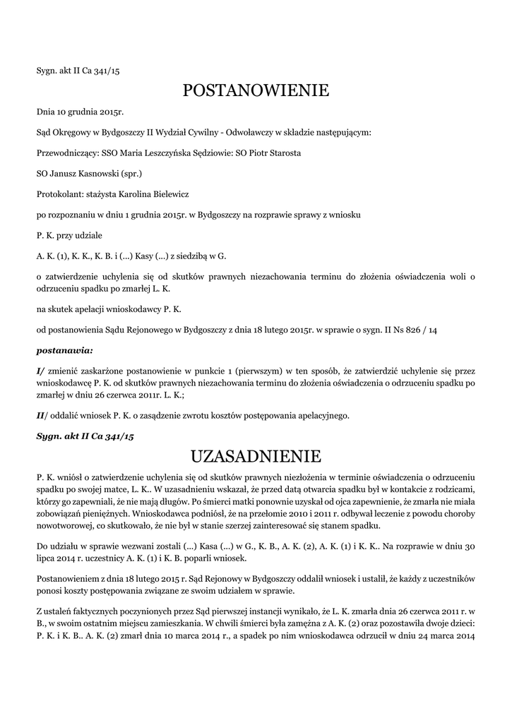 Sygn. akt II Ca 341/15 POSTANOWIENIE Dnia 10 grudnia 2015r. Sąd Okręgowy w Bydgoszczy II Wydział Cywilny - Odwoławczy w składzie następującym: Przewodniczący: SSO Maria Leszczyńska Sędziowie: SO Piotr Starosta SO Janusz Kasnowski (spr.) Protokolant: stażysta Karolina Bielewicz po rozpoznaniu w dniu 1 grudnia 2015r. w Bydgoszczy na rozprawie sprawy z wniosku P. K. przy udziale A. K. (1), K. K., K. B. i (...) Kasy (...) z siedzibą w G. o zatwierdzenie uchylenia się od skutków prawnych niezachowania terminu do złożenia oświadczenia woli o odrzuceniu spadku po zmarłej L. K. na skutek apelacji wnioskodawcy P. K. od postanowienia Sądu Rejonowego w Bydgoszczy z dnia 18 lutego 2015r. w sprawie o sygn. II Ns 826 / 14 postanawia: I/ zmienić zaskarżone postanowienie w punkcie 1 (pierwszym) w ten sposób, że zatwierdzić uchylenie się przez wnioskodawcę P. K. od skutków prawnych niezachowania terminu do złożenia oświadczenia o odrzuceniu spadku po zmarłej w dniu 26 czerwca 2011r. L. K.; II/ oddalić wniosek P. K. o zasądzenie zwrotu kosztów postępowania apelacyjnego. Sygn. akt II Ca 341/15 UZASADNIENIE P. K. wniósł o zatwierdzenie uchylenia się od skutków prawnych niezłożenia w terminie oświadczenia o odrzuceniu spadku po swojej matce, L. K.. W uzasadnieniu wskazał, że przed datą otwarcia spadku był w kontakcie z rodzicami, którzy go zapewniali, że nie mają długów. Po śmierci matki ponownie uzyskał od ojca zapewnienie, że zmarła nie miała zobowiązań pieniężnych. Wnioskodawca podniósł, że na przełomie 2010 i 2011 r. odbywał leczenie z powodu choroby nowotworowej, co skutkowało, że nie był w stanie szerzej zainteresować się stanem spadku. Do udziału w sprawie wezwani zostali (...) Kasa (...) w G., K. B., A. K. (2), A. K. (1) i K. K.. Na rozprawie w dniu 30 lipca 2014 r. uczestnicy A. K. (1) i K. B. poparli wniosek. Postanowieniem z dnia 18 lutego 2015 r. Sąd Rejonowy w Bydgoszczy oddalił wniosek i ustalił, że każdy z uczestników ponosi koszty postępowania związane ze swoim udziałem w sprawie. Z ustaleń faktycznych poczynionych przez Sąd pierwszej instancji wynikało, że L. K. zmarła dnia 26 czerwca 2011 r. w B., w swoim ostatnim miejscu zamieszkania. W chwili śmierci była zamężna z A. K. (2) oraz pozostawiła dwoje dzieci: P. K. i K. B.. A. K. (2) zmarł dnia 10 marca 2014 r., a spadek po nim wnioskodawca odrzucił w dniu 24 marca 2014 r. Z dalszych ustaleń Sądu wynikało, że informację o zadłużeniu matki wnioskodawca uzyskał około 8 miesięcy po jej śmierci z przesłanego na adres domowy wezwania (...) Kasy (...) W dniu 15 grudnia 2014 r. wnioskodawca przed Sądem Rejonowym w Bydgoszczy złożył oświadczenie o odrzuceniu spadku po L. K.. Powyższy stan faktyczny Sąd ustalił na podstawie zebranych w sprawie dokumentów oraz zeznań uczestników. Przechodząc do oceny prawnej tych ustaleń Sąd Rejonowy na wstępie wskazał, że nabycie spadku następuje z chwilą jego otwarcia. Jednakże nabycie to nie ma charakteru definitywnego, co wynika z art. 1012 k.c. wskazującego w jaki sposób spadkobierca może spadek przyjąć, a także że może spadek odrzucić. Oświadczenie w tym względzie może być złożone w ciągu sześciu miesięcy od dnia dowiedzenia się o tytule swojego powołania do spadku. Brak oświadczenia skutkuje prostym przyjęciem spadku. Omawiane oświadczenie jest jednostronną czynnością prawną, do której zastosowanie znajdują przepisy o wadach oświadczenia woli (art. 84 i 87 k.c.), z modyfikacjami wynikającymi z art. 1019 k.c., który daje możliwość uchylenia się od skutków prawych tego oświadczenia, w tym niezłożenia w terminie oświadczenia o przyjęciu lub odrzuceniu spadku, jeżeli było ono wynikiem błędu prawnie istotnego. Uchylenie się od tego błędu jest możliwe przed upływem roku od jego wykrycia. Sąd uznał, że wnioskodawca nie wykazał, by uchylenie się od skutków niezłożenia w terminie oświadczenia o odrzuceniu spadku nastąpiło w terminie rocznym od daty wykrycia błędu. Wnioskodawca w trakcie przesłuchania przyznał, że około 8 miesięcy po śmierci matki na adres domowy przyszło ponaglenie od wierzyciela ( (...)). W ocenie Sądu z tą chwilą wnioskodawca uzyskał informację o zadłużeniu matki, a zatem wykrył swój błąd dotyczący przedmiotu spadku. Z tą też chwilą rozpoczął bieg termin do podjęcia działań w przedmiocie uchylenia się od skutków prawnych niezachowania terminu do odrzucenia spadku. Tym samym przedmiotowy wniosek, złożony po ponad 2 latach od wykrycia błędu nie mógł zostać zaakceptowany. Uznając zatem, że prawo wnioskodawcy do domagania się zatwierdzenia przez Sąd uchylenia się do skutków prawnych niezłożenia oświadczenia o odrzuceniu spadku w terminie wygasło (roczny termin zawity), Sąd Rejonowy wniosek oddalił. O kosztach postępowania w sprawie orzekł na podstawie art. 520 § 1 k.p.c. Apelację od postanowienia złożył wnioskodawca P. K. domagając się jego zmiany poprzez wydanie orzeczenia zgodnego z wnioskiem oraz zasądzenia kosztów postępowania odwoławczego. Skarżący zarzucił Sądowi pierwszej instancji: - naruszenie przepisu prawa procesowego w postaci art. 233 § 1 k.p.c. poprzez dokonanie dowolnej i wybiórczej oceny dowodu z przesłuchania wnioskodawcy, która skutkowała przyjęciem, że dowiedział się on o długu matki około 8 miesięcy po jej śmierci; - dokonanie błędnych ustaleń faktycznych polegających na przyjęciu, że wnioskodawcy upłynął termin na uchylenie się od skutków prawnych niezłożenia oświadczenia woli o odrzuceniu spadku; - naruszenie przepisów prawa materialnego w postaci art. 1019 § 2 k.c. w zw. z art. 88 § 2 k.c. poprzez ich niezastosowanie z uwagi na rzekome wygaśnięcie prawa do domagania się zatwierdzenia uchylenia skutków prawnych w sytuacji, gdy z okoliczności sprawy wynika, że stosowne oświadczenie wnioskodawcy zosta