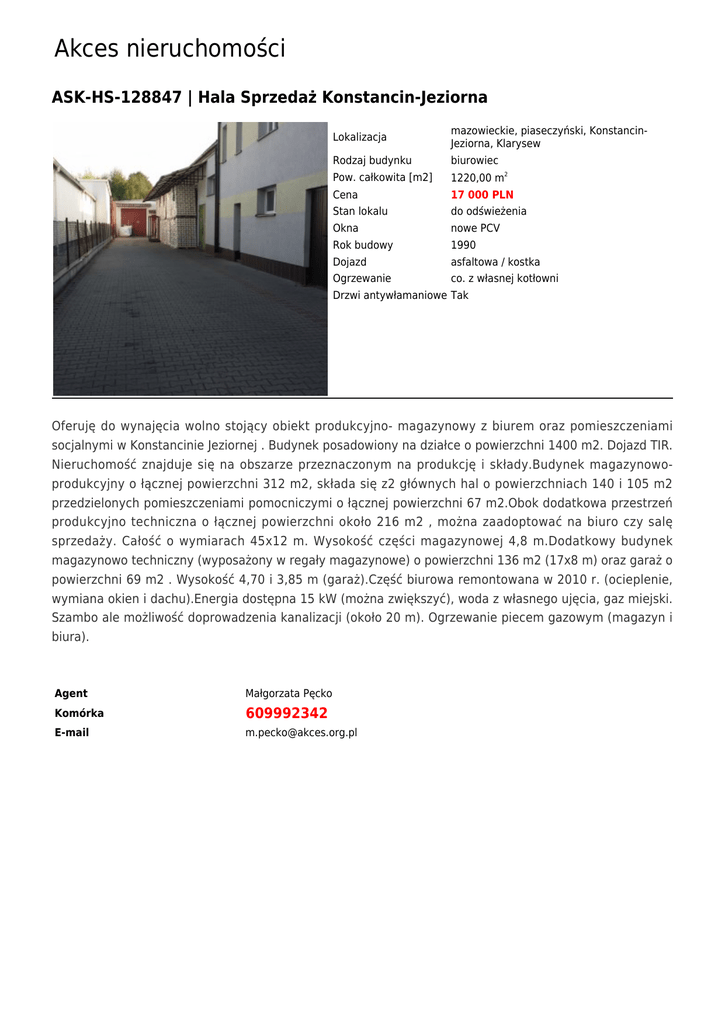 Akces nieruchomości ASK-HS-128847 | Hala Sprzedaż Konstancin-Jeziorna Lokalizacja mazowieckie, piaseczyński, KonstancinJeziorna, Klarysew Rodzaj budynku biurowiec Pow. całkowita [m2] 1220,00 m2 Cena 17 000 PLN Stan lokalu do odświeżenia Okna nowe PCV Rok budowy 1990 Dojazd asfaltowa / kostka Ogrzewanie co. z własnej kotłowni Drzwi antywłamaniowe Tak Oferuję do wynajęcia wolno stojący obiekt produkcyjno- magazynowy z biurem oraz pomieszczeniami socjalnymi w Konstancinie Jeziornej . Budynek posadowiony na działce o powierzchni 1400 m2. Dojazd TIR. Nieruchomość znajduje się na obszarze przeznaczonym na produkcję i składy.Budynek magazynowoprodukcyjny o łącznej powierzchni 312 m2, składa się z2 głównych hal o powierzchniach 140 i 105 m2 przedzielonych pomieszczeniami pomocniczymi o łącznej powierzchni 67 m2.Obok dodatkowa przestrzeń produkcyjno techniczna o łącznej powierzchni około 216 m2 , można zaadoptować na biuro czy salę sprzedaży. Całość o wymiarach 45x12 m. Wysokość części magazynowej 4,8 m.Dodatkowy budynek magazynowo techniczny (wyposażony w regały magazynowe) o powierzchni 136 m2 (17x8 m) oraz garaż o powierzchni 69 m2 . Wysokość 4,70 i 3,85 m (garaż).Część biurowa remontowana w 2010 r. (ocieplenie, wymiana okien i dachu).Energia dostępna 15 kW (można zwiększyć), woda z własnego ujęcia, gaz miejski. Szambo ale możliwość doprowadzenia kanalizacji (około 20 m). Ogrzewanie piecem gazowym (magazyn i biura). Agent Małgorzata Pęcko Komórka 609992342 E-mail [email protected]