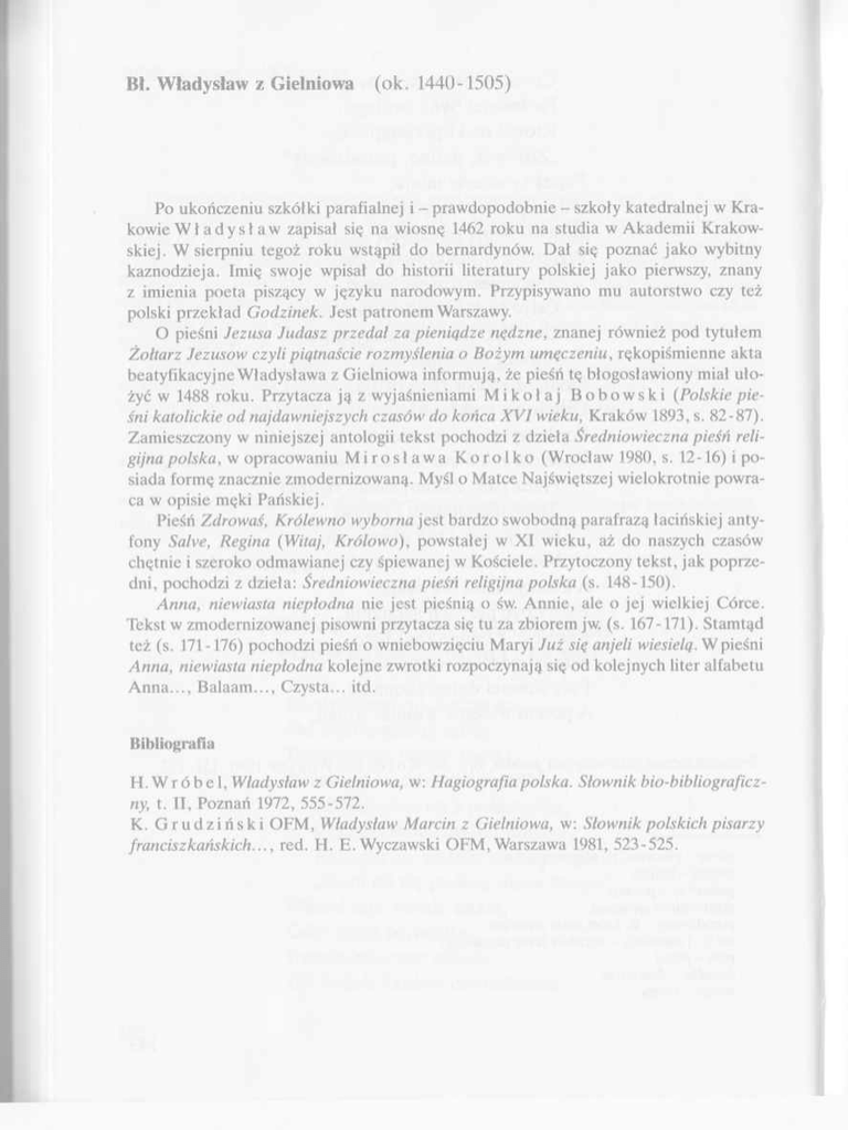 Bł. Władysław z Gielniowa (ok. 1440-1505) Po ukończeniu szkółki parafialnej i – prawdopodobnie – szkoły katedralnej w Kra kowie W ł a d y s ł a w zapisał się na wiosnę 1462 roku na studia w Akademii Krakow skiej. W sierpniu tegoż roku wstąpił do bernardynów. Dał się poznać jako wybitny kaznodzieja. Imię swoje wpisał do historii literatury polskiej jako pierwszy, znany z imienia poeta piszący w języku narodowym. Przypisywano mu autorstwo czy też polski przekład Godzinek. Jest patronem Warszawy. O pieśni Jezusa Judasz przedał za pieniądze nędzne, znanej również pod tytułem Żołtarz Jezusów czyli piątnaście rozmyślenia o Bożym umęczeniu, rękopiśmienne akta beatyfikacyjne Władysława z Gielniowa informują, że pieśń tę błogosławiony miał uło żyć w 1488 roku. Przytacza ją z wyjaśnieniami M i k o ł a j B o b o w s k i (Polskie pie śni katolickie od najdawniejszych czasów do końca X V I wieku, Kraków 1893, s. 82-87). Zamieszczony w niniejszej antologii tekst pochodzi z dzieła Średniowieczna pieśń reli gijna polska, w opracowaniu M i r o s ł a w a K o r o l k o (Wrocław 1980, s. 12-16) i po siada formę znacznie zmodernizowaną. Myśl o Matce Najświętszej wielokrotnie powra ca w opisie męki Pańskiej. Pieśń Zdrowaś, Królewno wyborna jest bardzo swobodną parafrazą łacińskiej anty fony Salve, Regina (Witaj, Królowo), powstałej w XI wieku, aż do naszych czasów chętnie i szeroko odmawianej czy śpiewanej w Kościele. Przytoczony tekst, jak poprze dni, pochodzi z dzieła: Średniowieczna pieśń religijna polska (s. 148-150). Anna, niewiasta niepłodna nie jest pieśnią o św. Annie, ale o jej wielkiej Córce. Tekst w zmodernizowanej pisowni przytacza się tu za zbiorem jw. (s. 167-171). Stamtąd też (s. 171-176) pochodzi pieśń o wniebowzięciu Maryi Już się anjeli wiesielą. W pieśni Anna, niewiasta niepłodna kolejne zwrotki rozpoczynają się od kolejnych liter alfabetu A nna…, Balaam…, Czysta… itd. Bibliografia H. W r ó b e 1, Władysław z Gielniowa, w: Hagiografia polska. Słownik bio-bibliograficz ny, t. II, Poznań 1972, 555-572. K. G r u d z i ń s k i OFM, Władysław Marcin z Gielniowa, w: Słownik polskich pisarzy franciszkańskich… , red. H. E. Wyczawski OFM,Warszawa 1981, 523-525. JEZUSA JUDASZ PRZEDAŁ ZA PIENIĄDZE NĘDZNE Jezusa Judasz przedał za pieniądze nędzne, Bog Ociec Syna wydal na zbawienie duszne; Jezus kiedy wieczerzał, swe ciało rozdawał, Apostoły swe smętne swoją krwią napawał. Jezus w ogrodek wstąpił ‹z› swymi miłosniki, Trzykroć sie Oćcu modlił za wszytki grzeszniki; Krwawy pot s niego płynął dla boju silnego, Duszo miła, oglądaj miłośnika twego. Jezusa miłosnego gdy Żydowie jęli, Baranka niewinnego rwali i targali; Opak ręce związali Panu niebieskiemu, Pędem rychłym bieżeli do miasta świątego. Jezus jest policzek wziął u Annasza wielki, Do Kaifasza posłań, a tamo jest uplwan; Oczy mu zawiązali Żydowie okrutni, Poszyjki mu dawali, w lice jego bili. Jezus staroście wydań, łajncuchem swiązany, Piłat Żydów jest pytał, które jego winy. Widząc jego przez winy, do Heroda posiał, Żydowie go soczyli, ale Jezus milczał. duszny – dotyczący duszy w ogrodek – do ogrodu, tj. do Ogrójca miłosniki – tu: wyznawcy, miłujący Chrystusa boj – lęk miłosnego – umiłowanego jęli – tj. schwytali opak – z tyłu miasta świątego – świętego miasta, czyli Jerozolimy poszyjki – uderzenia w szyję przez – bez soczyć – fałszywie oskarżać, potwarzać 151 Jezus swleczon z odzienia, u słupa uwiązan, A tak przez miłosierdzia okrutnie biczowan; Krew z ciała jest płynęła, Pan niebieski zranion, O duszo moja, patrzy, płaczy rzewno, wzdychaj. Jezus gdy ubiczowan, na stolcu posadzon, Cirnim jest koronowan, a przeto jest wzgardzon; Przed Jezusem klękali rycerze niewierni, S niego sie naśmiewali, na oblicze plwali. Jezus potem osądzon, Piłat jego sądził, Od Żydów jest nawi‹e›dzon, a w tym Piłat zgrzeszył; Maryja, Matka Boża, tedy sie smąciła, Wzdychała a płakała i wszytka semglała. Jezus s miasta wywiedzion, krzyżem uciążony, A łotrom jest przyłączon, jak robak wzgardzony; Matka mu zabieżała, chcąc jego oględać, A gdy jego uźrzała, jęła rzewno płakać. Jezusa już krzyżują, patrzy, duszo, pilnie, Ręce i nogi ranią, krew s ran jego płynie; Matka gdy to widziała, na ziemię upadła, Dla Synaczka miłego rada by umarła. Jezus z krzyżem podniesion, patrzcie, krześcijani, Miedzy łotry postawion, drogą krwią skropion‹y› Od Żydów jest pośmiewan, gdy na krzyżu wisiał, Jezus, miłosierny Pan, wszytko skromnie cirpiał. patrzy – patrz placzy – płacz stolec – tron od Żydów jest nawi‹e›dzon – przez Żydów został namówiony smącić – smucić semgleć – zasłabnąć jest pośmiewan – był wyśmiewany skromnie – pokornie 152 Jezus Oćcu sie modlił za swe krzyżowniki, Smętną Matkę ucieszył, łotra i grzeszniki; „Pragnę grzesznych zbawienia, duszo moja miła, Już Oćcu polecaję”, wołał wszytką siłą. Jezusa umarłego stworzenie płakało, Pana swego miłego barzo żałowało; Słojnce sie zacimiło, ziemia barzo drżała, Opoki się ściepały, groby otwarzały. Jezusowa Matuchna gdy u krzyża stała, Bok jego włocznią zbodzion i wielko otworzon; Krew i woda płynęła z boku naświętszego Matuchna jego miła żałowała tego. Jezus z krzyża sejmowan w nieszporną godzinę, Maryja piastowała ciało swego Syna; Ciało maścią mazali Jozef z Nikodemem, W prześciradło uwili, potem w grob włożyli. Jezusow żołtarz czcicie i często śpiewajcie, Maryję pozdrawiajcie, k tej sie uciekajcie; Maryja, przez boleści, które jeś cirpiała, Oddal od nas złości, daj wieczne radości. Trzykroć pięćdziesiąt mowcie: „Zdrowa bądź, Maryja”, A jeden pacierz pojcie za kożdym dziesiątkiem: Piętnaście rozmyślenia w Bożym 