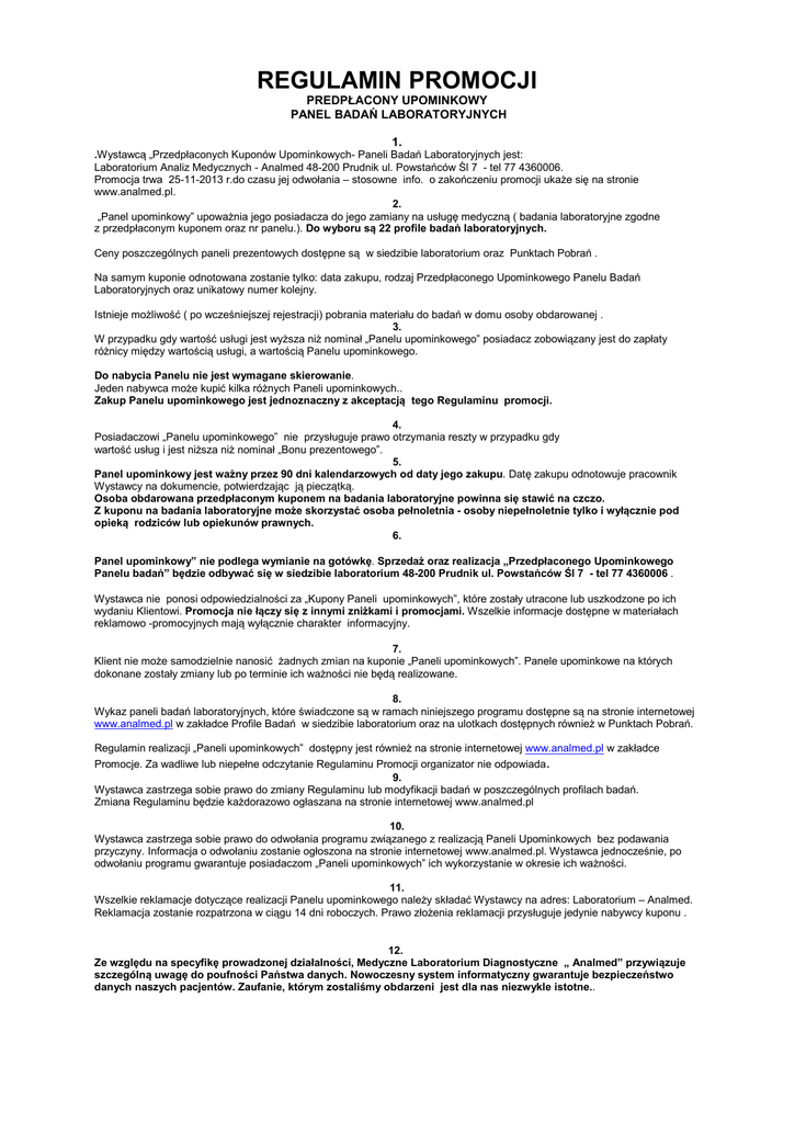 REGULAMIN PROMOCJI PREDPŁACONY UPOMINKOWY PANEL BADAŃ LABORATORYJNYCH 1. .Wystawcą „Przedpłaconych Kuponów Upominkowych- Paneli Badań Laboratoryjnych jest: Laboratorium Analiz Medycznych - Analmed 48-200 Prudnik ul. Powstańców Śl 7 - tel 77 4360006. Promocja trwa 25-11-2013 r.do czasu jej odwołania – stosowne info. o zakończeniu promocji ukaże się na stronie www.analmed.pl. 2. „Panel upominkowy” upoważnia jego posiadacza do jego zamiany na usługę medyczną ( badania laboratoryjne zgodne z przedpłaconym kuponem oraz nr panelu.). Do wyboru są 22 profile badań laboratoryjnych. Ceny poszczególnych paneli prezentowych dostępne są w siedzibie laboratorium oraz Punktach Pobrań . Na samym kuponie odnotowana zostanie tylko: data zakupu, rodzaj Przedpłaconego Upominkowego Panelu Badań Laboratoryjnych oraz unikatowy numer kolejny. Istnieje możliwość ( po wcześniejszej rejestracji) pobrania materiału do badań w domu osoby obdarowanej . 3. W przypadku gdy wartość usługi jest wyższa niż nominał „Panelu upominkowego” posiadacz zobowiązany jest do zapłaty różnicy między wartością usługi, a wartością Panelu upominkowego. Do nabycia Panelu nie jest wymagane skierowanie. Jeden nabywca może kupić kilka różnych Paneli upominkowych.. Zakup Panelu upominkowego jest jednoznaczny z akceptacją tego Regulaminu promocji. 4. Posiadaczowi „Panelu upominkowego” nie przysługuje prawo otrzymania reszty w przypadku gdy wartość usług i jest niższa niż nominał „Bonu prezentowego”. 5. Panel upominkowy jest ważny przez 90 dni kalendarzowych od daty jego zakupu. Datę zakupu odnotowuje pracownik Wystawcy na dokumencie, potwierdzając ją pieczątką. Osoba obdarowana przedpłaconym kuponem na badania laboratoryjne powinna się stawić na czczo. Z kuponu na badania laboratoryjne może skorzystać osoba pełnoletnia - osoby niepełnoletnie tylko i wyłącznie pod opieką rodziców lub opiekunów prawnych. 6. Panel upominkowy” nie podlega wymianie na gotówkę. Sprzedaż oraz realizacja „Przedpłaconego Upominkowego Panelu badań” będzie odbywać się w siedzibie laboratorium 48-200 Prudnik ul. Powstańców Śl 7 - tel 77 4360006 . Wystawca nie ponosi odpowiedzialności za „Kupony Paneli upominkowych”, które zostały utracone lub uszkodzone po ich wydaniu Klientowi. Promocja nie łączy się z innymi zniżkami i promocjami. Wszelkie informacje dostępne w materiałach reklamowo -promocyjnych mają wyłącznie charakter informacyjny. 7. Klient nie może samodzielnie nanosić żadnych zmian na kuponie „Paneli upominkowych”. Panele upominkowe na których dokonane zostały zmiany lub po terminie ich ważności nie będą realizowane. 8. Wykaz paneli badań laboratoryjnych, które świadczone są w ramach niniejszego programu dostępne są na stronie internetowej www.analmed.pl w zakładce Profile Badań w siedzibie laboratorium oraz na ulotkach dostępnych również w Punktach Pobrań. Regulamin realizacji „Paneli upominkowych” dostępny jest również na stronie internetowej www.analmed.pl w zakładce Promocje. Za wadliwe lub niepełne odczytanie Regulaminu Promocji organizator nie odpowiada. 9. Wystawca zastrzega sobie prawo do zmiany Regulaminu lub modyfikacji badań w poszczególnych profilach badań. Zmiana Regulaminu będzie każdorazowo ogłaszana na stronie internetowej www.analmed.pl 10. Wystawca zastrzega sobie prawo do odwołania programu związanego z realizacją Paneli Upominkowych bez podawania przyczyny. Informacja o odwołaniu zostanie ogłoszona na stronie internetowej www.analmed.pl. Wystawca jednocześnie, po odwołaniu programu gwarantuje posiadaczom „Paneli upominkowych” ich wykorzystanie w okresie ich ważności. 11. Wszelkie reklamacje dotyczące realizacji Panelu upominkowego należy składać Wystawcy na adres: Laboratorium – Analmed. Reklamacja zostanie rozpatrzona w ciągu 14 dni roboczych. Prawo złożenia reklamacji przysługuje jedynie nabywcy kuponu . 12. Ze względu na specyfikę prowadzonej działalności, Medyczne Laboratorium Diagnostyczne „ Analmed” przywiązuje szczególną uwagę do poufności Państwa danych. Nowoczesny system informatyczny gwarantuje bezpieczeństwo danych naszych pacjentów. Zaufanie, którym zostaliśmy obdarzeni jest dla nas niezwykle istotne..
