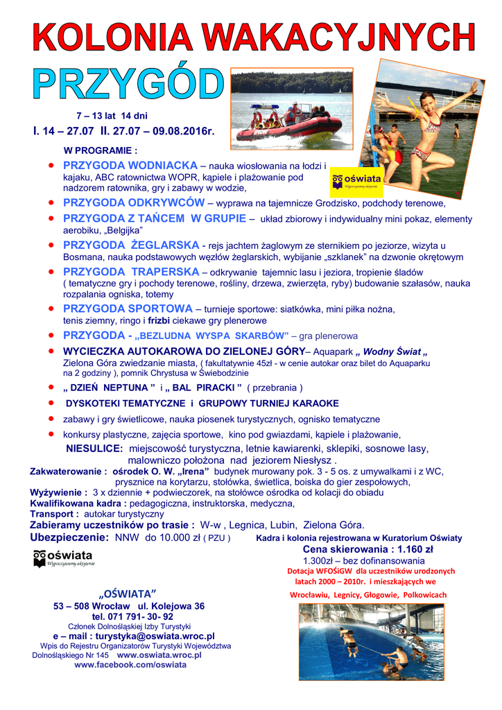 7 – 13 lat 14 dni I. 14 – 27.07 II. 27.07 – 09.08.2016r. W PROGRAMIE : PRZYGODA WODNIACKA – nauka wiosłowania na łodzi i kajaku, ABC ratownictwa WOPR, kąpiele i plażowanie pod nadzorem ratownika, gry i zabawy w wodzie, PRZYGODA ODKRYWCÓW – wyprawa na tajemnicze Grodzisko, podchody terenowe, PRZYGODA Z TAŃCEM W GRUPIE – układ zbiorowy i indywidualny mini pokaz, elementy aerobiku, „Belgijka” PRZYGODA ŻEGLARSKA - rejs jachtem żaglowym ze sternikiem po jeziorze, wizyta u Bosmana, nauka podstawowych węzłów żeglarskich, wybijanie „szklanek” na dzwonie okrętowym PRZYGODA TRAPERSKA – odkrywanie tajemnic lasu i jeziora, tropienie śladów ( tematyczne gry i pochody terenowe, rośliny, drzewa, zwierzęta, ryby) budowanie szałasów, nauka rozpalania ogniska, totemy PRZYGODA SPORTOWA – turnieje sportowe: siatkówka, mini piłka nożna, tenis ziemny, ringo i frizbi ciekawe gry plenerowe PRZYGODA - „BEZLUDNA WYSPA SKARBÓW” – gra plenerowa WYCIECZKA AUTOKAROWA DO ZIELONEJ GÓRY– Aquapark „ Wodny Świat „ Zielona Góra zwiedzanie miasta, ( fakultatywnie 45zł - w cenie autokar oraz bilet do Aquaparku na 2 godziny ), pomnik Chrystusa w Świebodzinie „ DZIEŃ NEPTUNA ” i „ BAL PIRACKI ” ( przebrania ) DYSKOTEKI TEMATYCZNE i GRUPOWY TURNIEJ KARAOKE zabawy i gry świetlicowe, nauka piosenek turystycznych, ognisko tematyczne konkursy plastyczne, zajęcia sportowe, kino pod gwiazdami, kąpiele i plażowanie, NIESULICE: miejscowość turystyczna, letnie kawiarenki, sklepiki, sosnowe lasy, malowniczo położona nad jeziorem Niesłysz . Zakwaterowanie : ośrodek O. W. „Irena” budynek murowany pok. 3 - 5 os. z umywalkami i z WC, prysznice na korytarzu, stołówka, świetlica, boiska do gier zespołowych, Wyżywienie : 3 x dziennie + podwieczorek, na stołówce ośrodka od kolacji do obiadu Kwalifikowana kadra : pedagogiczna, instruktorska, medyczna, Transport : autokar turystyczny Zabieramy uczestników po trasie : W-w , Legnica, Lubin, Zielona Góra. Ubezpieczenie: NNW do 10.000 zł ( PZU ) Kadra i kolonia rejestrowana w Kuratorium Oświaty Cena skierowania : 1.160 zł 1.300zł – bez dofinansowania Dotacja WFOŚiGW dla uczestników urodzonych latach 2000 – 2010r. i mieszkających we „OŚWIATA” 53 – 508 Wrocław ul. Kolejowa 36 tel. 071 791- 30- 92 Członek Dolnośląskiej Izby Turystyki e – mail : [email protected] Wpis do Rejestru Organizatorów Turystyki Województwa Dolnośląskiego Nr 145 www.oswiata.wroc.pl www.facebook.com/oswiata Wrocławiu, Legnicy, Głogowie, Polkowicach KOLONIA Niesulice 2016 „ AKADEMIA WAKACYJNYCH PRZYGÓD ” NIESULICE : 12 km od Świebodzina, 40 km od Zielonej Góry, bardzo czyste, malowniczo położone jezioro Niesłysz – 550 ha powierzchni, I klasa czystości wody, sosnowe lasy, ośrodki wczasowe, sklepiki, punkty małej gastronomii itp. Zabieramy ze sobą : kieszonkowe na własne potrzeby – pieniądze można zdeponować u wychowawców ( koperta podpisana imieniem i nazwiskiem dziecka z kwotą podzieloną na mniejsze nominały np. po 10 , 20 zł ), legitymację szkolną, ubranie od wiatru , sweter lub polar, ubranie i obuwie sportowe, strój do zajęć sportowych, czapeczka z daszkiem od słońca, krem z filtrem UV, kosmetyki, stroje i ręczniki kąpielowe, ulubione nagrania, śpiewniki, latarkę , dobry humor :-) , Prosimy o zaopatrzenie uczestników : w podstawowe leki ( od przeziębienia, ból gardła, uczulenia, środki na oparzenia słoneczne, witaminy ) Koszty leków specjalistycznych, antybiotyków, witamin itp. pokrywa uczestnik we własnym zakresie. UWAGA ! - drogocenne rzeczy zostawiamy w domu ! Dodatkowe informacje : Edward Bieleńko tel. 601 641 523 PRZYPOMINAMY O MOŻLIWOŚCI WYKUPIENIA POLISY UBEZPIECZENIOWEJ OD KOSZTÓW REZYGNACJI Z UDZIAŁU W IMPREZIE TURYSTYCZNEJ. TRANSPORT: wyjazd pierwszego dnia turnusu, powrót ostatniego dnia turnusu ZBIÓRKA wyjazd : Wrocław ul. Petrusewicza godz. 09.15, Legnica ul. Nowodworska stacja paliw LOTOS godz. 10.30, Lubin PKS stadion godz.11.00, Zielona Góra ul. Sulechowska Stacja Paliw ORLEN godz. 13.00, Niesulice godz. 14.00 Planowany powrót : Zielona G. godz. 16.00, Lubin godz.18.00, Legnica 18.30, W – w godz. 20.00. Zakup skierowania : telefonicznie, e- mailem lub w biurze w godz. 10 – 17.00, wpłata zaliczki na konto 200 zł Pozostała należność : do 12 dni przed rozpoczęciem turnusu. PŁATNOŚĆ na konto z dopiskiem KOLONIA PRZYGODY NIESULICE TURNUS .... IMIĘ I NAZWISKO....: „Oświata” Spółdzielnia Pracy 53 – 508 Wrocław ul. Kolejowa 36 BZ WBK S.A. I O / Wrocław 59 1090 2398 0000 0006 0800 0825 Faktury wystawiamy na instytucje lub osoby wpłacające