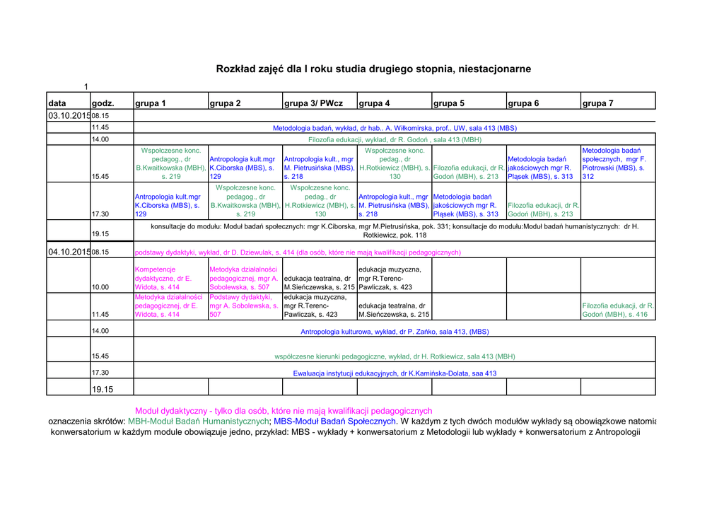 Rozkład zajęć dla I roku studia drugiego stopnia, niestacjonarne 1 data godz. 03.10.2015 08.15 grupa 1 11.45 grupa 2 grupa 3/ PWcz 15.45 17.30 Antropologia kult.mgr K.Ciborska (MBS), s. 129 10.00 11.45 grupa 6 grupa 7 Filozofia edukacji, wykład, dr R. Godoń , sala 413 (MBH) Wspołczesne konc. pedagog., dr Antropologia kult.mgr B.Kwaitkowska (MBH), K.Ciborska (MBS), s. s. 219 129 04.10.2015 08.15 grupa 5 Metodologia badań, wykład, dr hab.. A. Wiłkomirska, prof.. UW, sala 413 (MBS) 14.00 19.15 grupa 4 Wspołczesne konc. pedag., dr Antropologia kult., mgr Metodologia badań M. Pietrusińska (MBS), H.Rotkiewicz (MBH), s. Filozofia edukacji, dr R. jakościowych mgr R. s. 218 130 Godoń (MBH), s. 213 Pląsek (MBS), s. 313 Wspołczesne konc. Wspołczesne konc. pedagog., dr pedag., dr Antropologia kult., mgr Metodologia badań B.Kwaitkowska (MBH), H.Rotkiewicz (MBH), s. M. Pietrusińska (MBS), jakościowych mgr R. s. 219 130 s. 218 Pląsek (MBS), s. 313 Metodologia badań społecznych, mgr F. Piotrowski (MBS), s. 312 Filozofia edukacji, dr R. Godoń (MBH), s. 213 konsultacje do modułu: Moduł badań społecznych: mgr K.Ciborska, mgr M.Pietrusińska, pok. 331; konsultacje do modułu:Moduł badań humanistycznych: dr H. Rotkiewicz, pok. 118 podstawy dydaktyki, wykład, dr D. Dziewulak, s. 414 (dla osób, które nie mają kwalifikacji pedagogicznych) Kompetencje dydaktyczne, dr E. Widota, s. 414 Metodyka działalności pedagogicznej, dr E. Widota, s. 414 Metodyka działalności pedagogicznej, mgr A. Sobolewska, s. 507 Podstawy dydaktyki, mgr A. Sobolewska, s. 507 edukacja teatralna, dr M.Sieńczewska, s. 215 edukacja muzyczna, mgr R.TerencPawliczak, s. 423 edukacja muzyczna, mgr R.TerencPawliczak, s. 423 edukacja teatralna, dr M.Sieńczewska, s. 215 14.00 Antropologia kulturowa, wykład, dr P. Zańko, sala 413, (MBS) 15.45 współczesne kierunki pedagogiczne, wykład, dr H. Rotkiewicz, sala 413 (MBH) 17.30 Ewaluacja instytucji edukacyjnych, dr K.Kamińska-Dolata, saa 413 Filozofia edukacji, dr R. Godoń (MBH), s. 416 19.15 Moduł dydaktyczny - tylko dla osób, które nie mają kwalifikacji pedagogicznych oznaczenia skrótów: MBH-Moduł Badań Humanistycznych; MBS-Moduł Badań Społecznych. W każdym z tych dwóch modułów wykłady są obowiązkowe natomiast konwersatorium w każdym module obowiązuje jedno, przykład: MBS - wykłady + konwersatorium z Metodologii lub wykłady + konwersatorium z Antropologii Rozkład zajęć dla I roku studia drugiego stopnia, niestacjonarne 2 data godz. grupa 1 grupa 2 grupa 3/ PWcz grupa 4 grupa 5 grupa 6 grupa 7 17.10.2015 08.15 10.00 seminarium magisterskie: dr hab. H.Depta, s.309, dr hab. A.Fijałkowski, s. 416, prof. G.Dryżałowska,s.218, dr hab. R.Godoń, 115, prof.M.Kolankiewicz,s.324, dr hab. A.Kowalewska, s. 213, prof. K.Lubomirska,s.129, prof.J.Półturzycki,s.421, prof.E.Skibińska,s.210, prof..A.Wiłkomirska, s.312,prof. M. Żytko, s.313, prof.A.Zielińska, s.130 11.45 Metodologia badań, wykład, dr hab.. A. Wiłkomirska, prof.. UW, sala 413 (MBS) 14.00 Filozofia edukacji, wykład, dr R. Godoń , sala 413 (MBH) 15.45 Wspołczesne konc. pedagog., dr Antropologia kult.mgr B.Kwaitkowska (MBH), K.Ciborska (MBS), s. s. 219 129 17.30 Antropologia kult.mgr K.Ciborska (MBS), s. 129 19.15 18.10.2015 08.15 10.00 11.45 Wspołczesne konc. pedag., dr Antropologia kult., mgr Metodologia badań M. Pietrusińska (MBS), H.Rotkiewicz (MBH), s. Filozofia edukacji, dr R. jakościowych mgr R. s. 218 130 Godoń (MBH), s. 213 Pląsek (MBS), s. 313 Wspołczesne konc. Wspołczesne konc. pedagog., dr Antropologia kult., mgr Metodologia badań pedag., dr B.Kwaitkowska (MBH), H.Rotkiewicz (MBH), s. M. Pietrusińska (MBS), jakościowych mgr R. s. 218 Pląsek (MBS), s. 313 s. 219 130 Filozofia edukacji, dr R. Godoń (MBH), s. 213 konsultacje do modułu: Moduł badań społecznych: mgr K.Ciborska, mgr M.Pietrusińska, pok. 331; konsultacje do modułu:Moduł badań humanistycznych: dr H. Rotkiewicz, pok. 118 podstawy dydaktyki, wykład, dr D. Dziewulak, s. 414 (dla osób, które nie mają kwalifikacji pedagogicznych) Kompetencje dydaktyczne, dr E. Widota, s. 414 Metodyka działalności pedagogicznej, dr E. Widota, s. 414 Metodyka działalności pedagogicznej, mgr A. Sobolewska, s. 507 Podstawy dydaktyki, mgr A. Sobolewska, s. 507 edukacja teatralna, dr M.Sieńczewska, s. 215 edukacja muzyczna, mgr R.TerencPawliczak, s. 423 edukacja muzyczna, mgr R.TerencPawliczak, s. 423 edukacja teatralna, dr M.Sieńczewska, s. 215 14.00 Antropologia kulturowa, wykład, dr P. Zańko, sala 413, (MBS) 15.45 współczesne kierunki pedagogiczne, wykład, dr H. Rotkiewicz, sala 413 (MBH) 17.30 Ewaluacja instytucji edukacyjnych, dr K.Kamińska-Dolata, saa 413 19.15 Metodologia badań społecznych, mgr F. Piotrowski (MBS), s. 312 Filozofia edukacji, dr R. Godoń (MBH), s. 416 Rozkład zajęć dla I roku studia drugiego stopnia, niestacjonarne 3 data godz. 07.11.2015 08.15 grupa 1 11.45 grupa 2 grupa 3/ PWcz 15.45 17.30 Antropologia kult.mgr K.Ciborska (MBS), s. 129 10.00 11.45 grupa 6 Wspołczesne konc. Antropologia kult., mgr pedag., dr Metodologia badań M. Pietrusińska (MBS), H.Rotkiewicz (MBH), s. Filozofia edukacji, dr R. jakościowych mgr R. s. 218 130 Godoń (MBH), s. 213 Pląsek (MBS), s. 313 Wspołczesne konc. Wspołczesne konc. pedagog., dr pedag., dr Antropologia kult., mgr Metodologia badań B.Kwaitkowska (MBH), H.Rotkiewicz (MBH), s. M. Pietrusińska (MBS), jakościowych mgr R. s. 219 130 s. 218 Pląsek (MBS), s. 313 Metodologia badań społecznych, mgr F. Piotrowski (MBS), s. 312 Filozofia edukacji, dr R. Godoń (MBH), s. 213 konsultacje do modułu: Moduł badań społecznych: mgr K.Ciborska, mgr M.Pietrusińska, pok. 331; konsultacje do modułu:Moduł badań humanistycznych: dr H. Rotkiewicz, pok. 118 podstawy dydaktyki, wykład, dr D. Dziewulak, s. 414 (dla osób, które nie mają kwalifikacji pedagogicznych) Kompetencje dydaktyczne, dr E. Widota, s. 414 Metodyka działalnośc